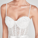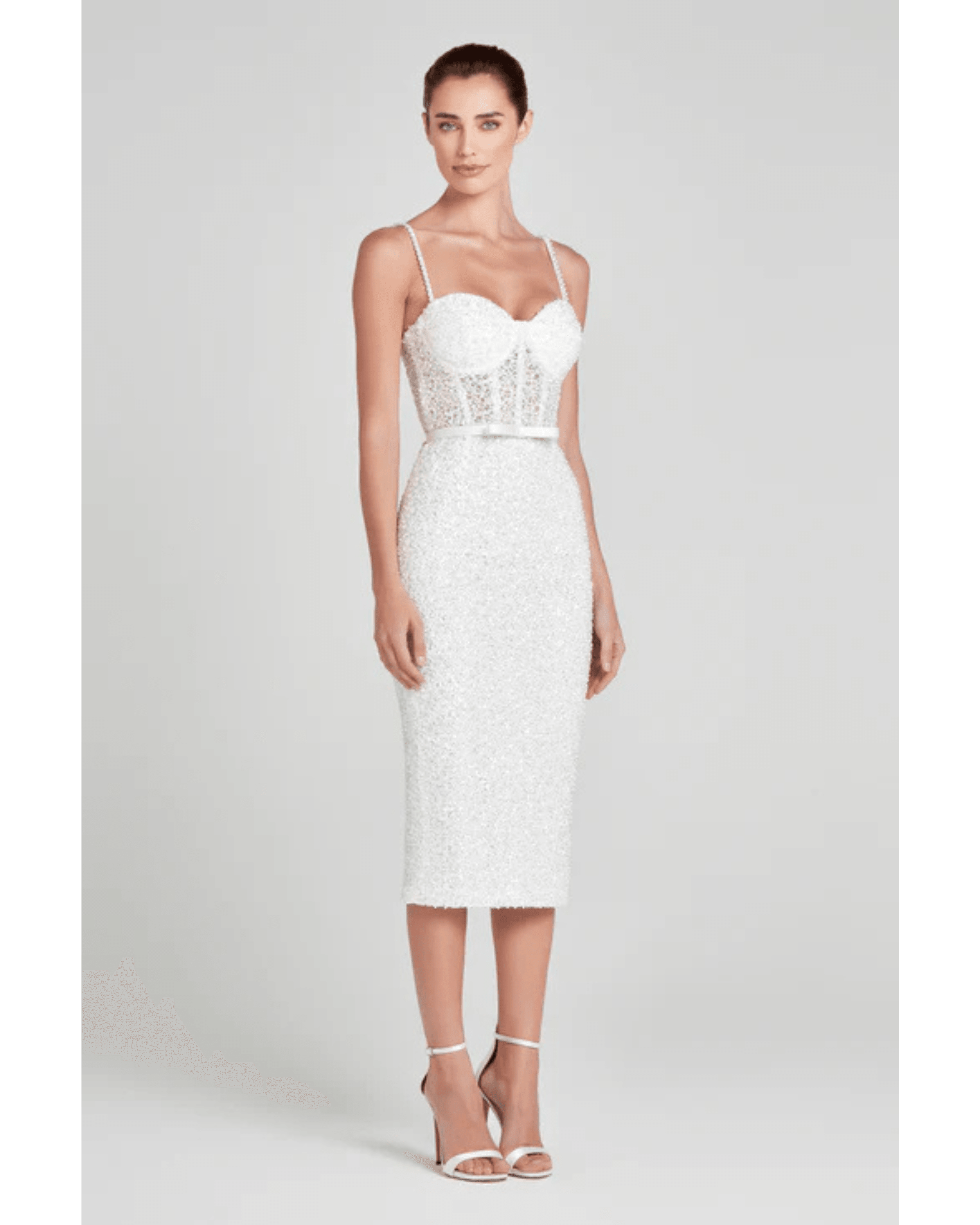 AMALIA is a corset style midi dress, crafted from pearl embellished white fabric. Featuring intricate bodice detailing, internal boning to the front, back, and sides, and matching detachable straps. Finished with a concealed zip to the centre back, and a detachable and adjustable white satin bow belt. Fully lined in mesh for a smooth fit.