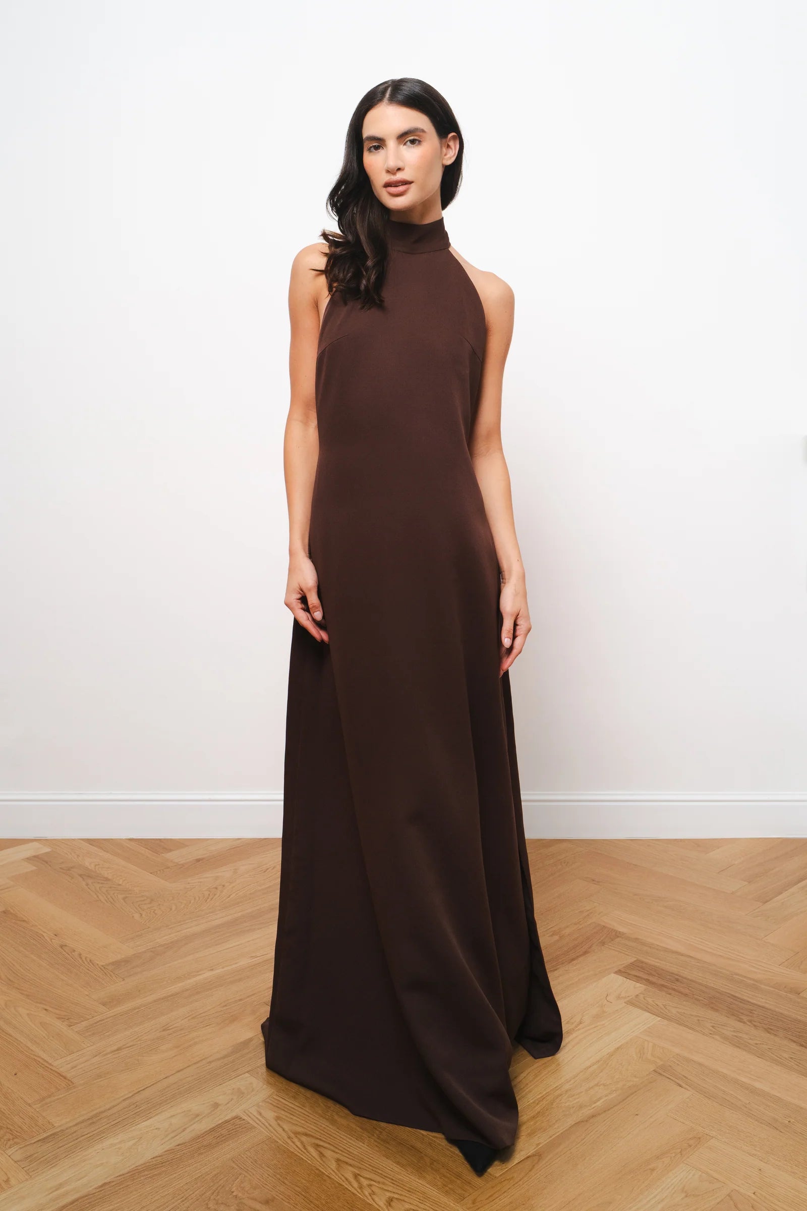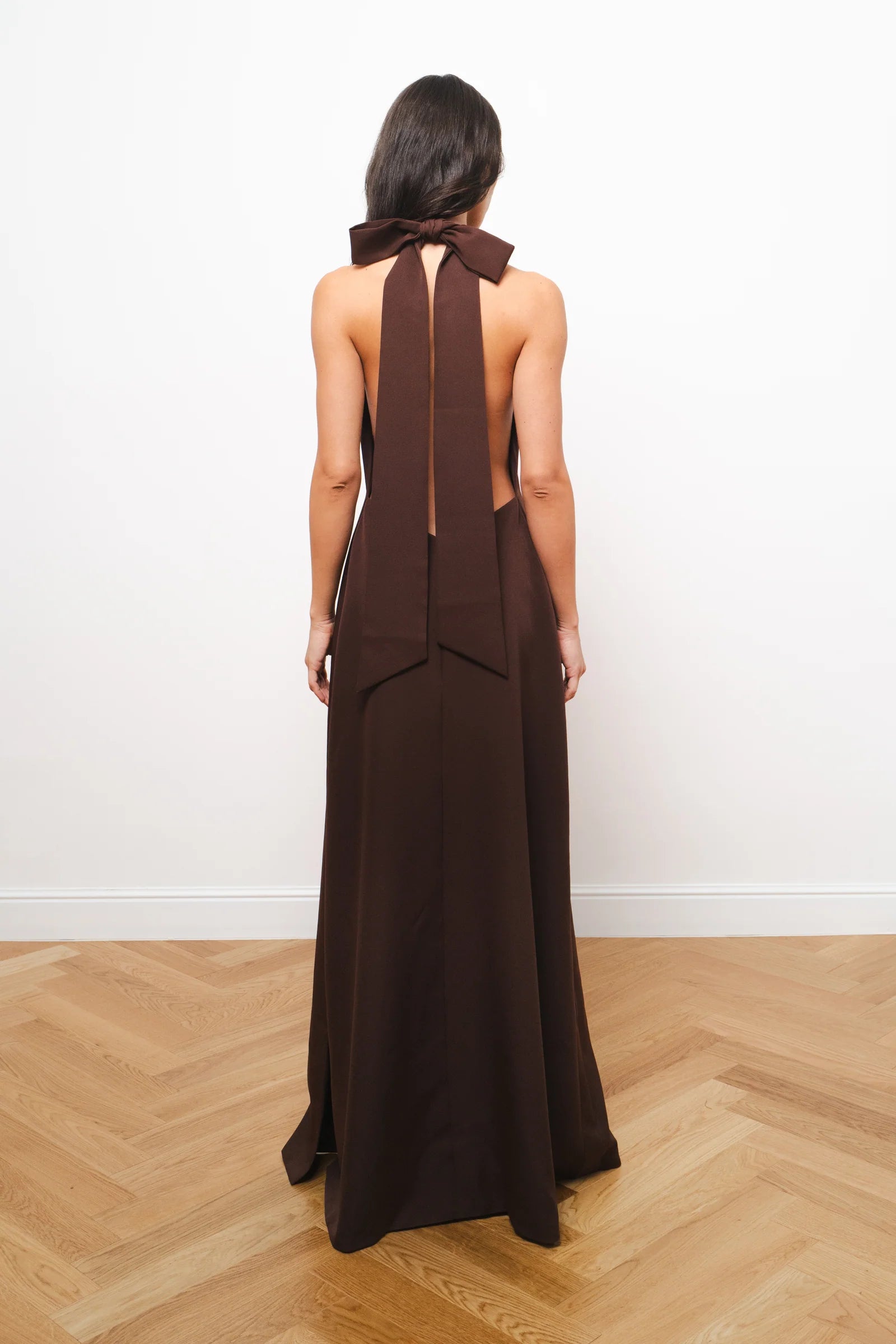 Make a statement in our Ava dress, a brown maxi dress designed with an open back detail, subtle side slit and halter neck design that ties into a soft, dramatic bow. The Ava dress offers ease without compromising on shape, it skims the body with a soft fit that flatters the waist while leaving room to move comfortably. Made from polyester and lined with 100% cotton, it holds its shape while allowing for ease and movement.