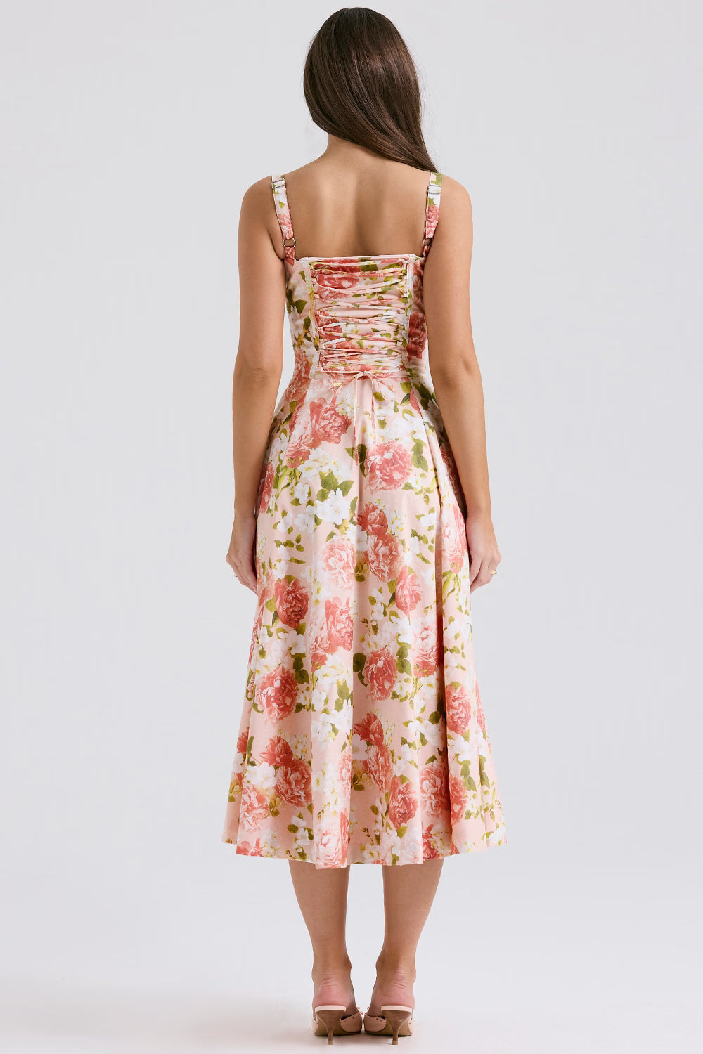 You'll feel ultra feminine in our 'Carmen' dress that's the perfect match for Spring and Summer garden parties. It's cut from stretch cotton in a gorgeous pink peony print and has a corseted bodice with a beautiful lace up back. The gathered bust has a drawstring tie and the side split adds a little sexiness to reveal a flash of leg.