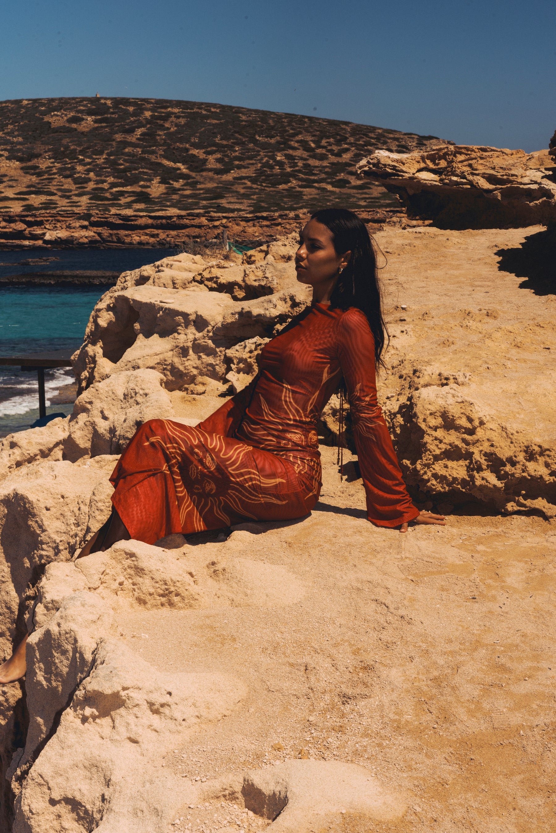 Featuring a a bold open back with tie fastening and luxury gold charm details, flared sleeve and in our signature mermaid maxi shape all perfectly completed with our Celeste print on the color of the season.