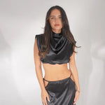 The co-ord of dreams! 'FAYE' this black satin two-piece features an adjustable tie-up at the waist skirt, cut-out hips, a thigh-to-floor leg slit and a delicate eyelash black edging.