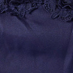 An elegant navy dress featuring a strapless neckline and delicate floral lace trim. Designed with a fitted silhouette and finished with an asymmetric hem and concealed zip fastening for a refined, modern look.