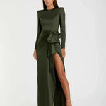 Long Sleeve Satin Structured Bow Draped Column Gown