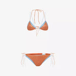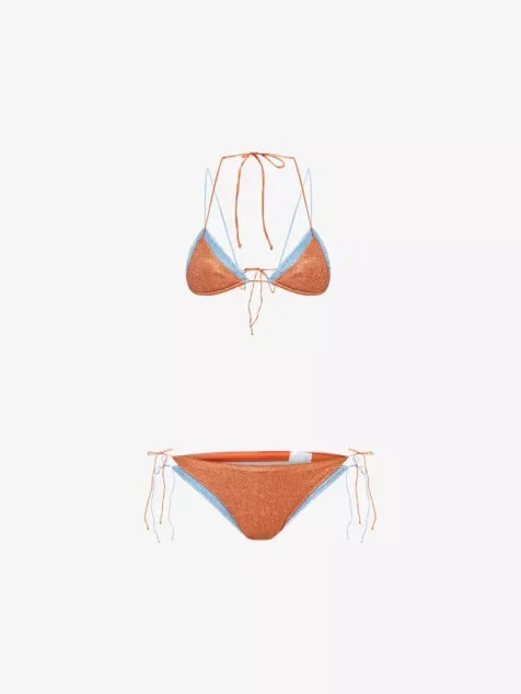 - Top: Triangle shape, self-tie straps, double layered design, bi-colour, shimmer metallic finish