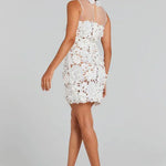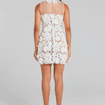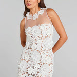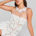 MILLIE is designed to be sheer. We recommend wearing a tonal nude slip or underwear underneath for extra coverage.From daytime dining to celebrations at sunset in MILLIE. A statement piece for an unforgettable moment. The sleeveless white high-neck 3D floral appliqu©d embellished mini dress features bespoke handcrafted lace appliqu©d flowers with hand sewn pearl detailing that cascade down the dress to create a delicate display of beauty and elegance. Featuring hand-cut appliqu©d flowers placed along the neckline, a keyhole button fastening behind the neck for support accompanied by a pearl button, and a sheer mesh yoke panel that separates the intricate floral neckline from the bust. The floral pattern continues down the bodice to the hem which is cut to shape. Finished with an invisible zipper for a sleek finish. - 3D floral appliqu©s