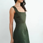 Our Monica Dress, a refined structured mini dress designed to flatter. With its tailored silhouette, it cinches the waist while allowing ease through the hips and thighs. The square neckline and fused bodice create clean lines and gentle shape, balanced by the soft A-line skirt. Crafted from smooth satin, this satin mini dress is fully lined in 100% cotton for lasting comfort and breathability.