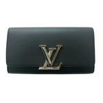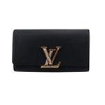 Elegance meets timeless luxury in the Louis Vuitton Pochette Louise. Crafted from smooth black leather, this sleek evening clutch features the iconic LV initials in a polished, gold-tone metal as the central focal point. The structured silhouette and refined flap closure make it a sophisticated choice for formal occasions or elevated everyday wear. With a compact yet practical interior, it offers enough space for essentials while maintaining an effortlessly chic appearance.