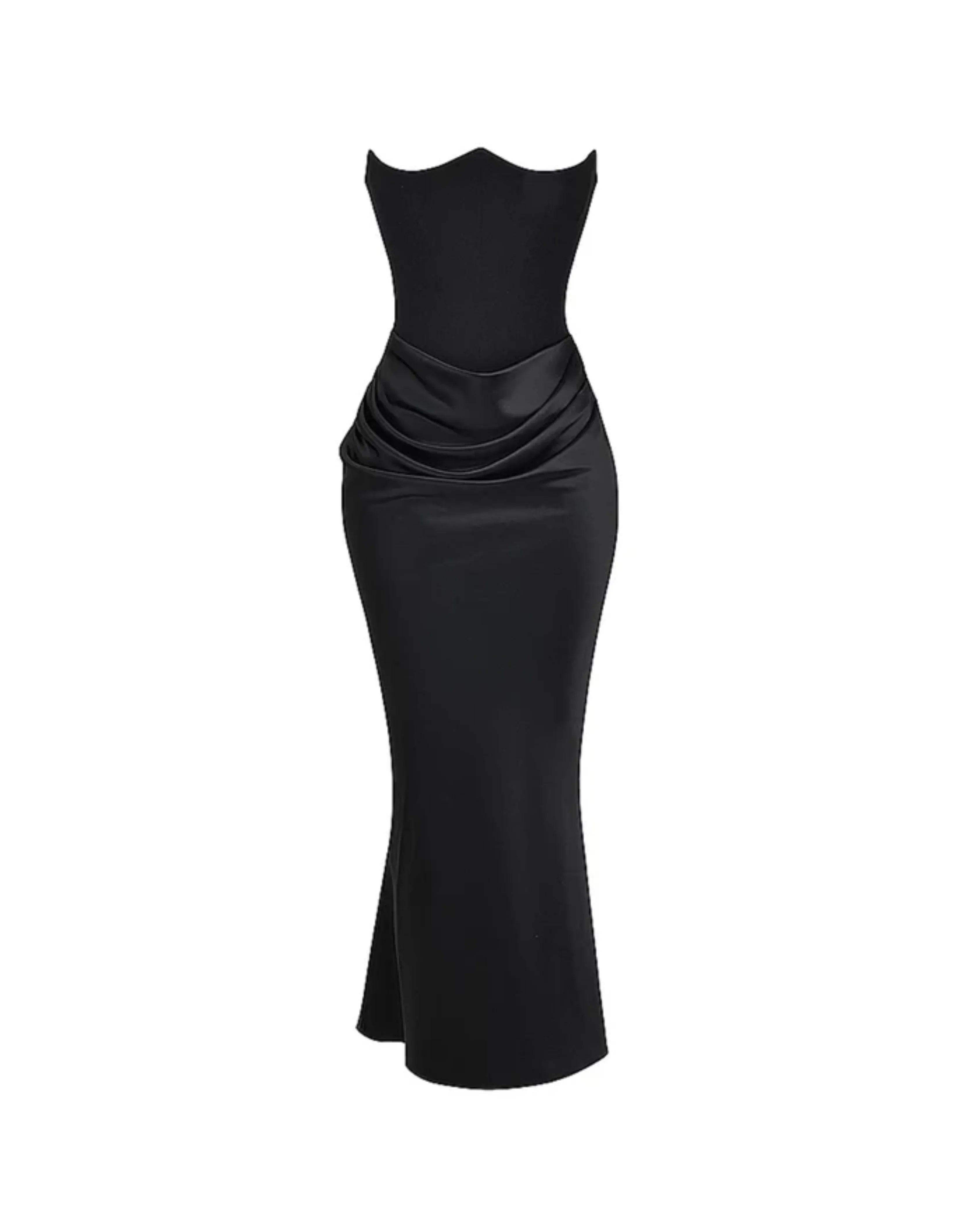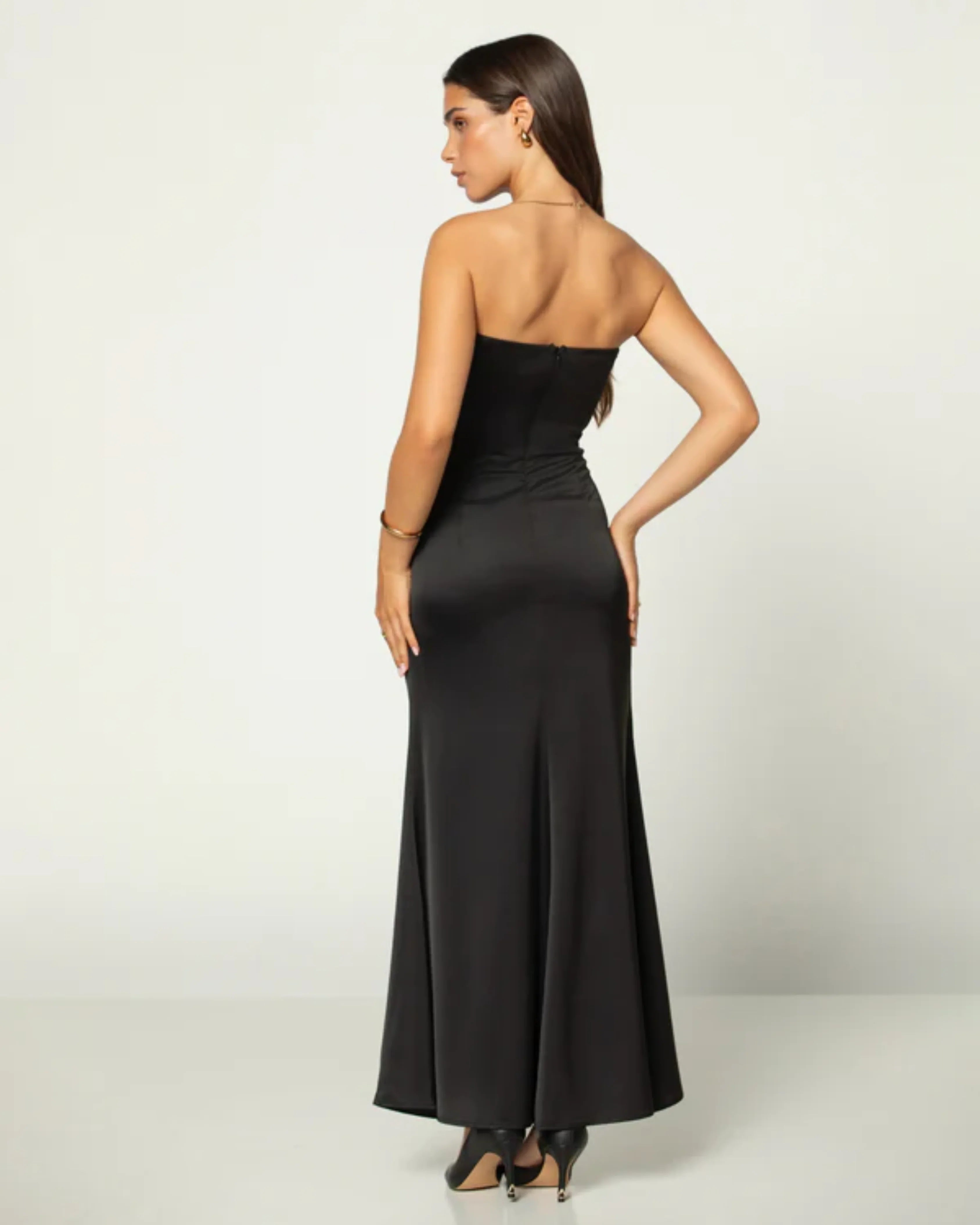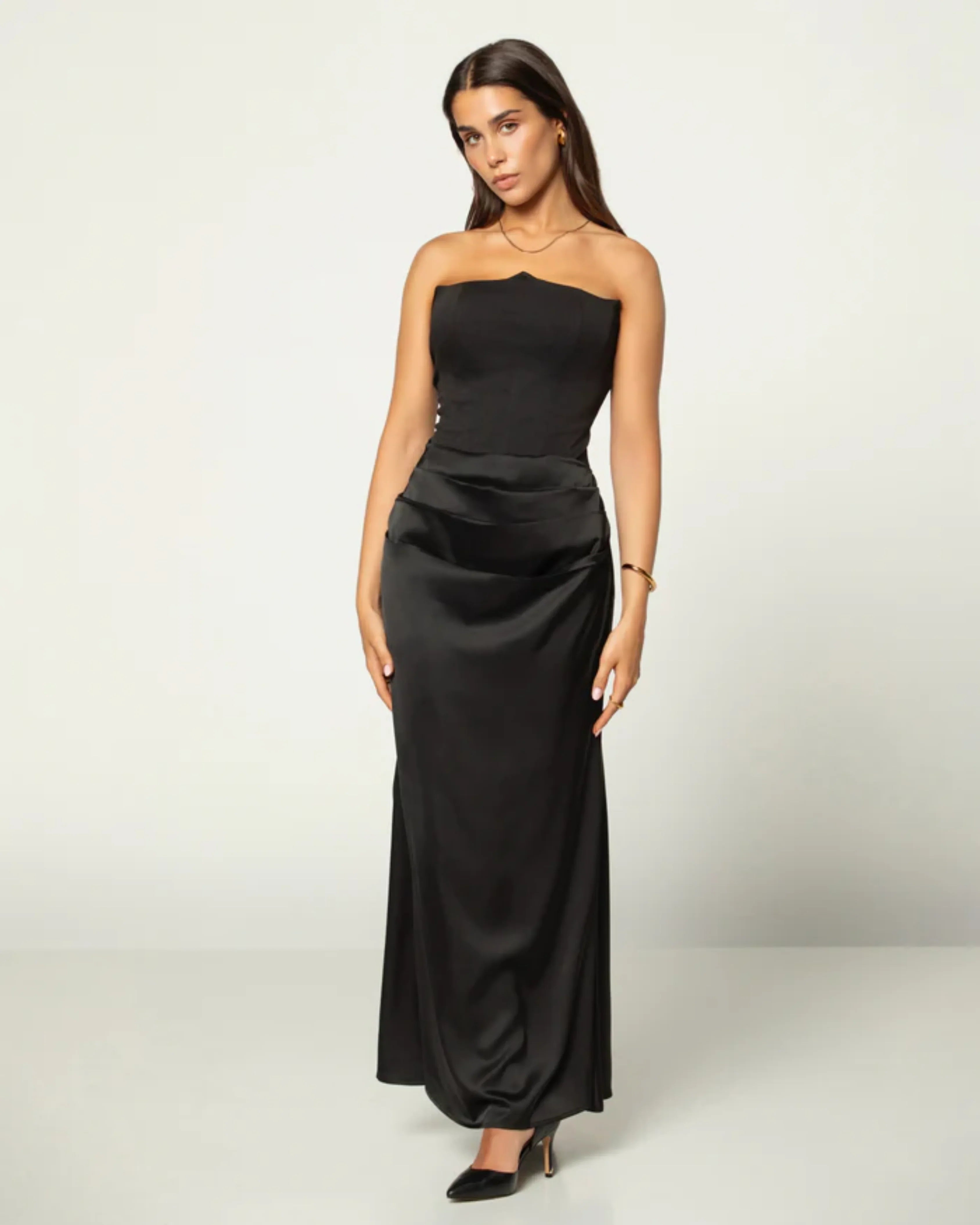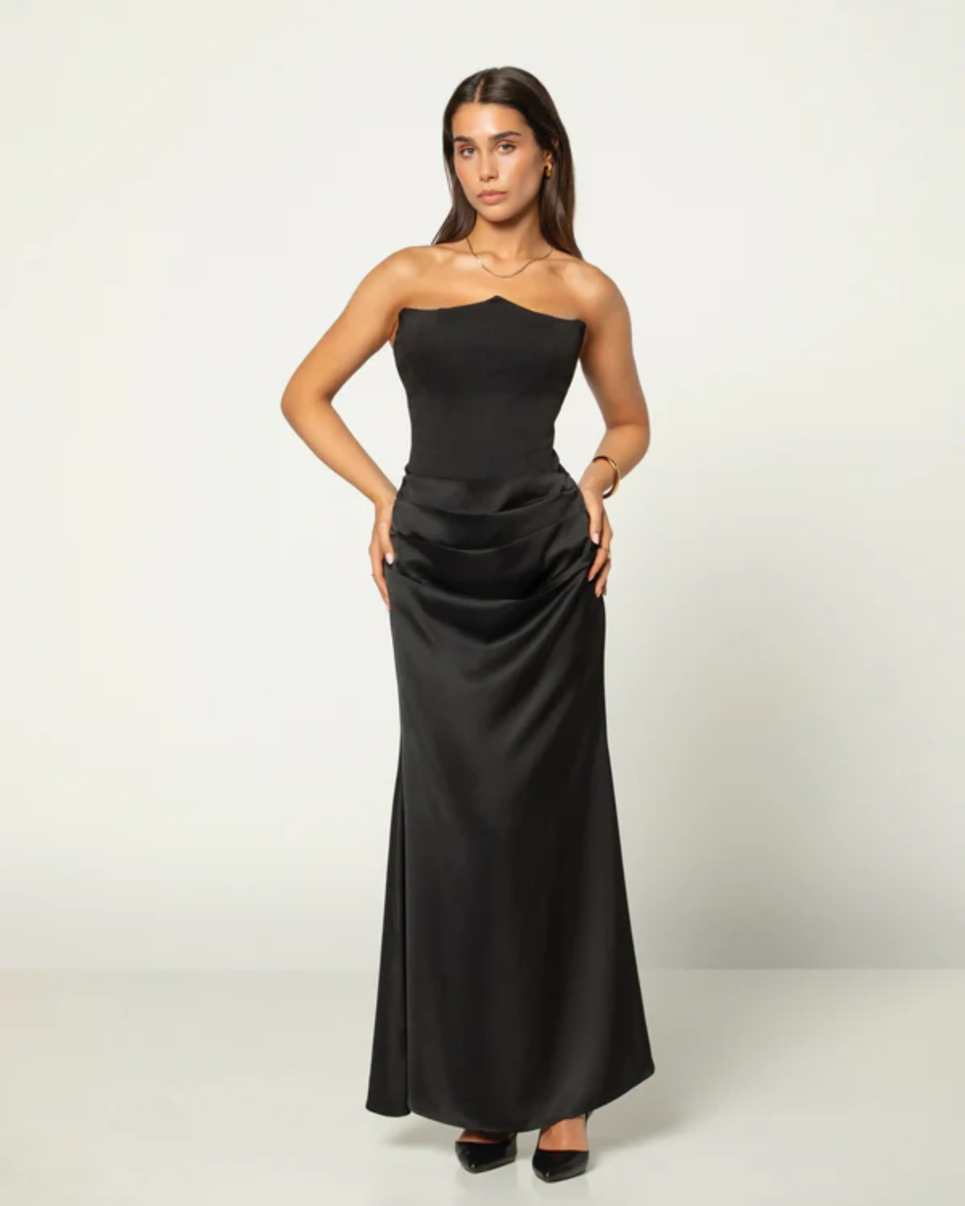 The 'Rosalind' is all out, divine feminine glamour, and we make no apologies for it. This staple Almond Muse style showcases our signature corsetry and refined shaping like no other. The boned bodice is crafted from a stretch crepe that lifts and cinches in all the right places. It fastens with an easy zip at the back.