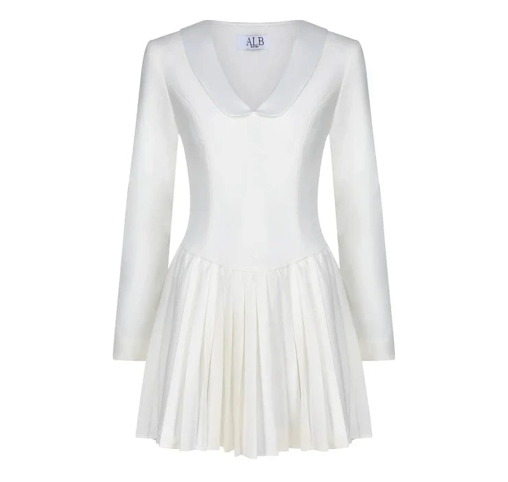 Beautiful designed mini dress with long sleeves, collar details and pleats. Timeless and forever. Elegant and versatile. The dress features long sleeves, delicate collar details, and pleats. Perfect for any occasion.