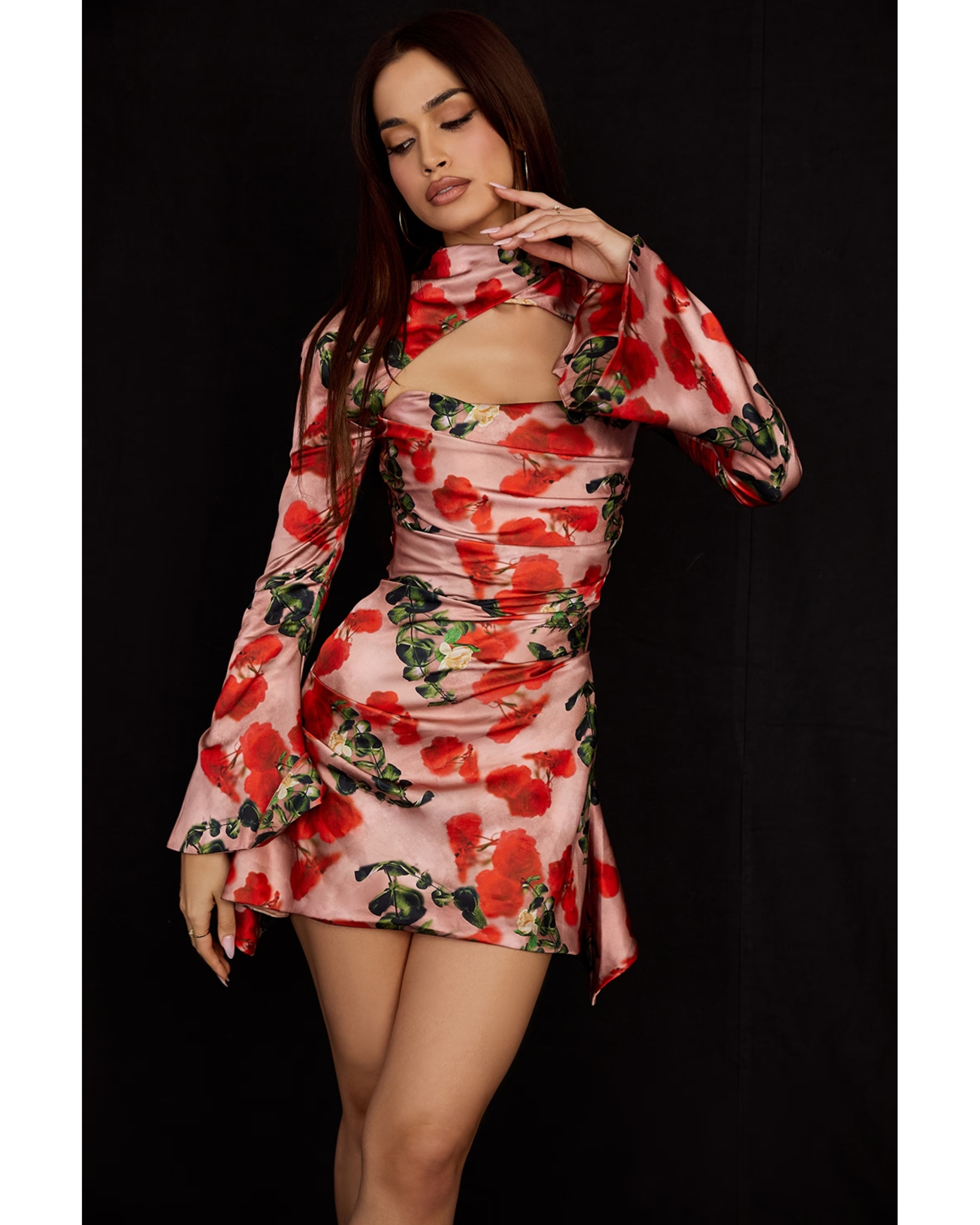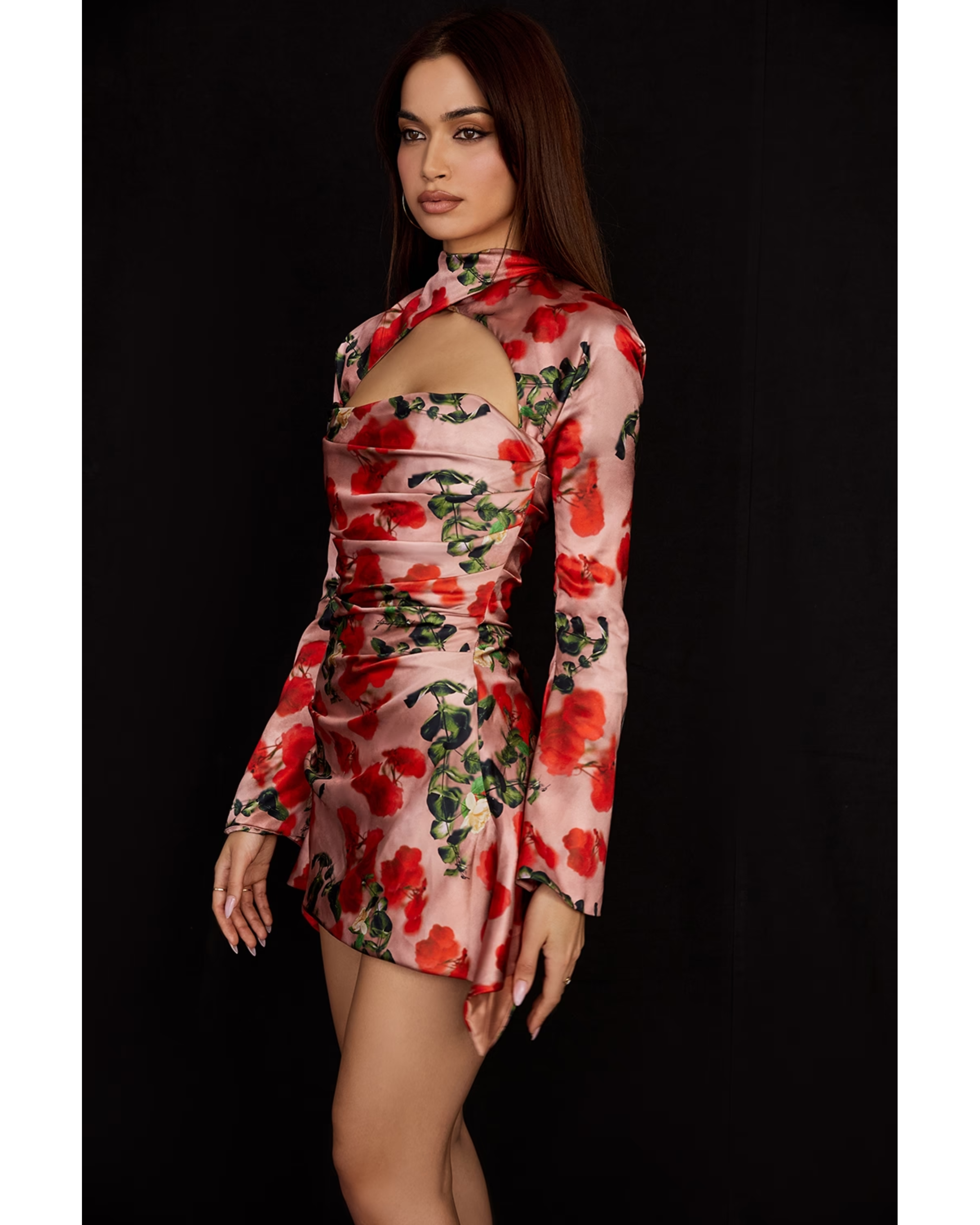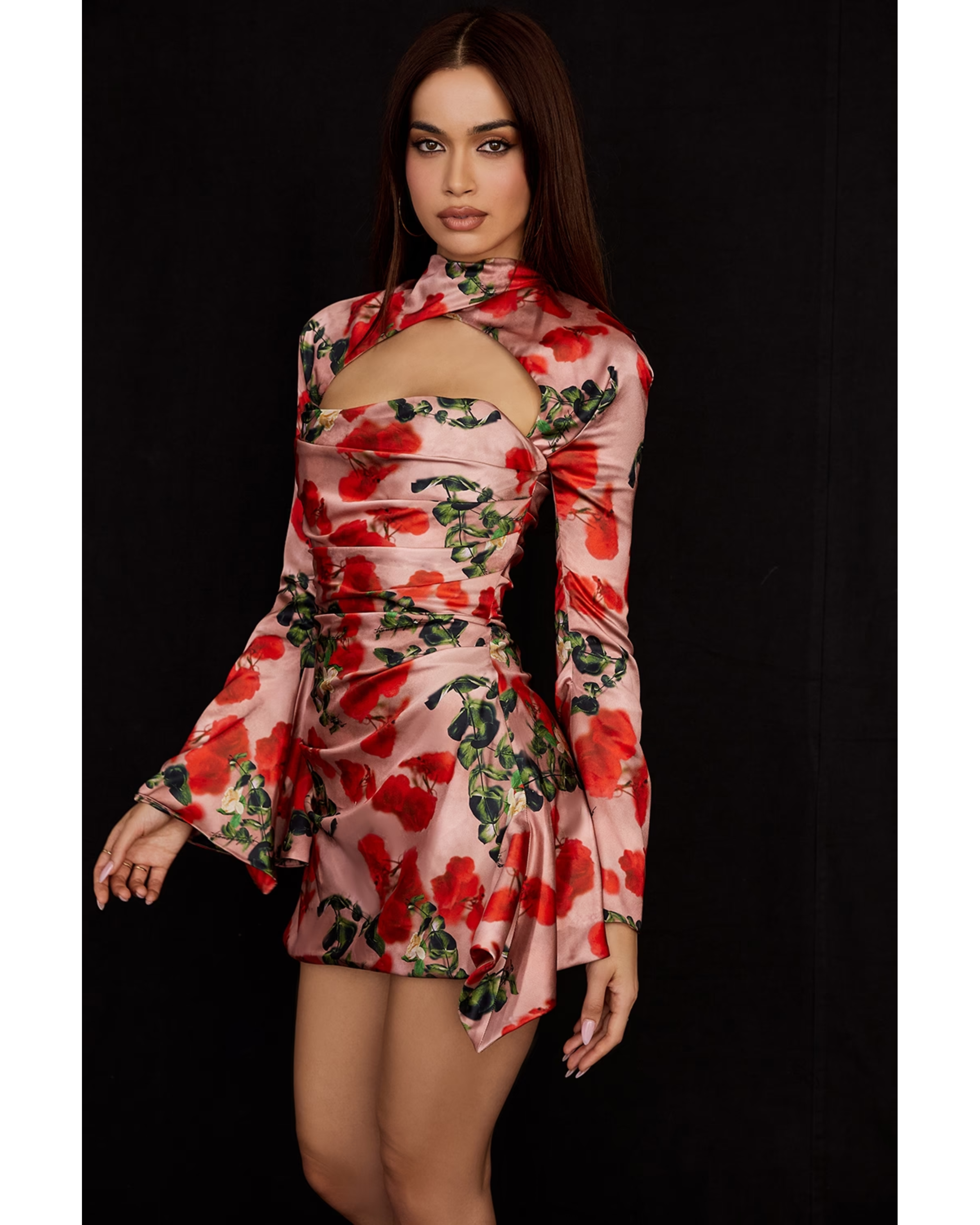 Our 'Toira' mini dress is so fun and flirtatious, making it perfect for romantic date nights. Made from our lustrous silk satin in a pretty floral rose print, 'Toira' is cut on the bias and has so many pretty details. The cross front halter shape is so flattering and creates a skin baring open front with a beautifully draped cowl neckline, fitted with our incredible corsetry boning to really cinch the waist. 'Toira' is fitted at the hips before falling to a slightly fluted hem with a waterfall drape that delicately sweeps across the skirt and down through the arms. The extended sleeves have flared cuffs to add a little drama. It is fully lined for comfort with a zip and button fastening to the back for easy on. Wear yours with dainty mules like 'Lucent'.