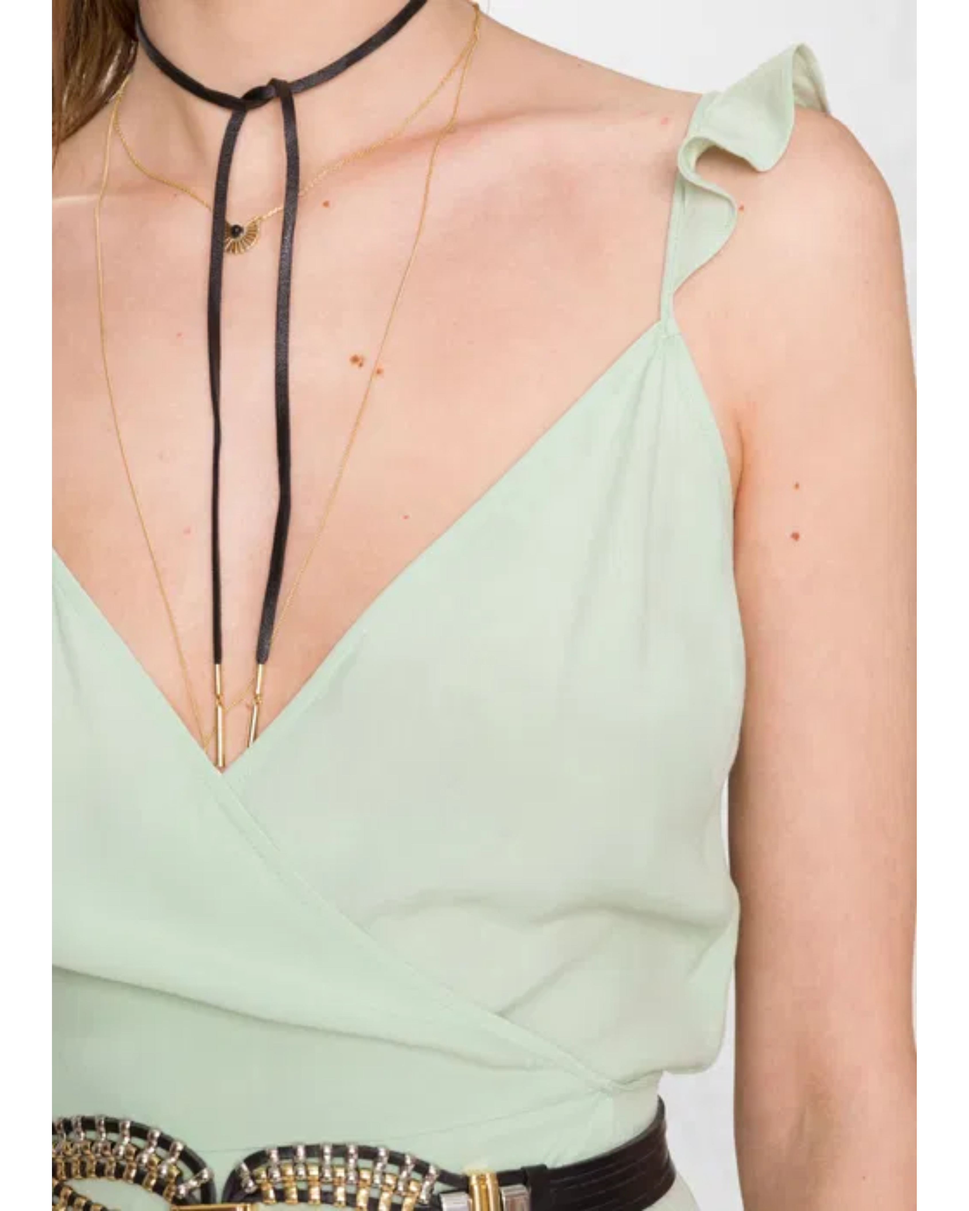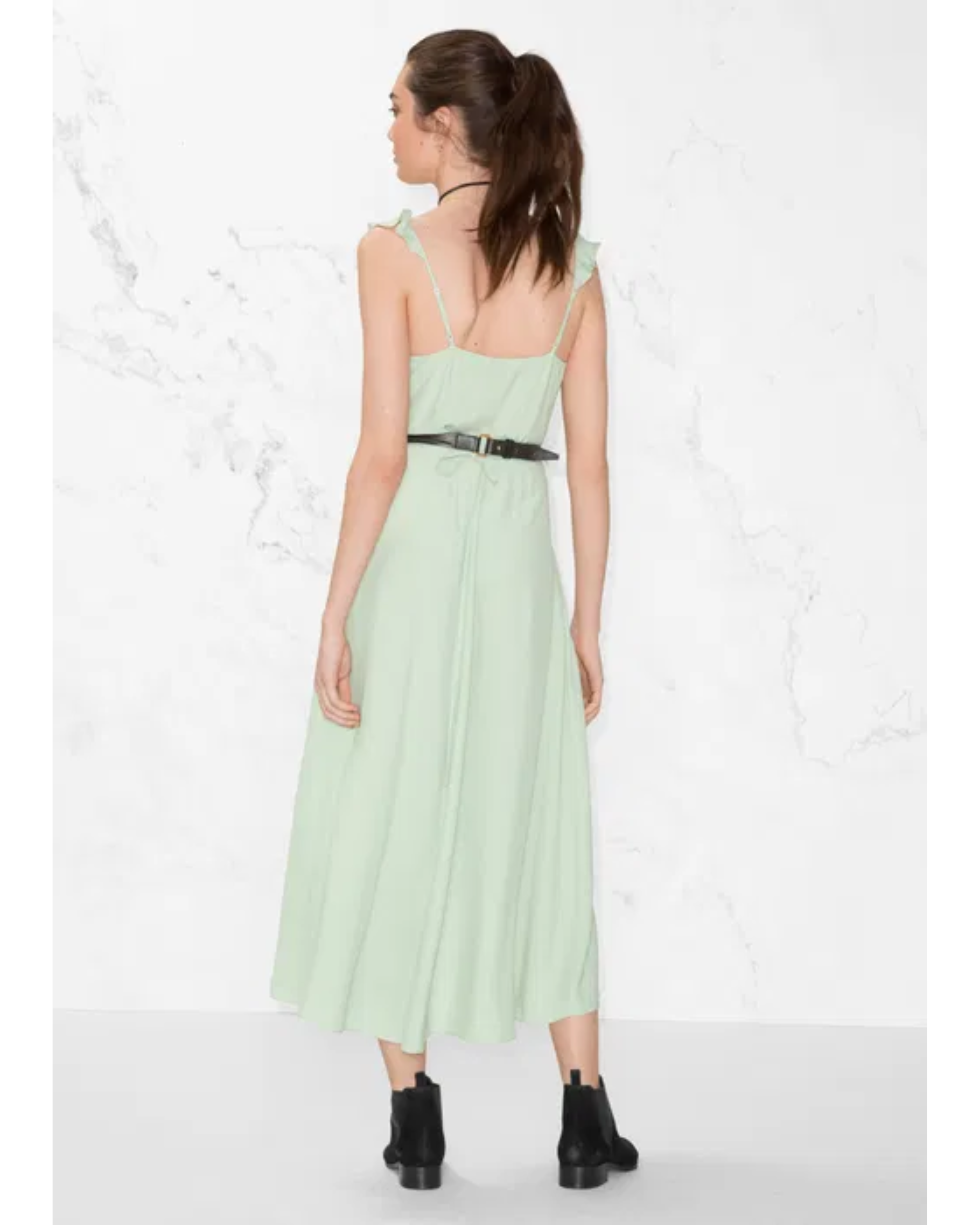 Feminine dress featuring a sweet wrap design and chic frill details on the shoulder straps.