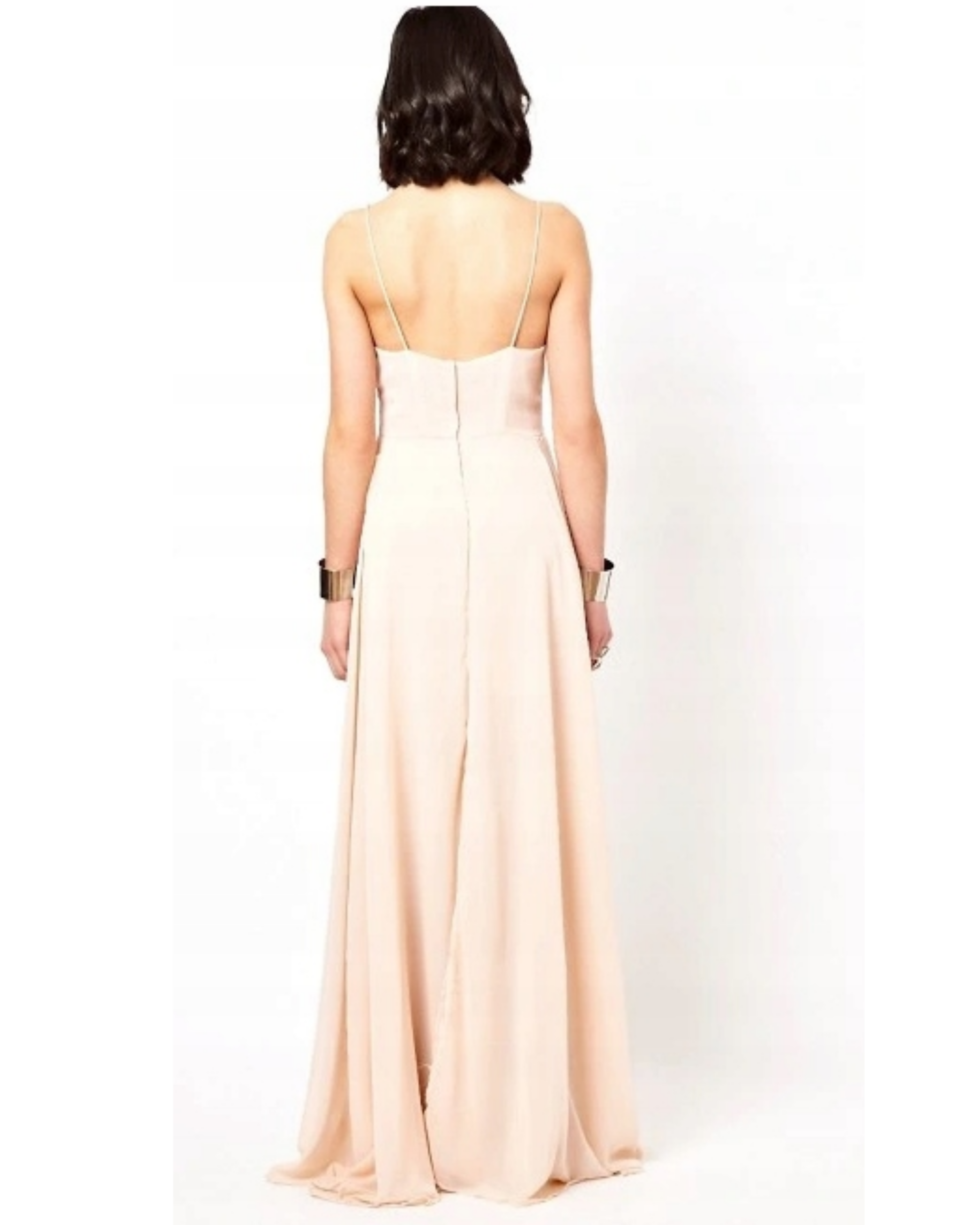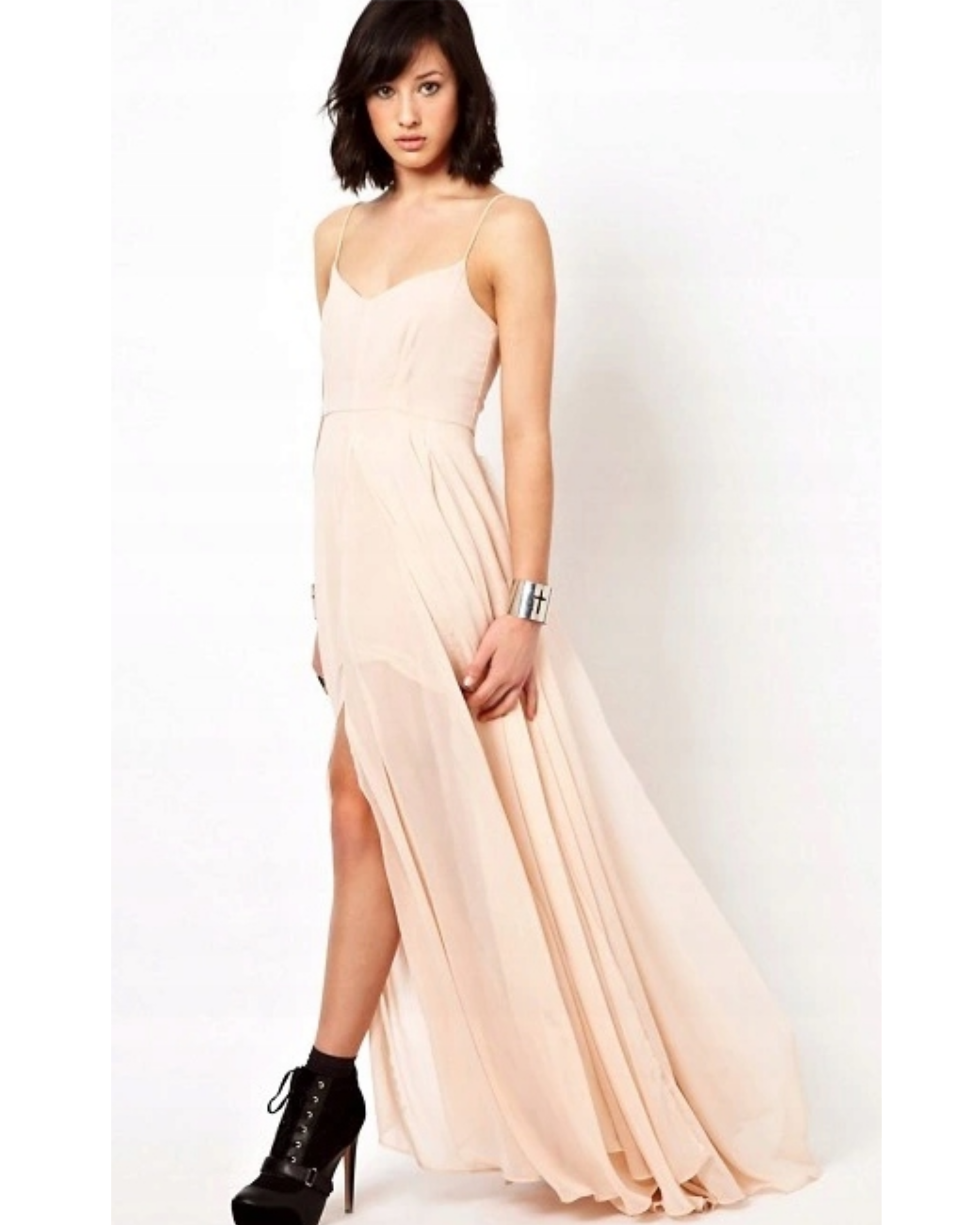 The infamous Olsen Dress is an iconic shape for the brand. The maxi dress is made from layers and layers of semi-sheer chiffon fabric available in a selection of core and seasonal trend colours. It has a small fitted body with a lined underskirt. The dress has a lined chiffon top with a low V-neck shape and delicate spaghetti straps for a super feminine touch. The dress also features a high empire line with a mini-length underskirt and a multi-layered maxi skirt with gathered pleats and high splits. This will turn heads at any party or event. Please note that this dress is made from 10m of floaty georgette fabric
