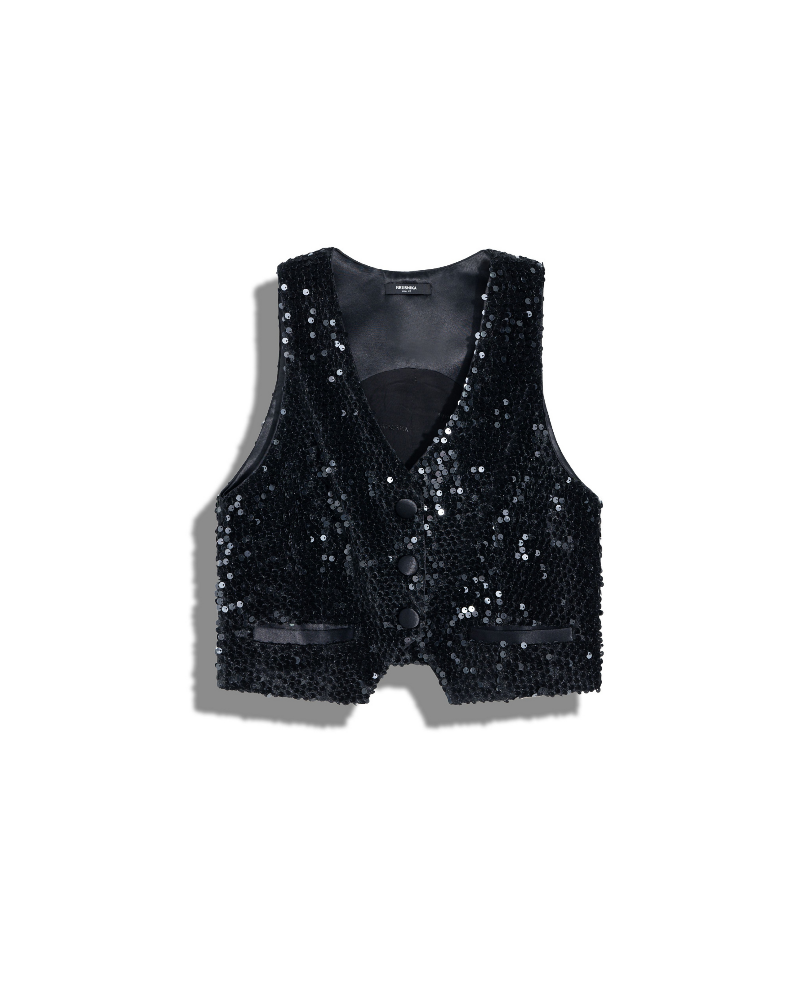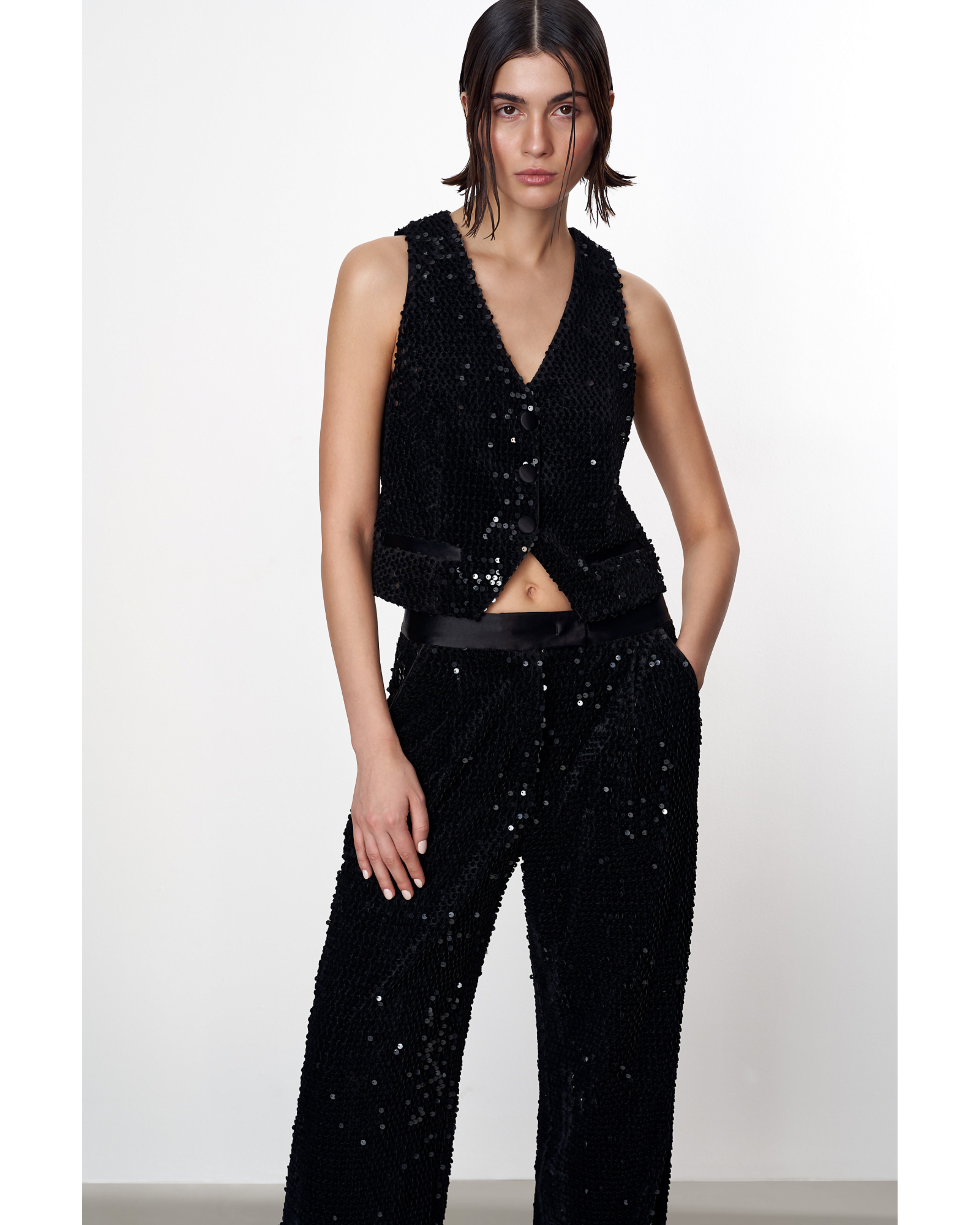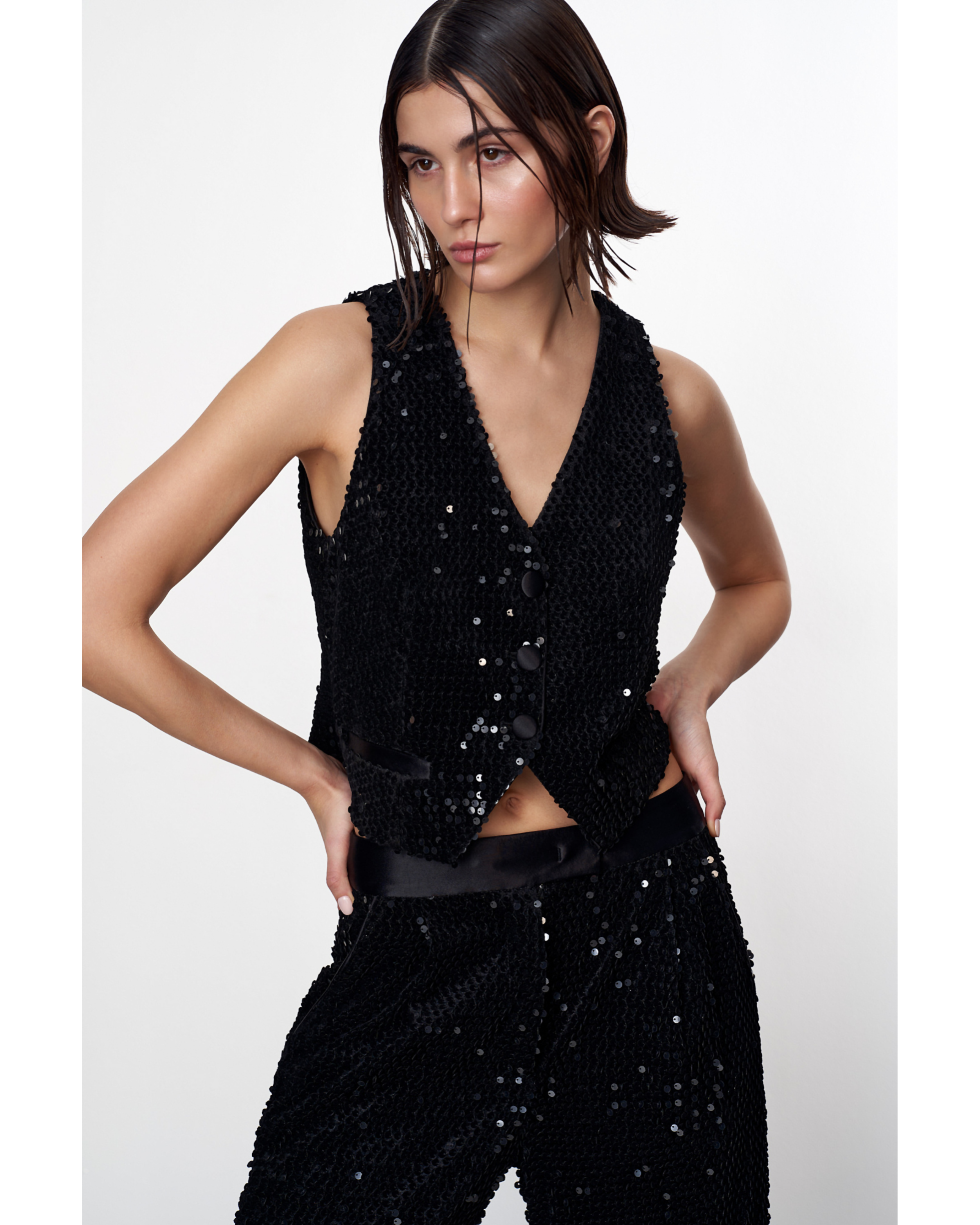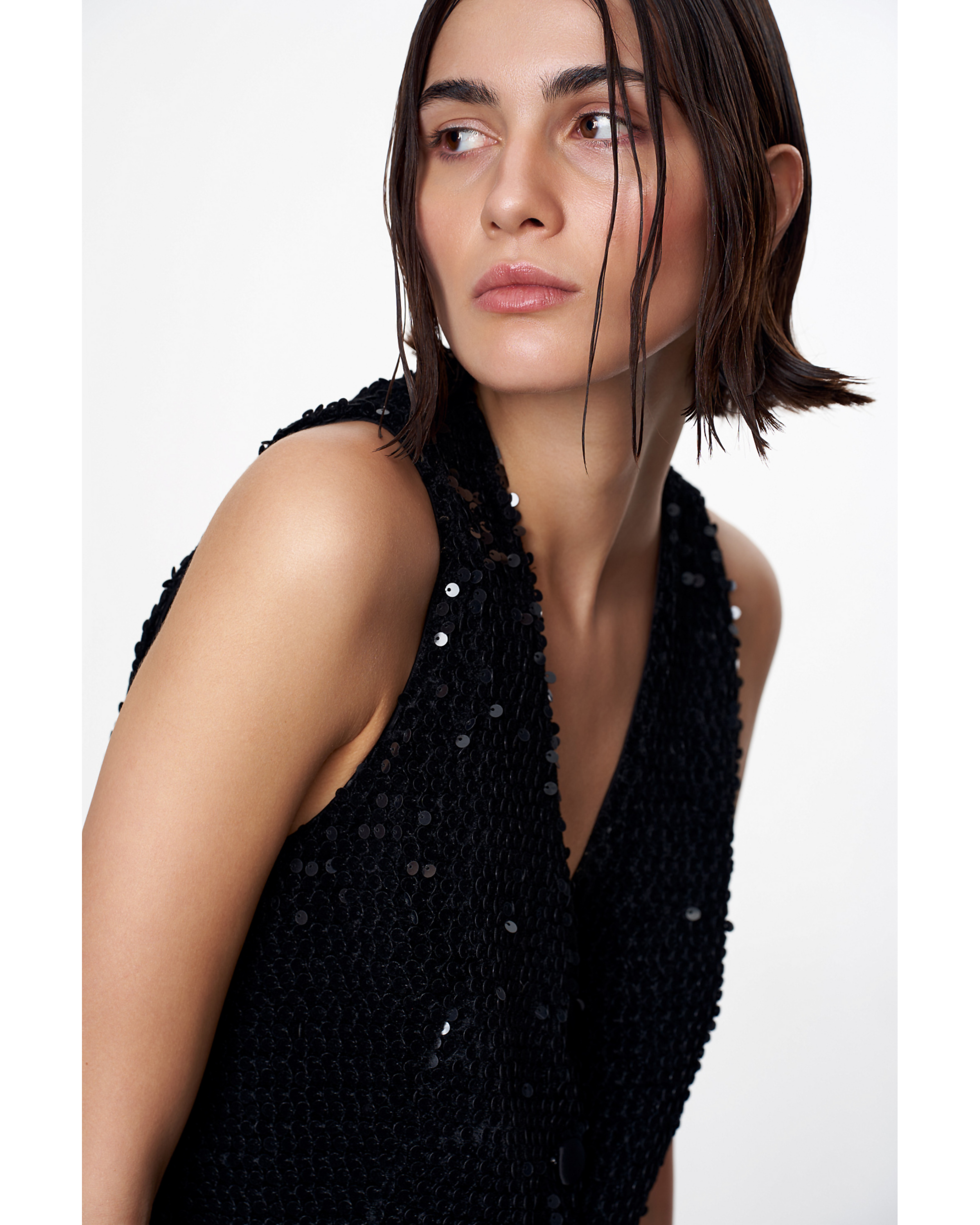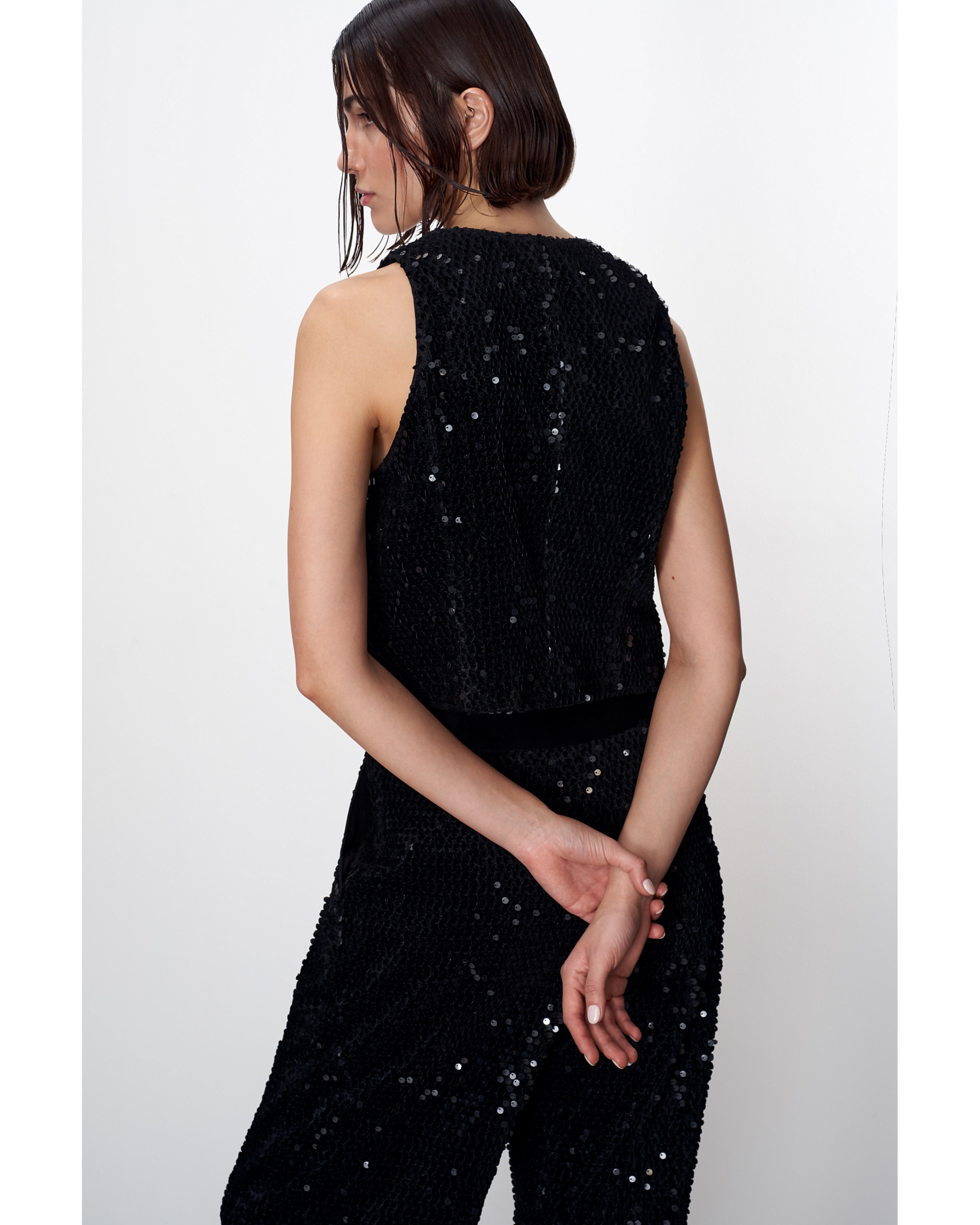 Velvet vest decorated with sequins. Free silhouette model with V-neck. Button fastening. The lining is made of satin fabric.