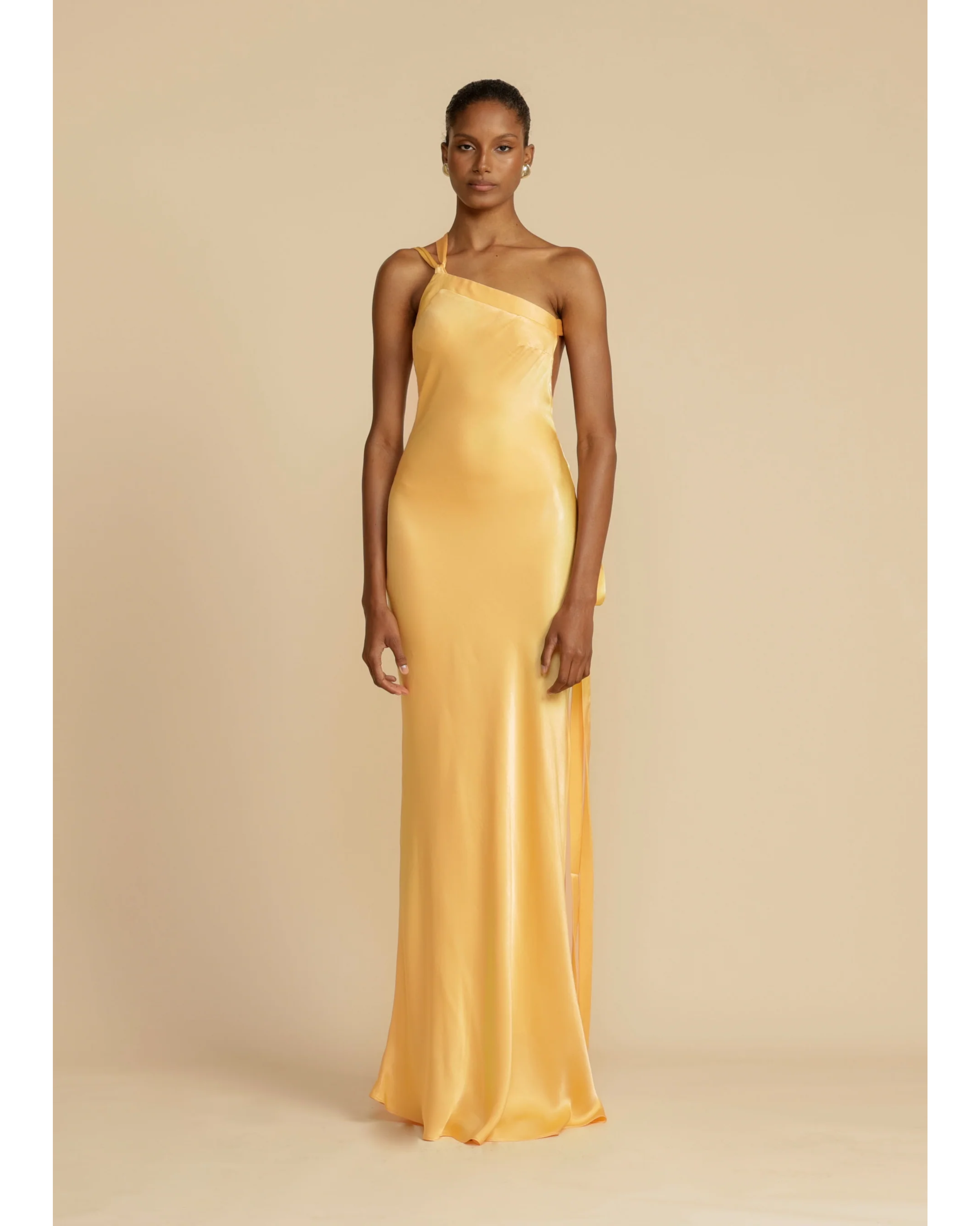 Elevate your presence with Monique, a mesmerising floor-length gown designed for modern elegance. Crafted in a luxurious rich yellow hue cut on the bias, Monique is made to accentuate your curves and ignite the senses. She features an asymmetrical one-shoulder design with a striking open back. Finely finished with crossover detailing and sculpted to embrace the feminine form. Her strap flows gracefully over the back, securing at the side hip. Crafted from a high quality Viscose offering comfortability and sophistication. Monique's elegant design will take you from sunset to a moonlit soiree.
