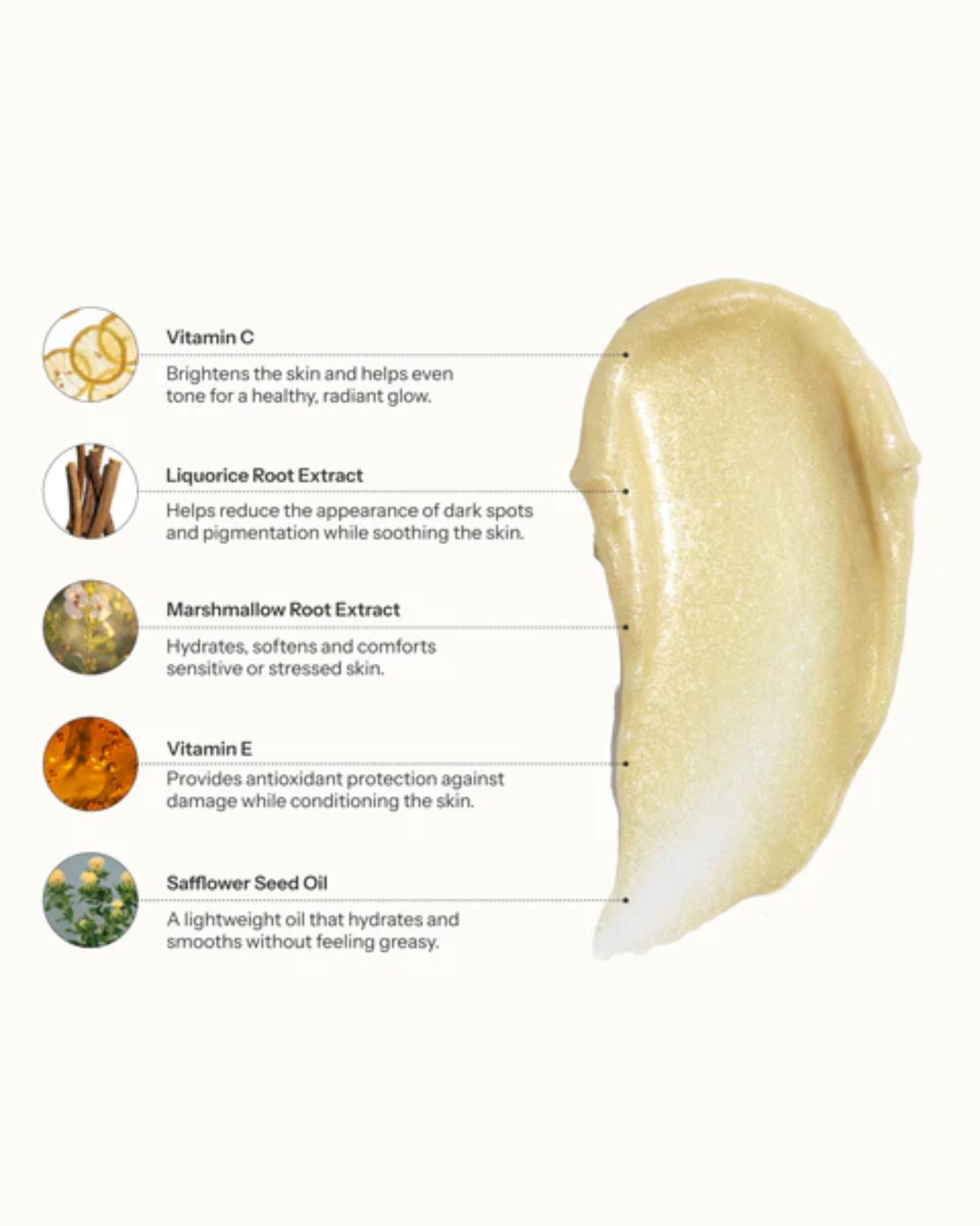 - Vitamin C (Ascorbyl Tetraisopalmitate): Brightens the skin and helps even tone for a healthy, radiant glow.