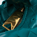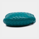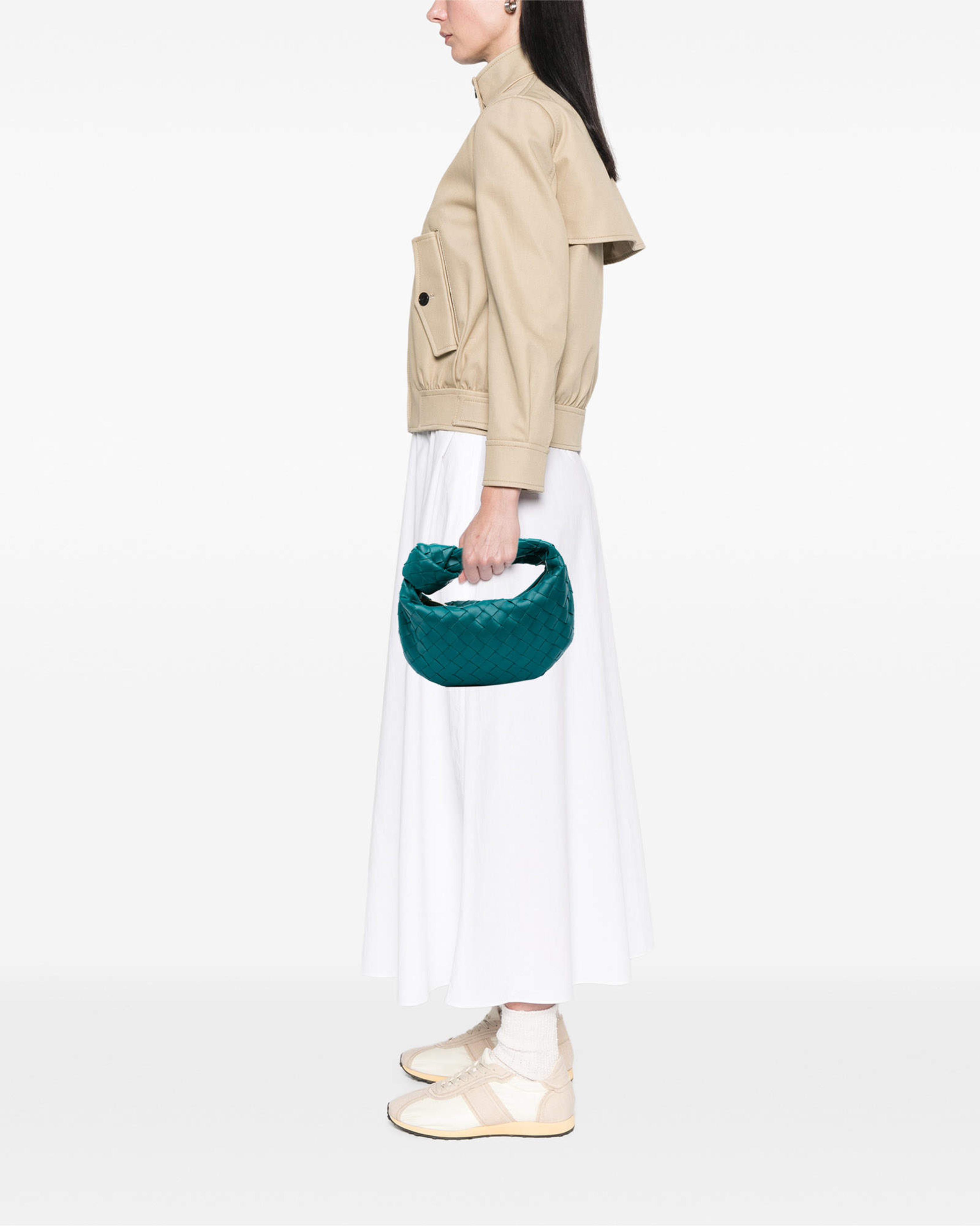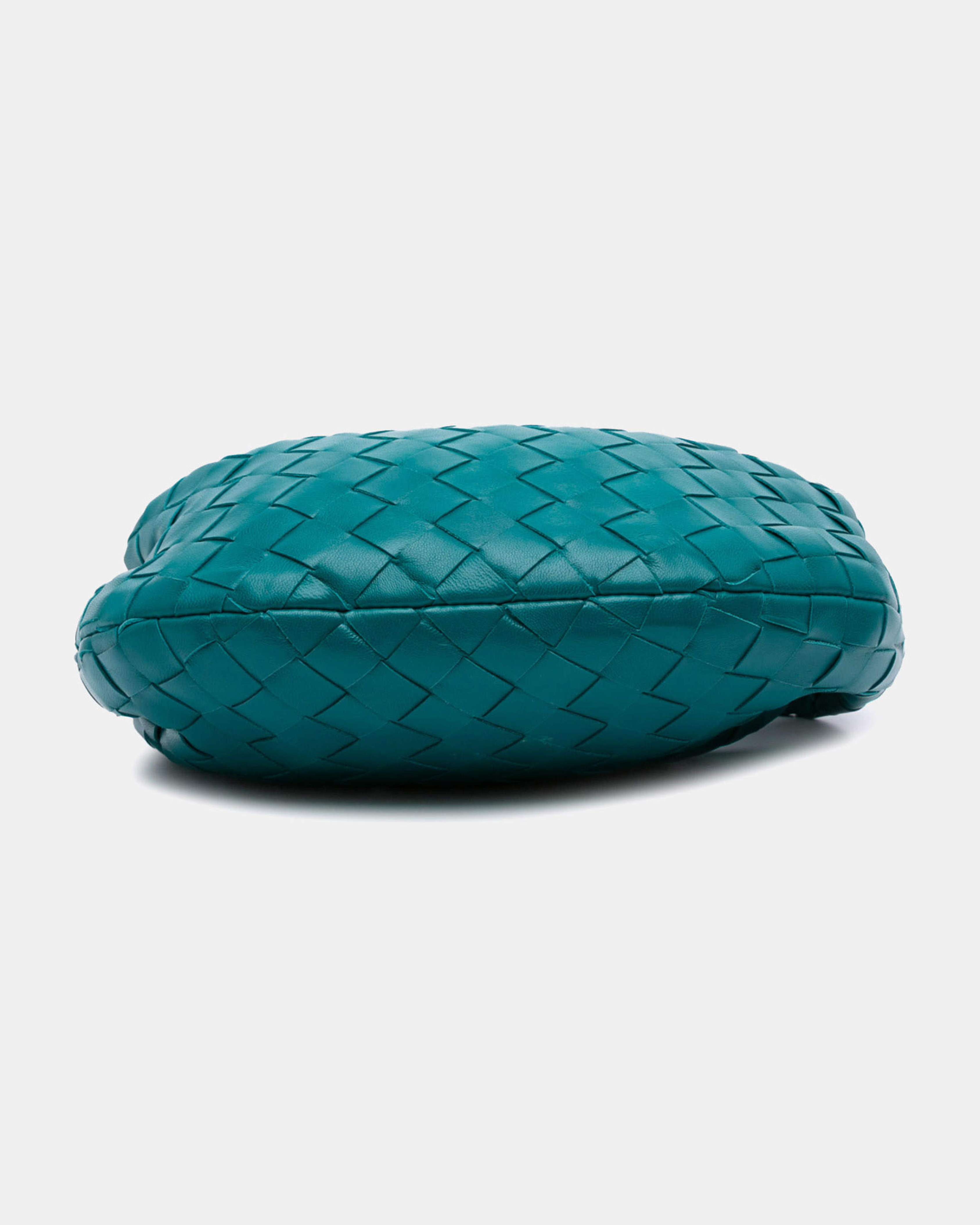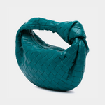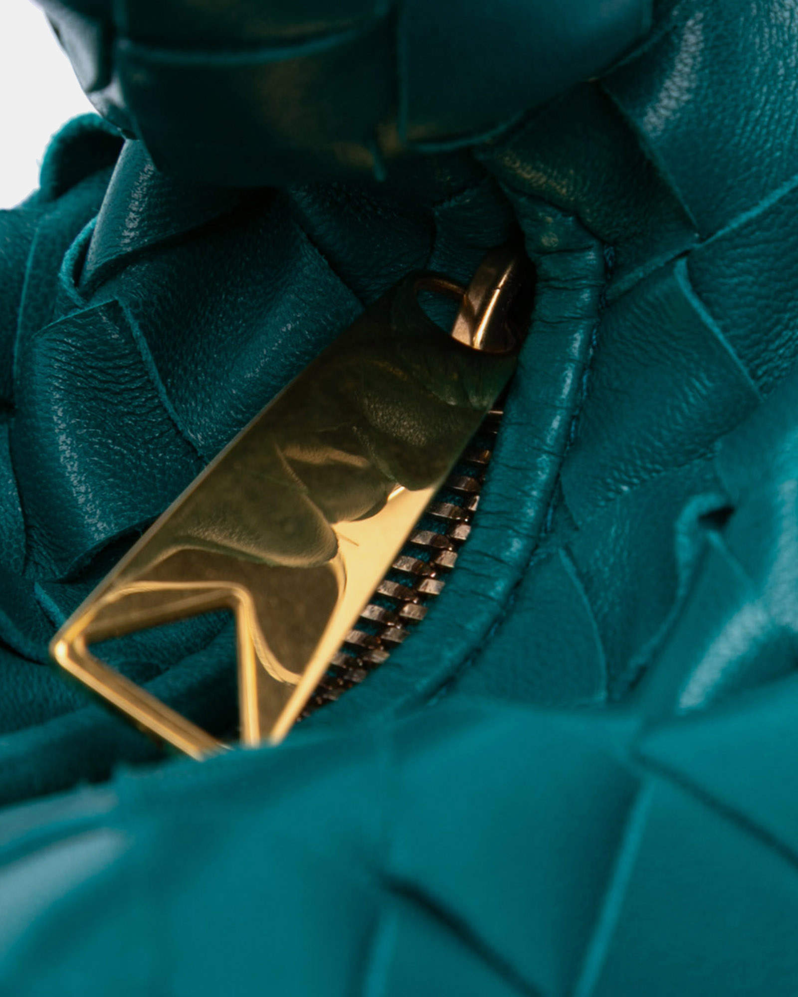Soft nappa leather and signature intrecciato weaving define this mini Jodie in a striking blue hue. The knotted handle adds sculptural charm.