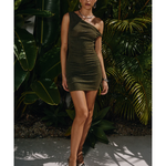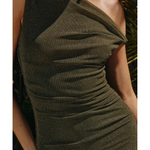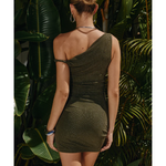 The Chyna Dress features a mini length, asymmetrical neckline, glitter lurex throughout the whole garment, one off the shoulder twisted strap, ruching on the sides of the dress. This garment is lined from the lower bust down, double layered with the body fabric around the bust and has stretch.