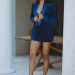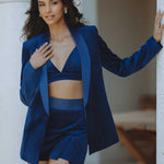 A striking sapphire-blue set designed for effortless elegance. The tailored blazer drapes beautifully over the shoulders with a smooth, satin-like finish that catches the light. Paired with a sleek, high-waist skirt that skims the body and falls into a refined, feminine silhouette. The structured waistband defines the waist, while the rich fabric adds depth and polish to the look.