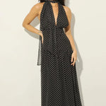 Playful yet refined, the Grace dress offers three effortless ways to wear in one timeless design. Crafted from a lightweight, fluid fabric with a soft drape, it features a deep plunge neckline, adjustable tie details, and a subtle polka dot print that flatters every silhouette. The cinched waist enhances shape, while the versatile styling makes it perfect from day to night.