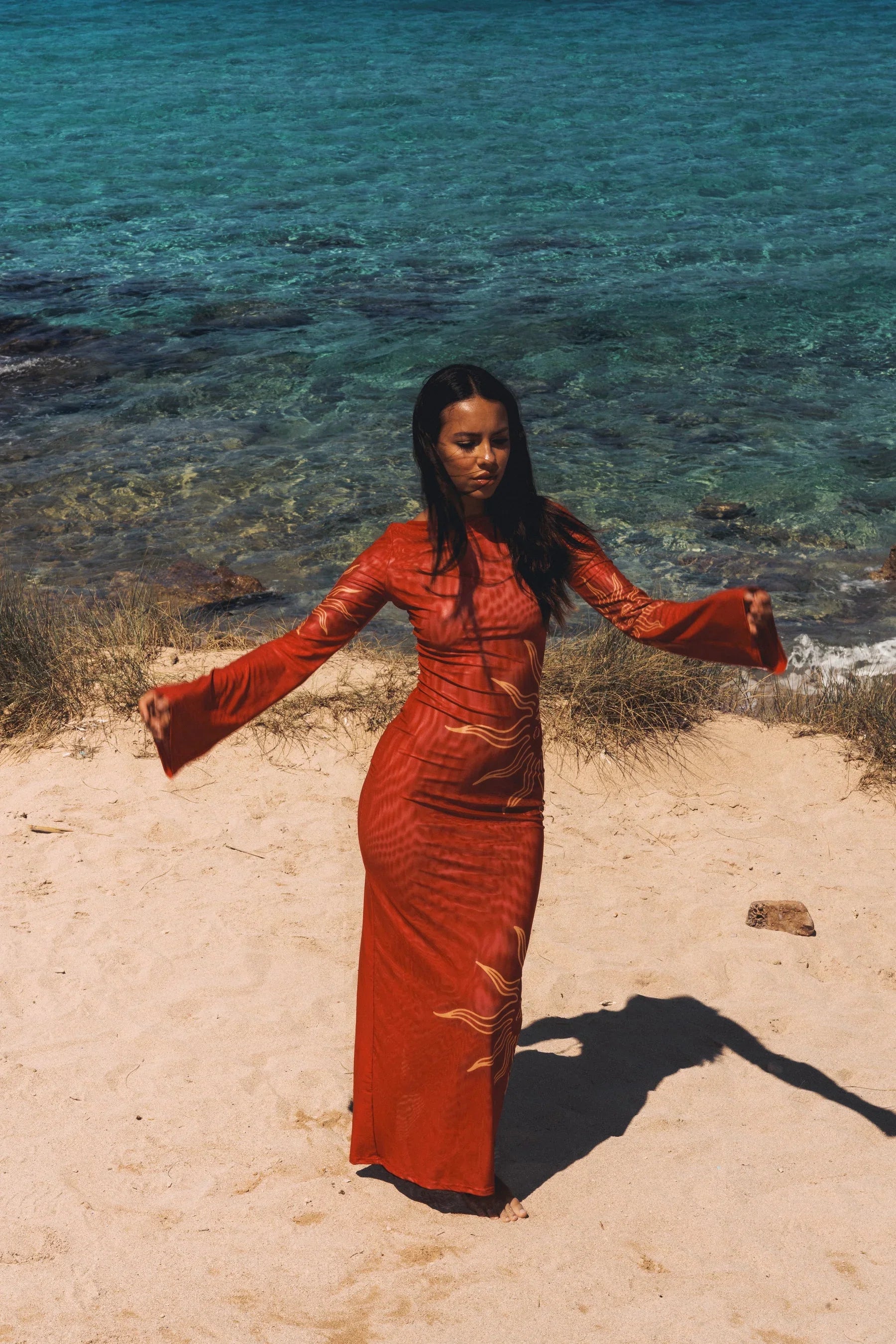 Featuring a a bold open back with tie fastening and luxury gold charm details, flared sleeve and in our signature mermaid maxi shape all perfectly completed with our Celeste print on the color of the season.