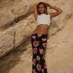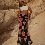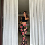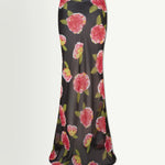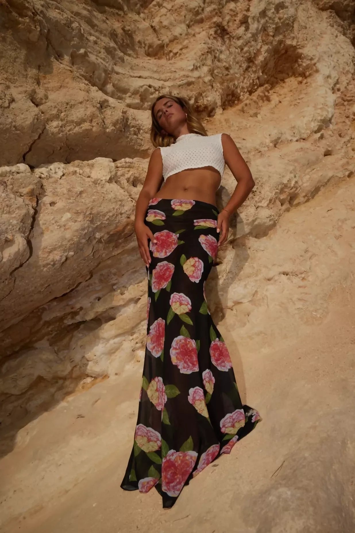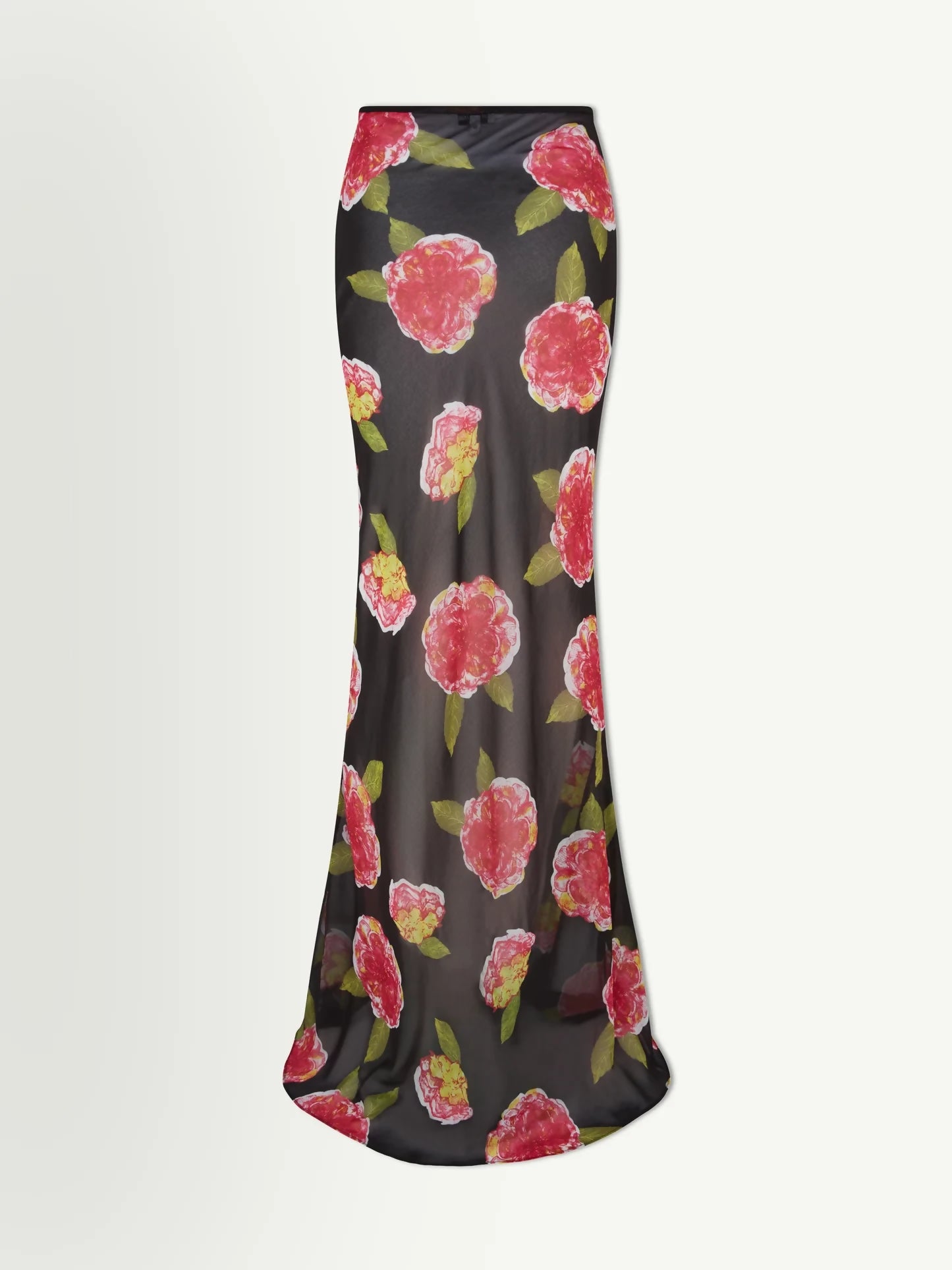 A sheer black chiffon skirt featuring a bold floral print and side zip fastening. Designed in a longer length for an elegant, flattering drape.