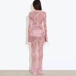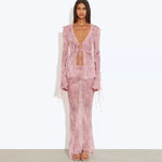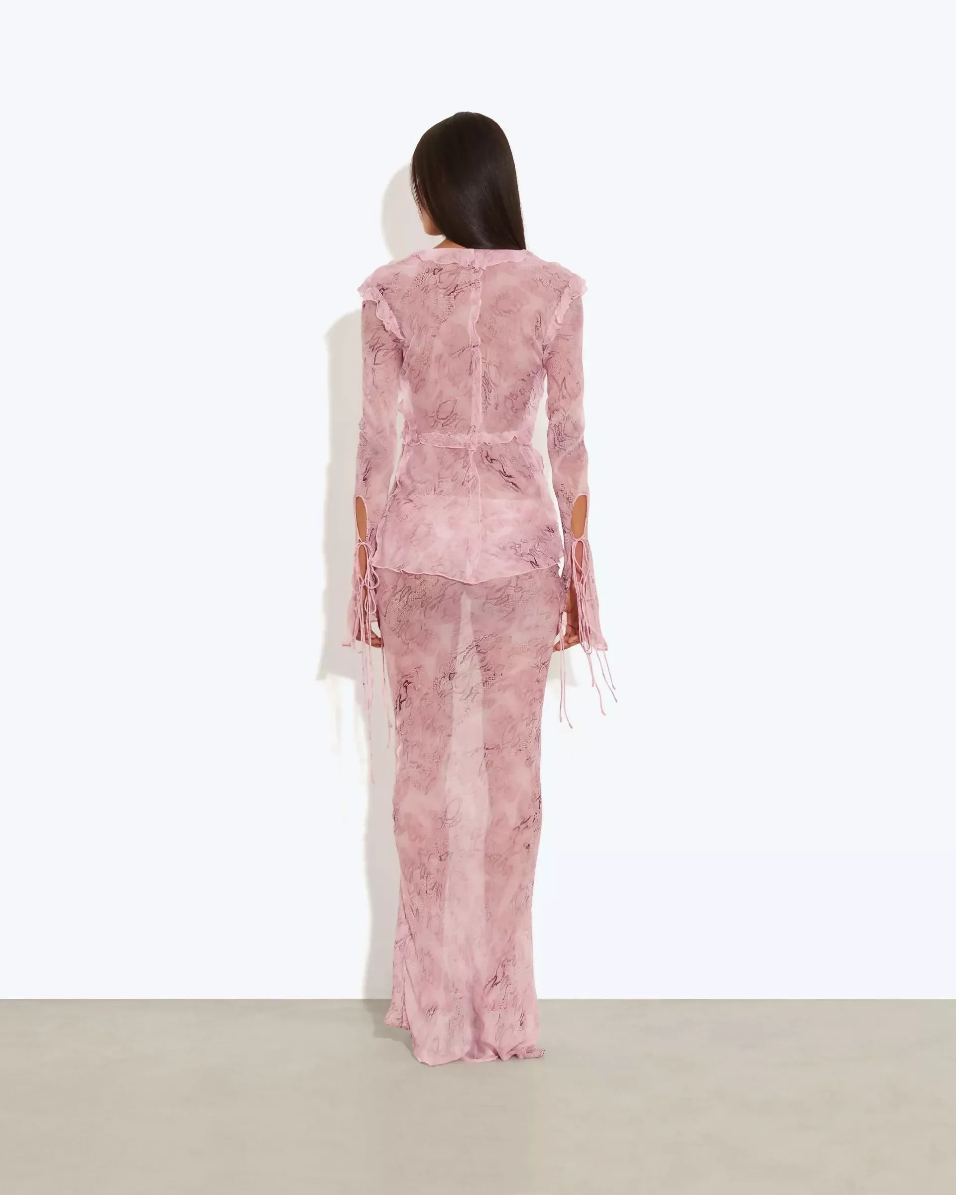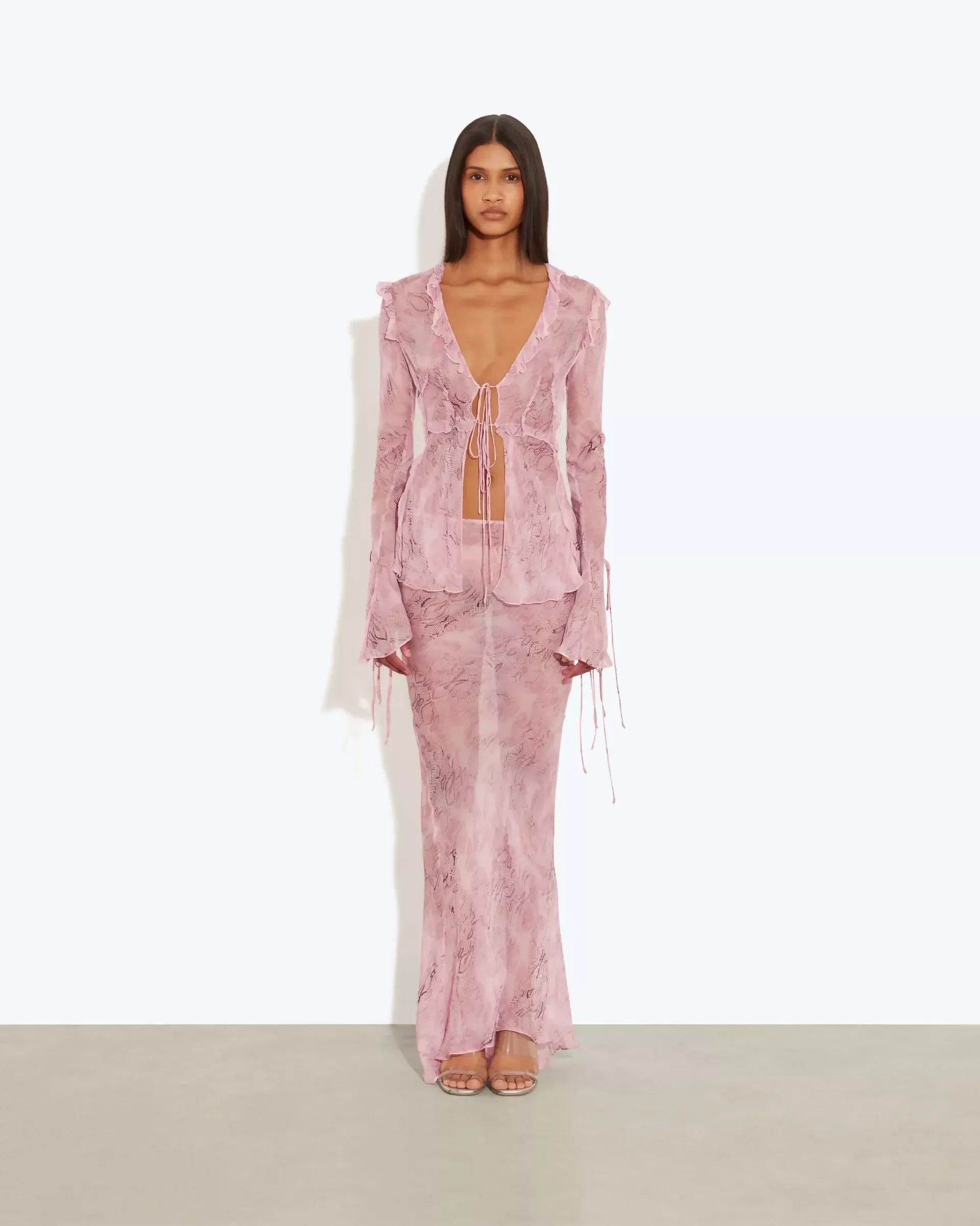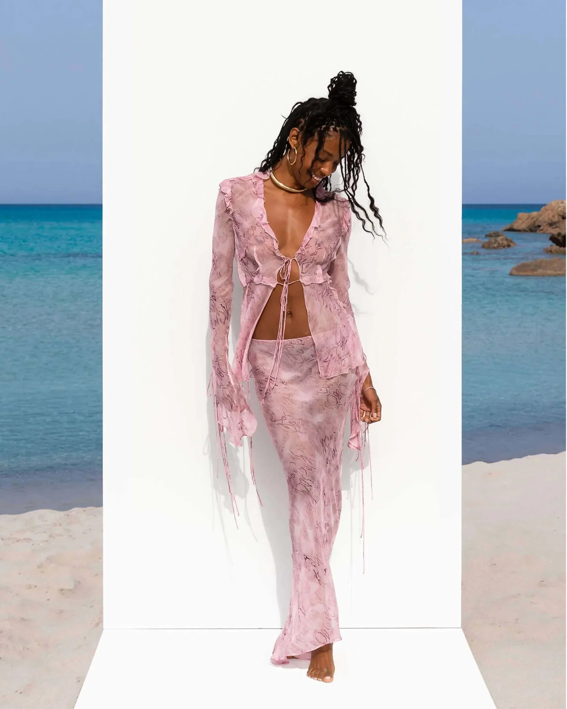 A statement set in soft snake print against a moody pink backdrop, crafted from luxe crinkle viscose. The Cobra slip skirt features a fluid silhouette with a mini floor-skimming train, while the matching blouse carries Rat & Boa’s signature ruffled shape, slit cuffs, and delicate tie details. An elegant yet playful look, versatile for both day and evening occasions.