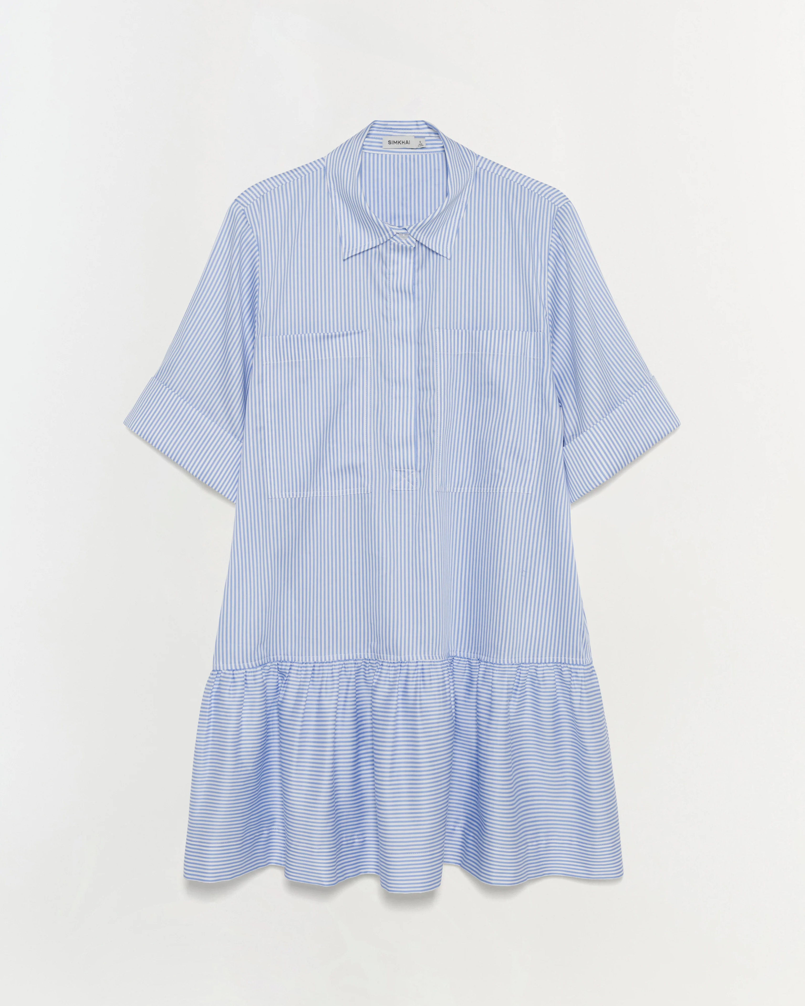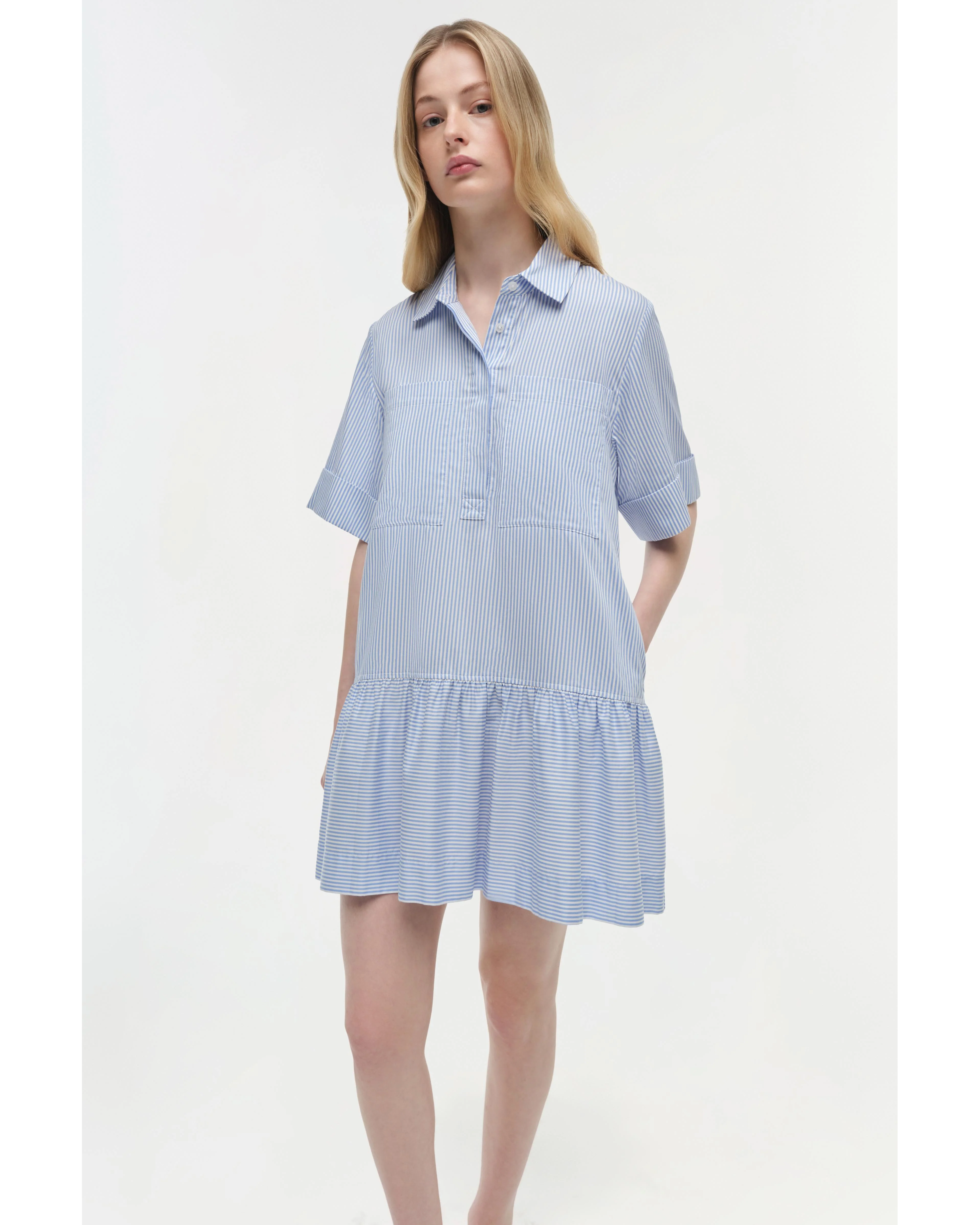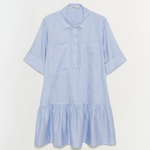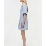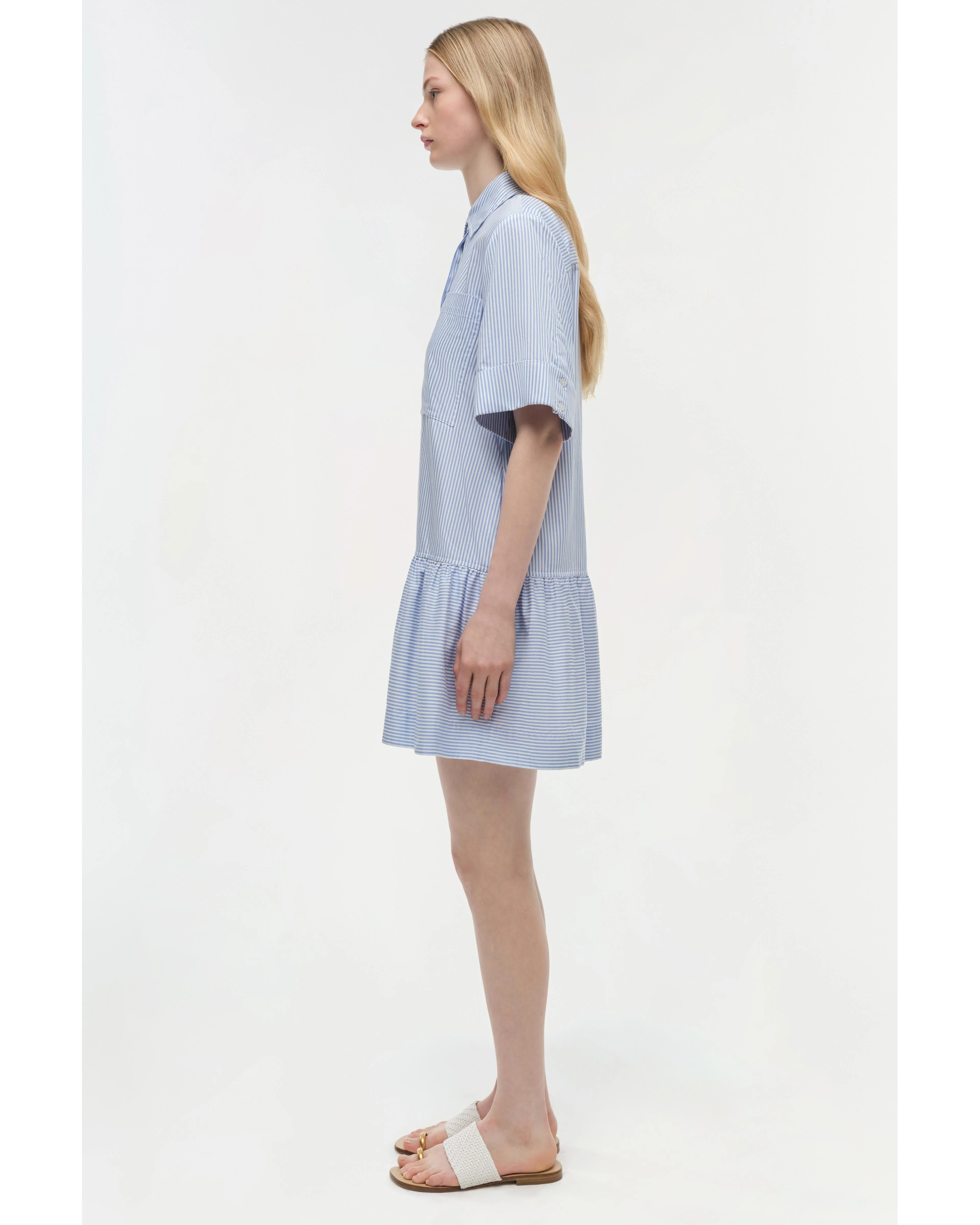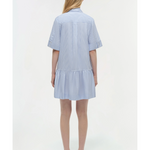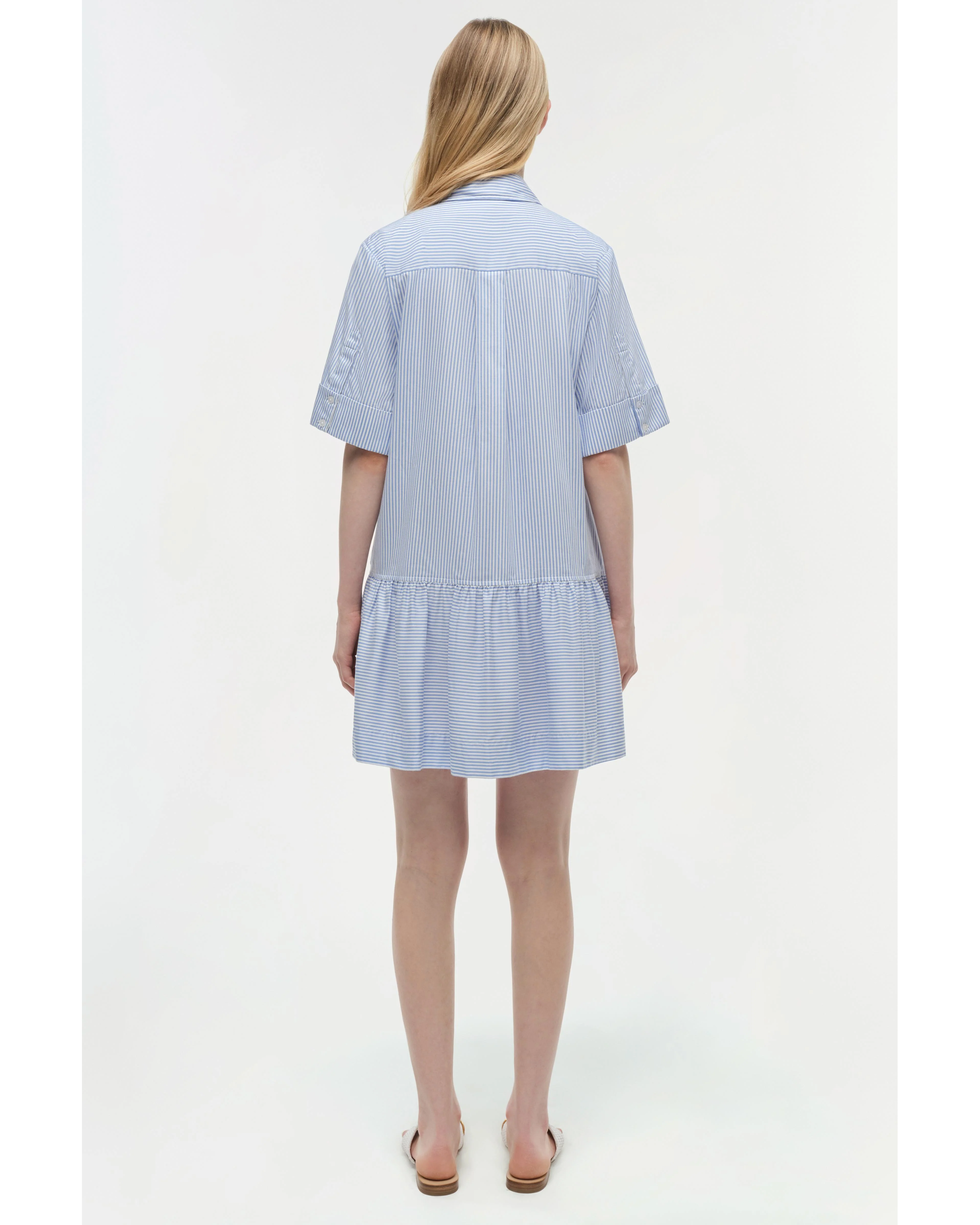 The Cris Cotton Mini Dress in Blue Hydrangea Stripe. Crafted from striped novelty shirting, this short-sleeve shirt dress combines crisp lines with a playful silhouette.