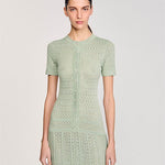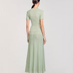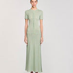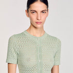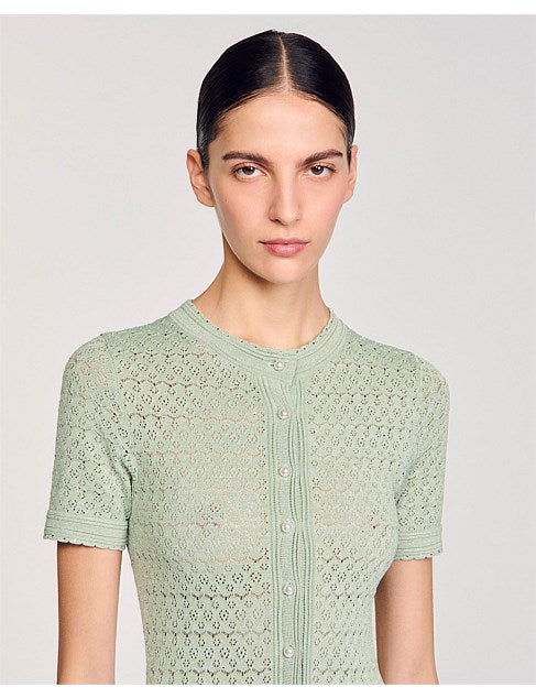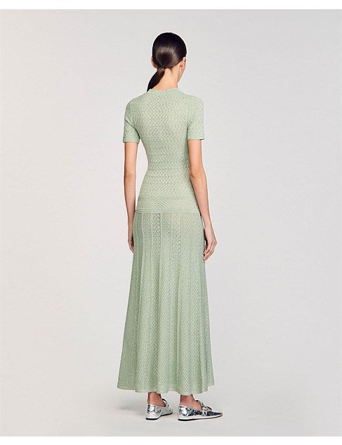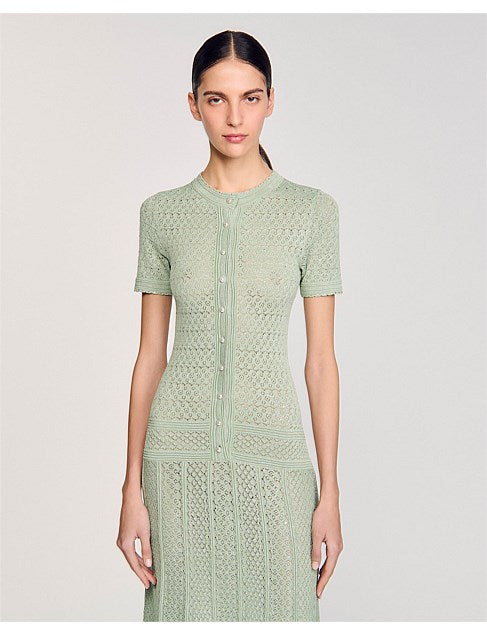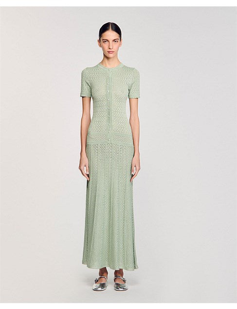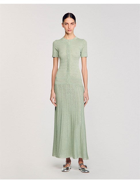 Glitter knit maxi dress with rhinestone details, featuring a round neck, short sleeves and a button placket with pearlescent buttons.