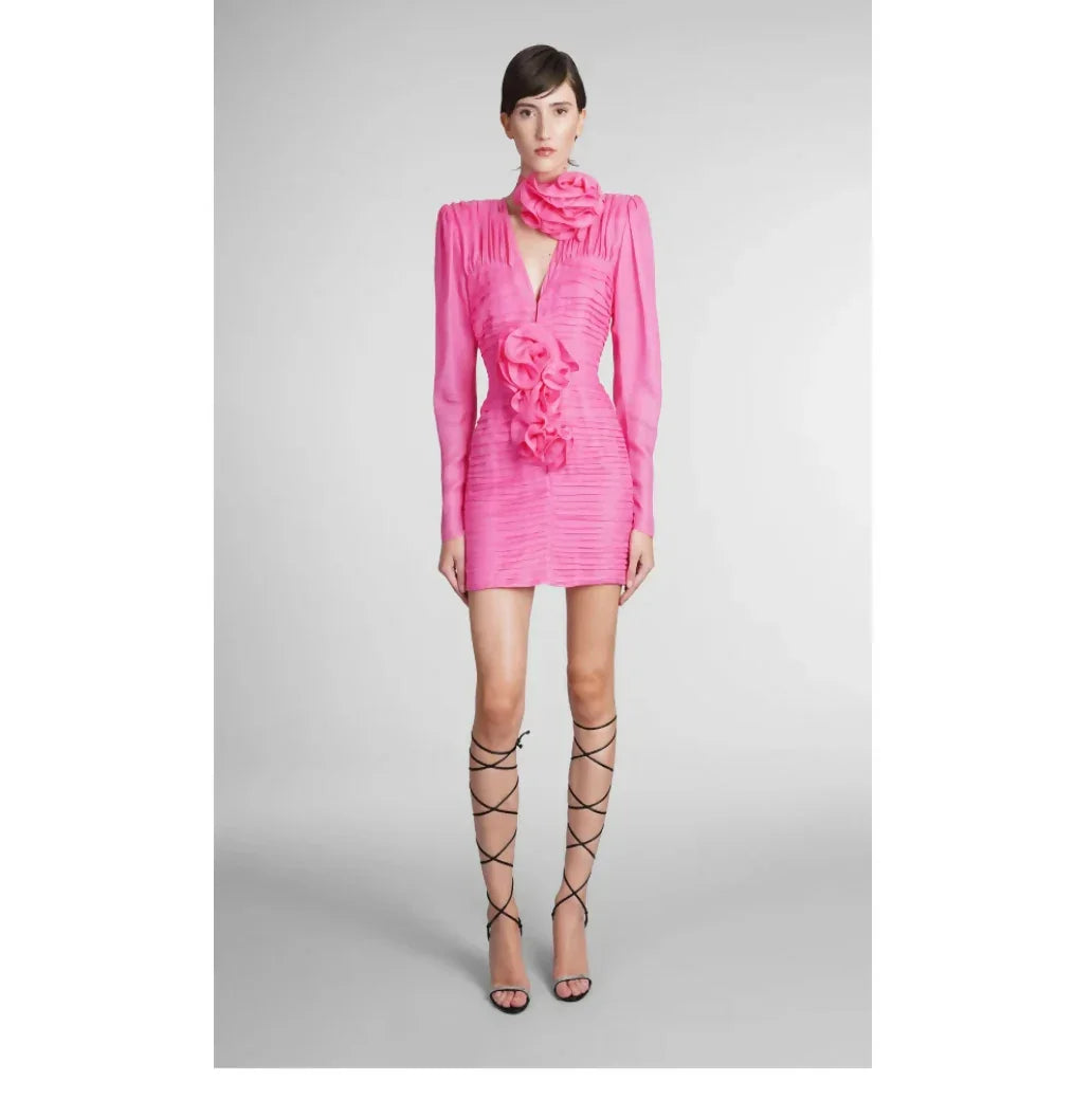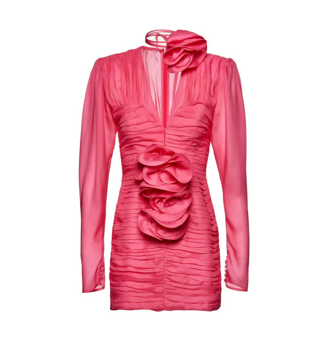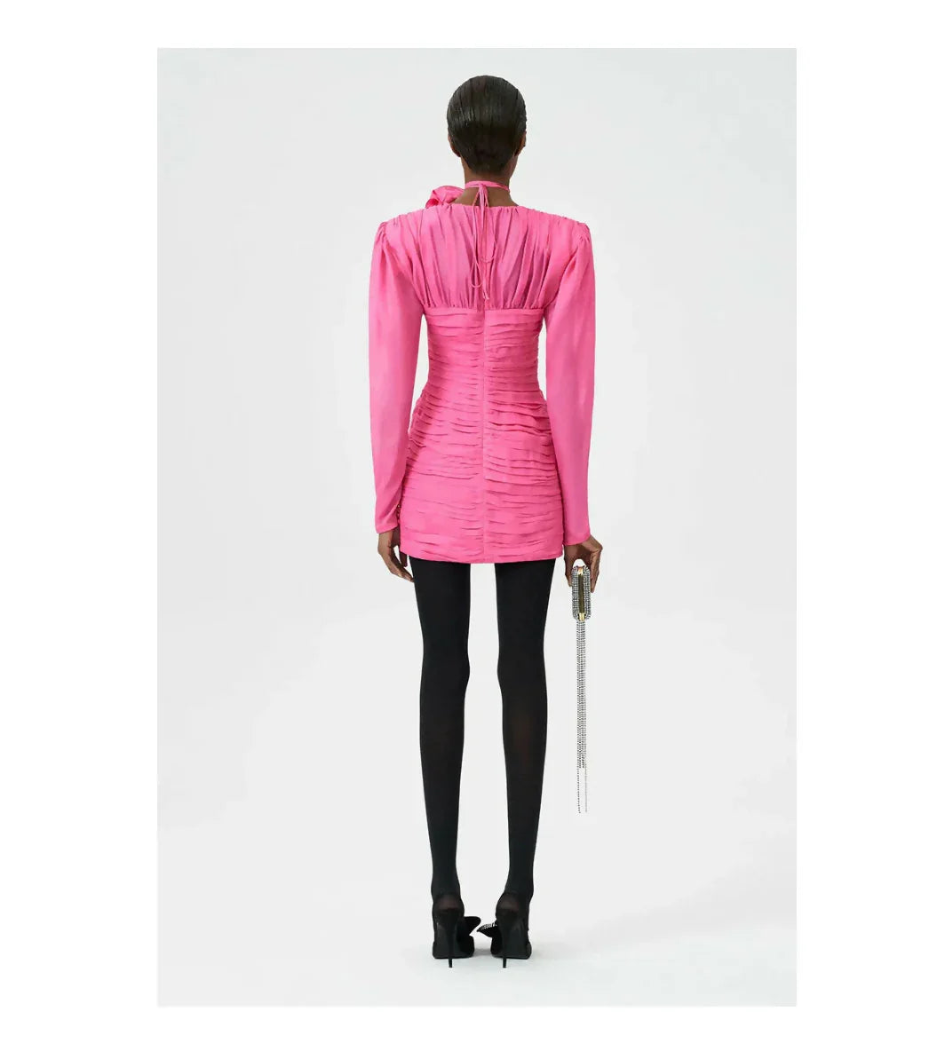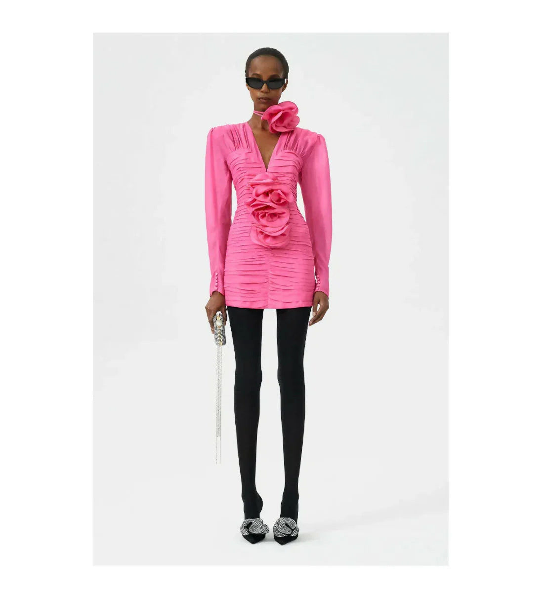 A rose-pink silk dress featuring Magda Butrym’s signature flower detail. Cut with a V-neck and structured shoulders, the silhouette is softly pleated for movement and closes with a back zip. Elegant, feminine, and perfect for occasion dressing.