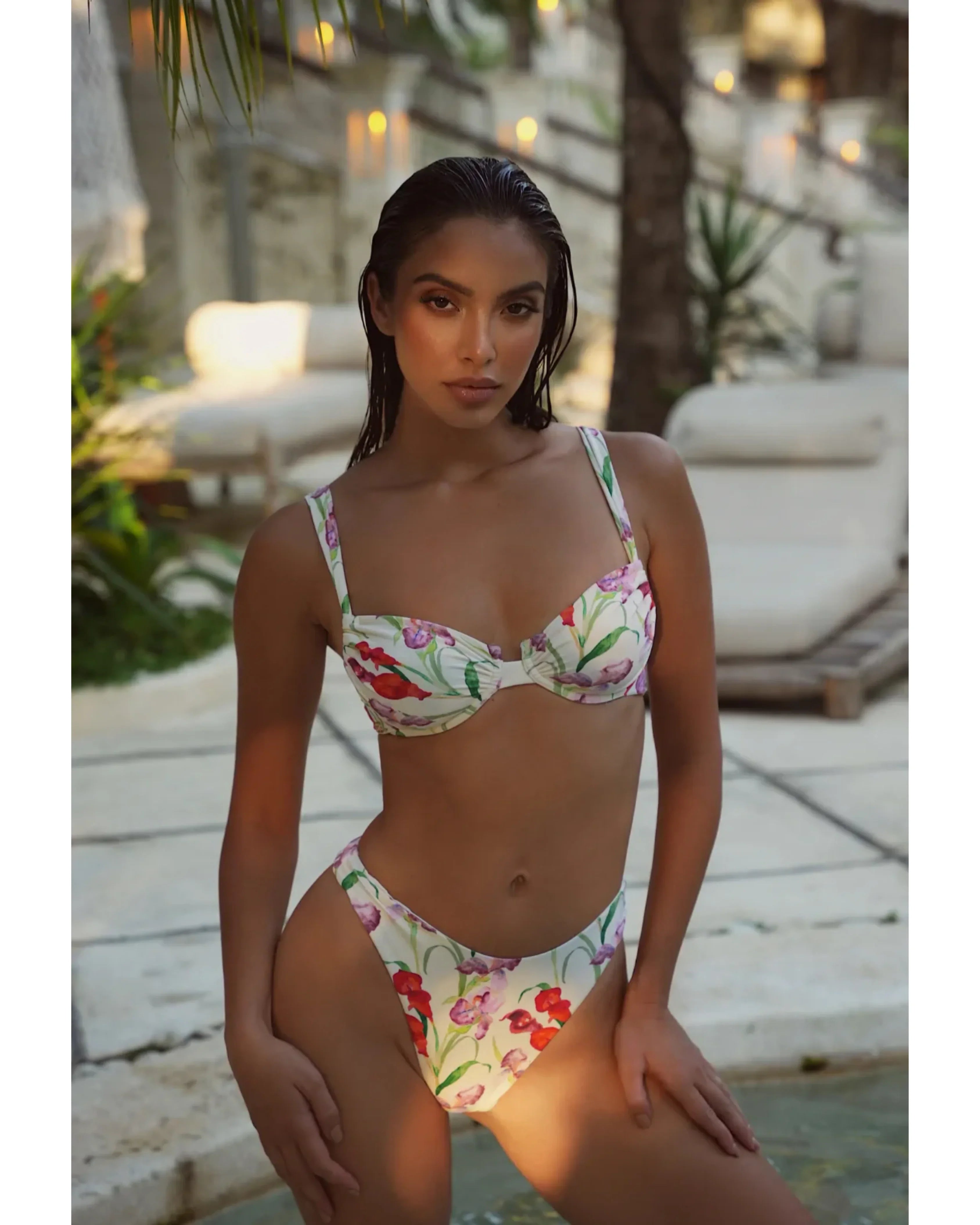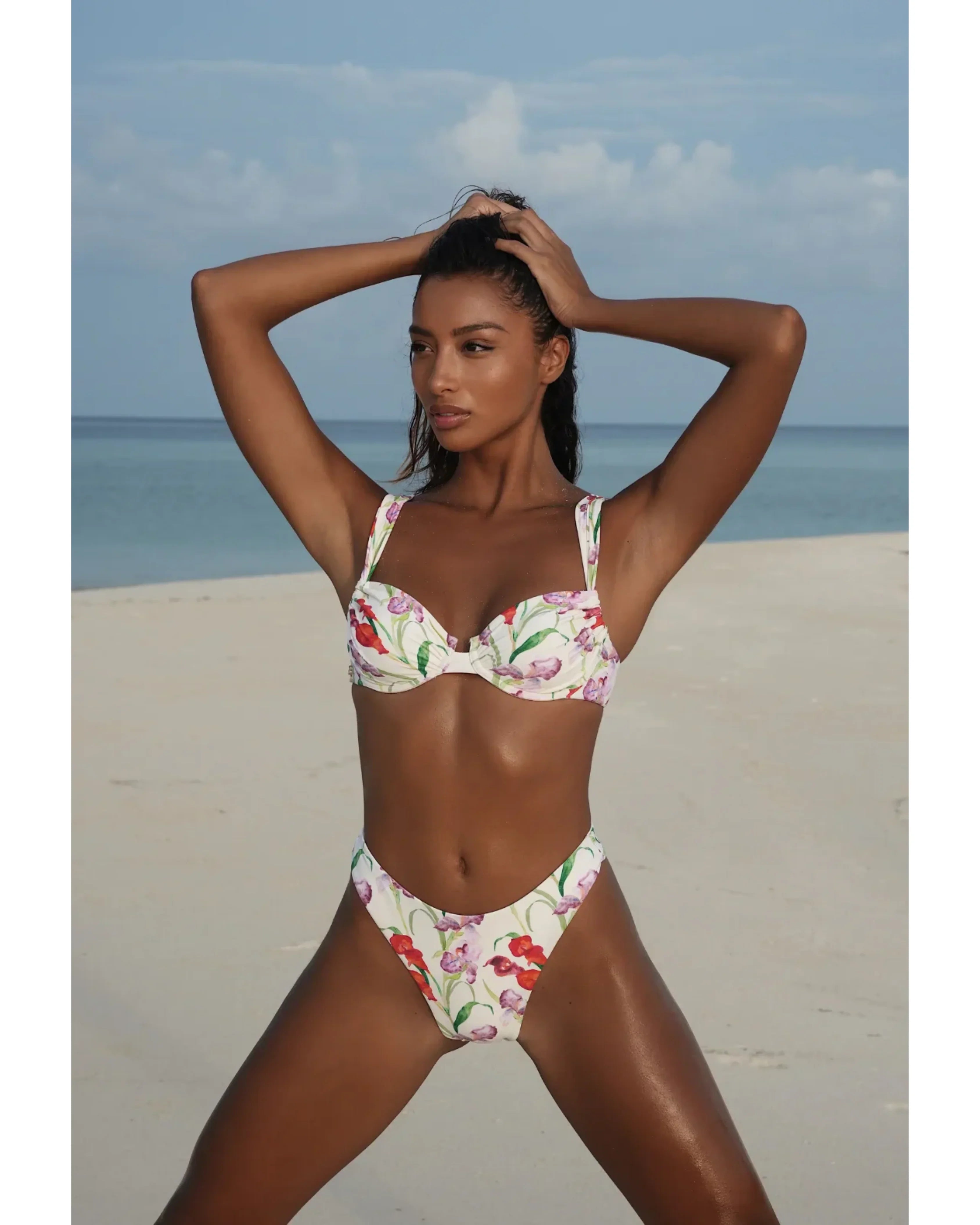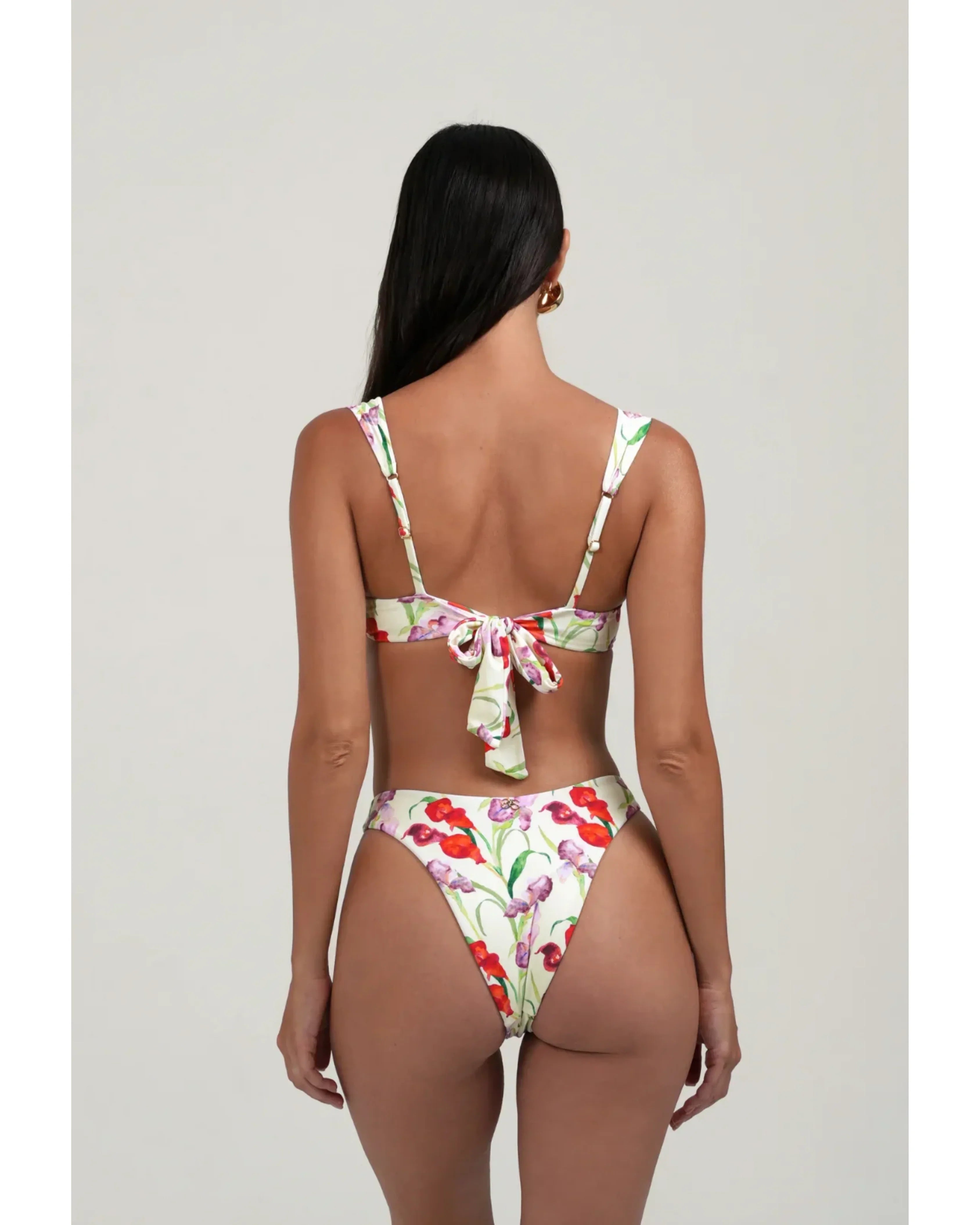 Introducing our best selling adjustable underwire bikini: ‘Hughes’ designed with your support and shape in mind. Gathered cups offer customizable coverage, allowing you to adjust as desired, whilst wide gathered straps ensure comfort without digging into the skin. Adding a unique touch, the dropped centre front and gold Sydney Lane emblem add subtle details for a hint of luxury. Complete with a tie-back closure, you can adjust and tie as desired for the perfect fit. Hughes is double lined in our buttery soft recycled, eco-friendly fabric. Our Gardenia floral print is inspired by a summer meadow and hand painted with love.