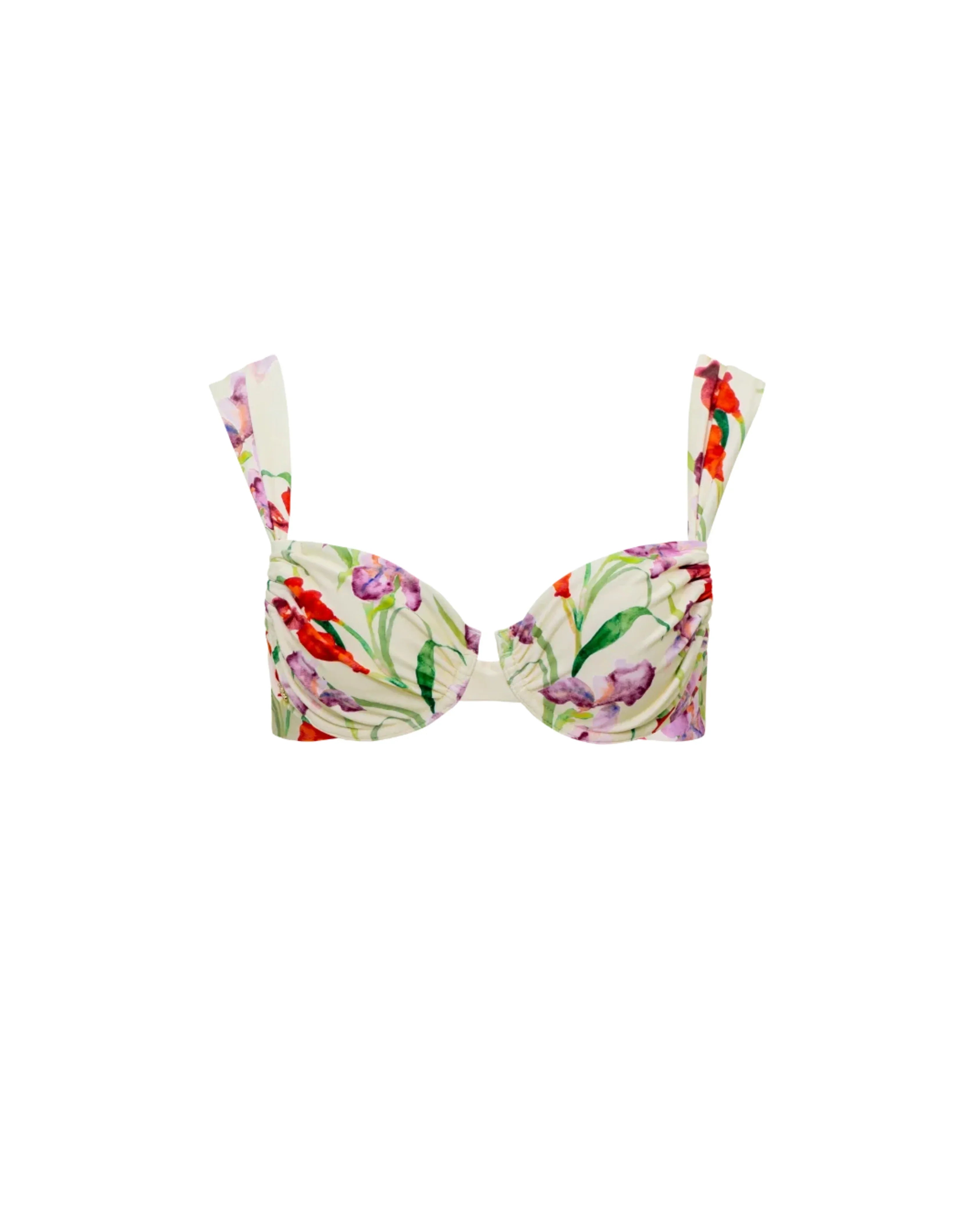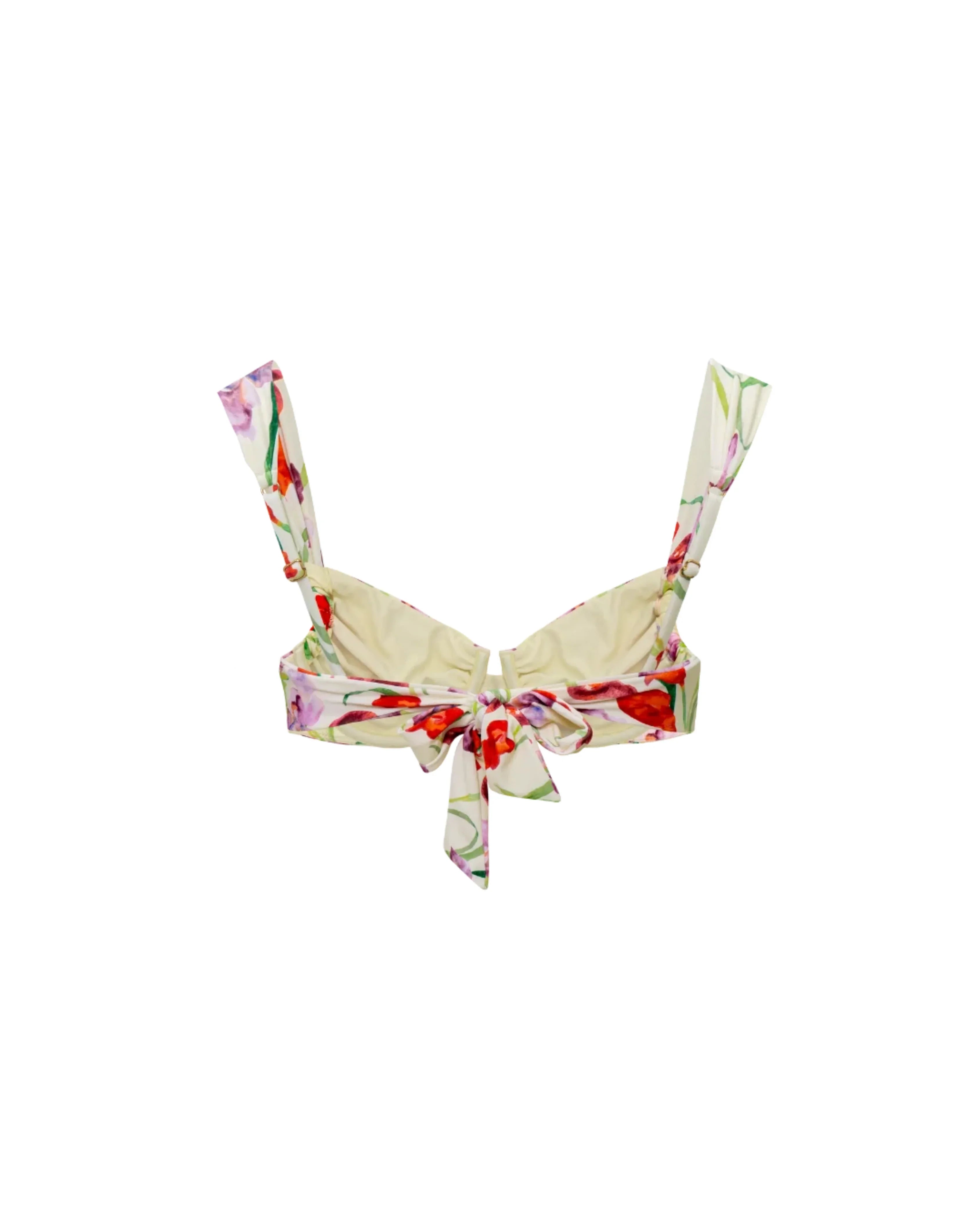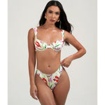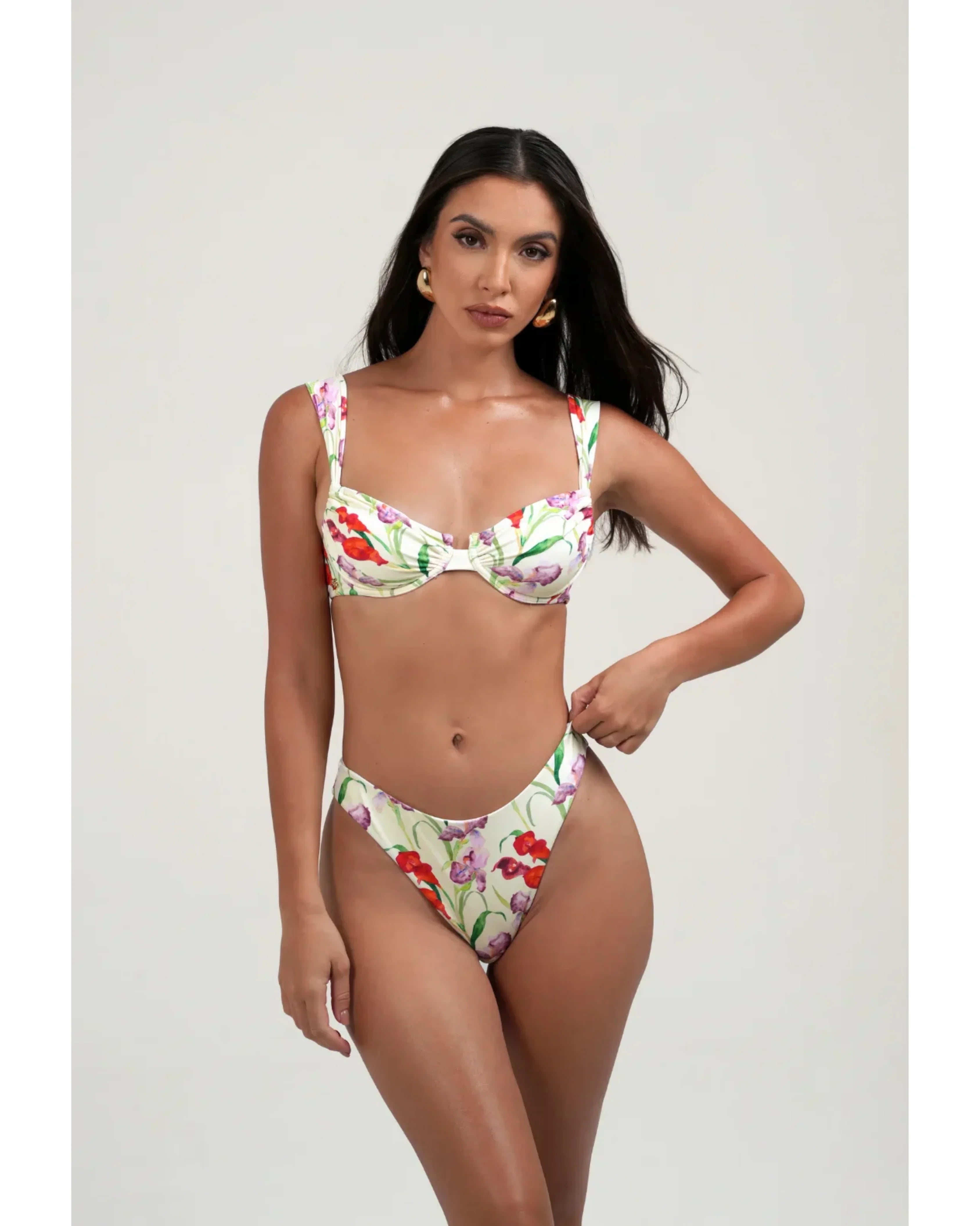 Introducing our best selling adjustable underwire bikini: ‘Hughes’ designed with your support and shape in mind. Gathered cups offer customizable coverage, allowing you to adjust as desired, whilst wide gathered straps ensure comfort without digging into the skin. Adding a unique touch, the dropped centre front and gold Sydney Lane emblem add subtle details for a hint of luxury. Complete with a tie-back closure, you can adjust and tie as desired for the perfect fit. Hughes is double lined in our buttery soft recycled, eco-friendly fabric. Our Gardenia floral print is inspired by a summer meadow and hand painted with love.