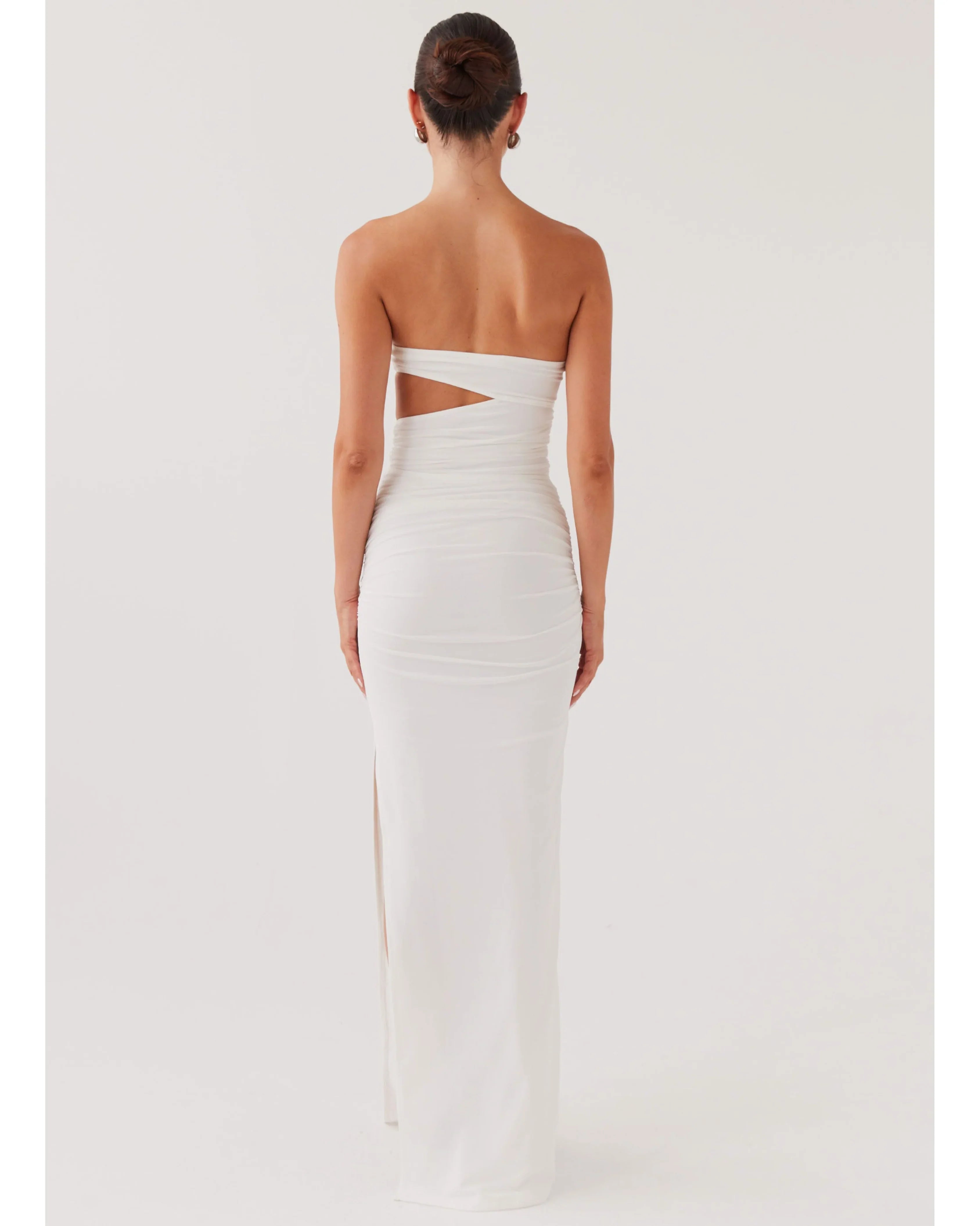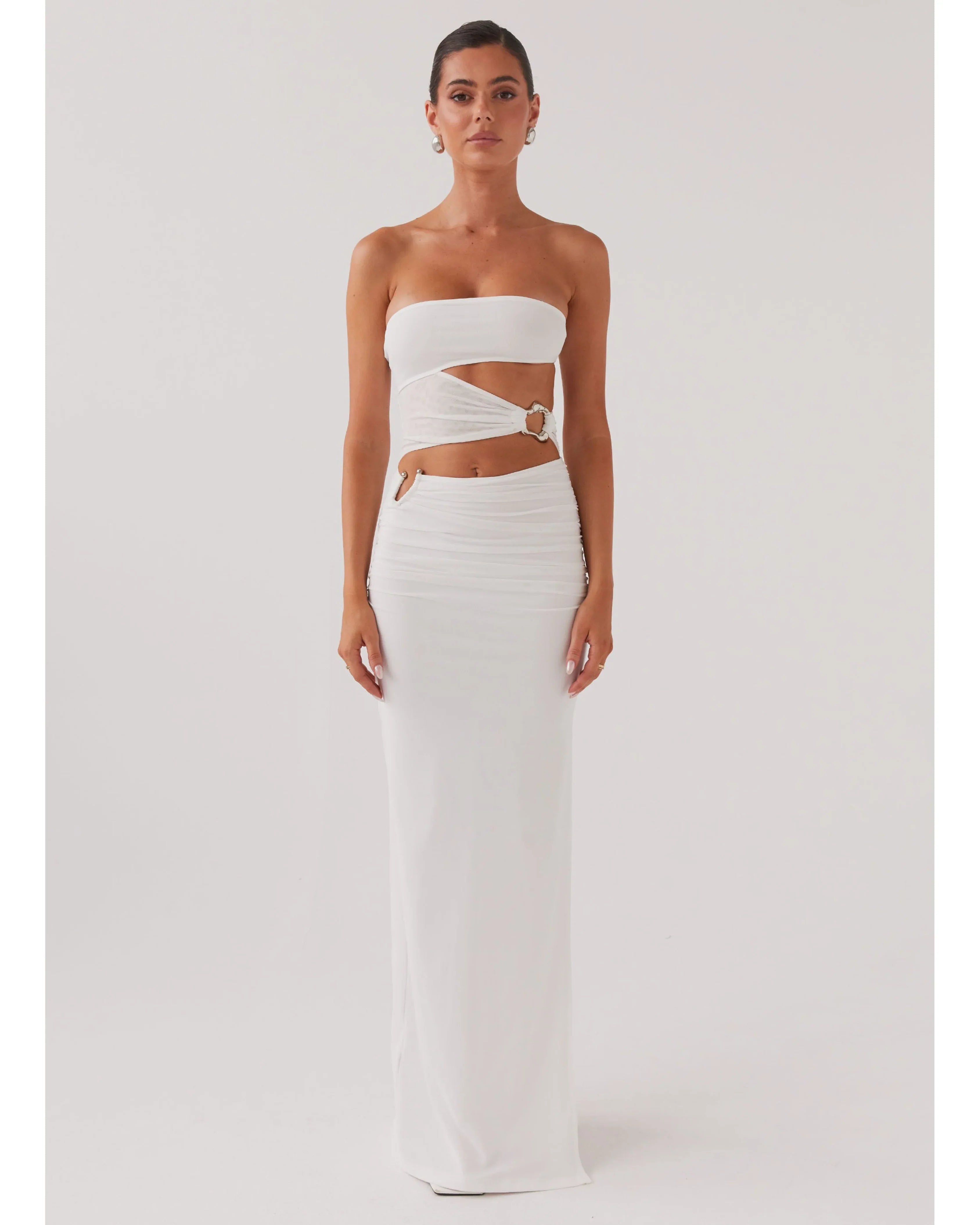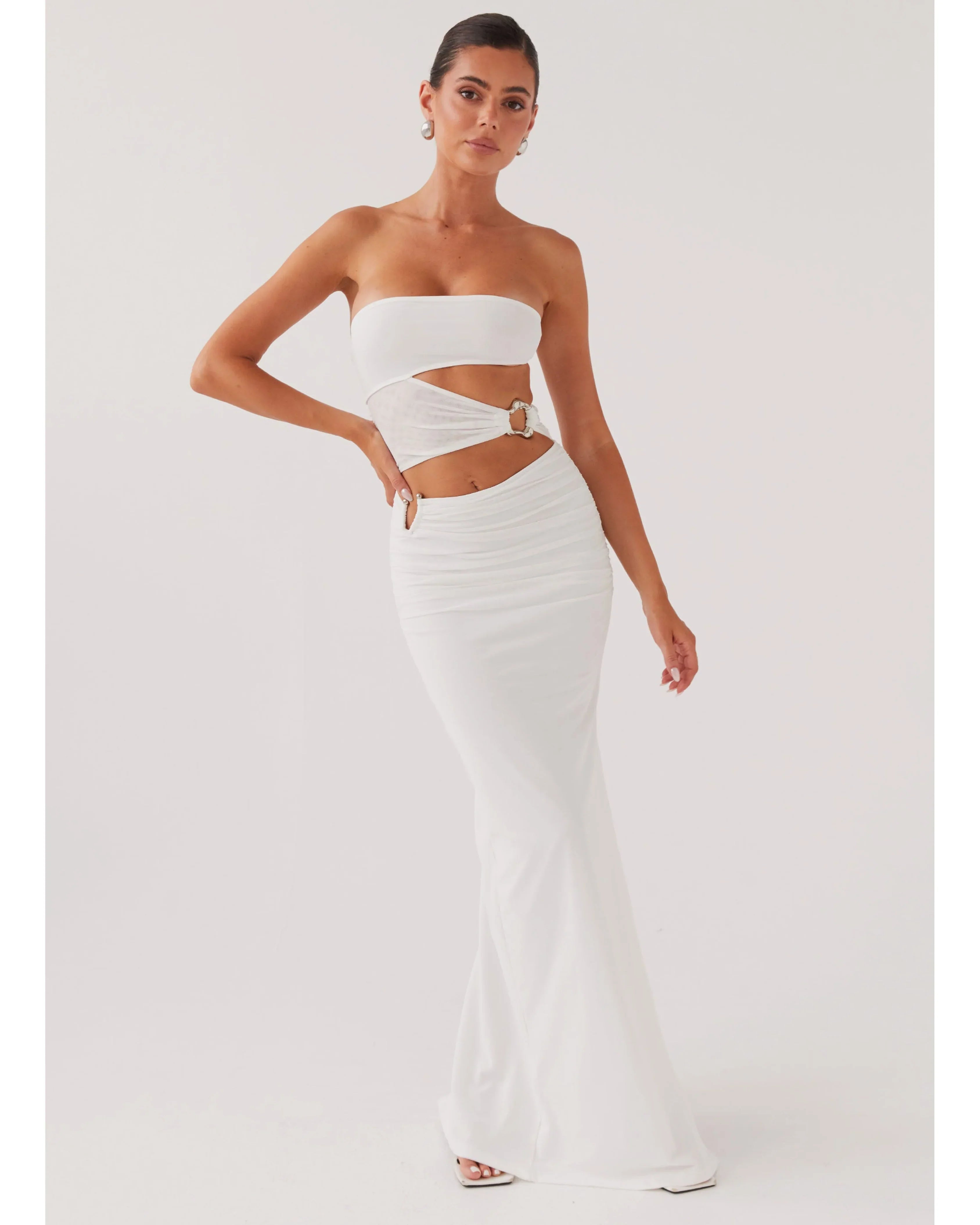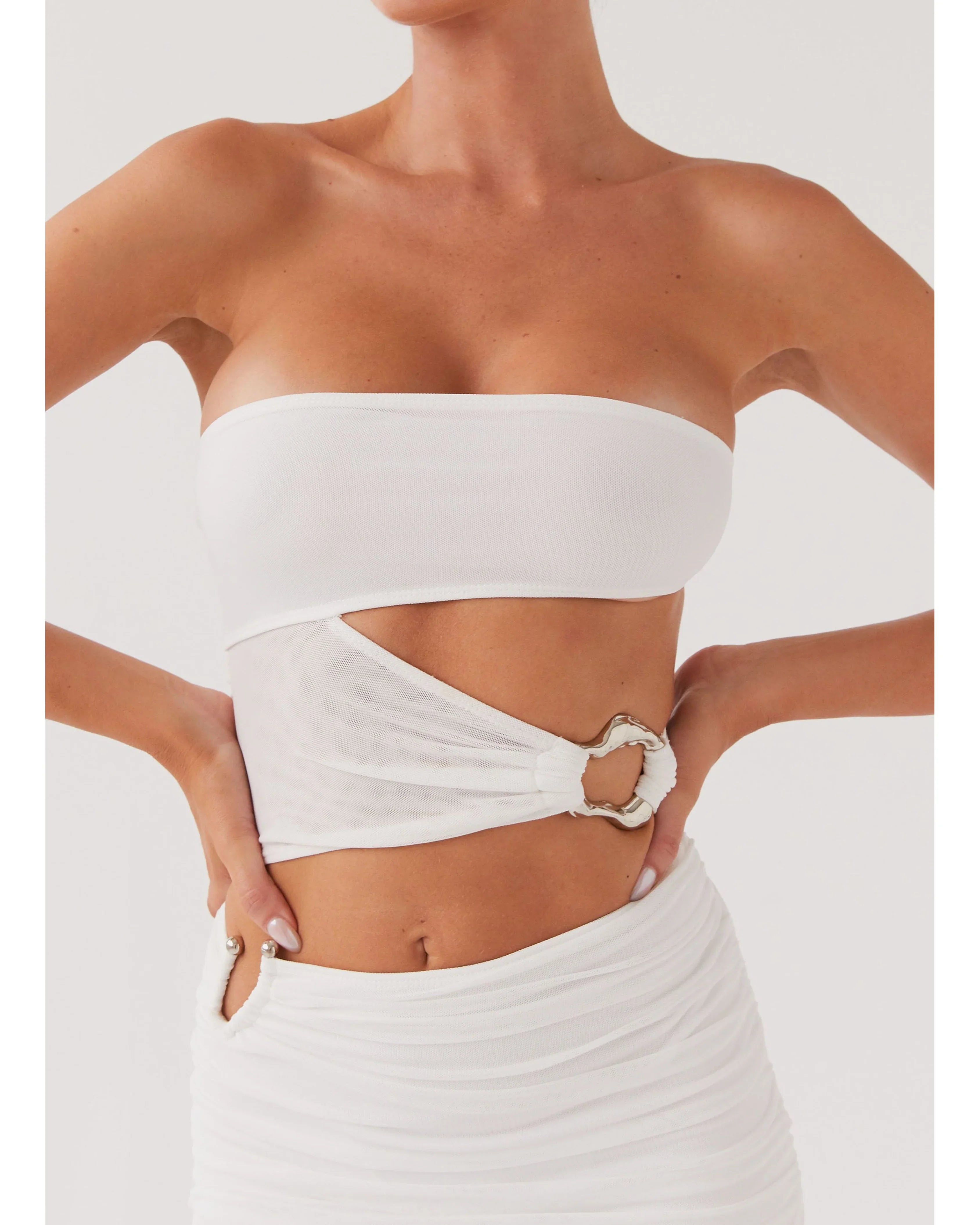 The Into Pieces Mesh Maxi Dress, a vision in stunning white. Crafted in a delicate mesh fabric, this strapless maxi dress exudes elegance. Best styled with heels, it's the perfect choice for your next event under the golden skies and captivating nightclub silhouettes.