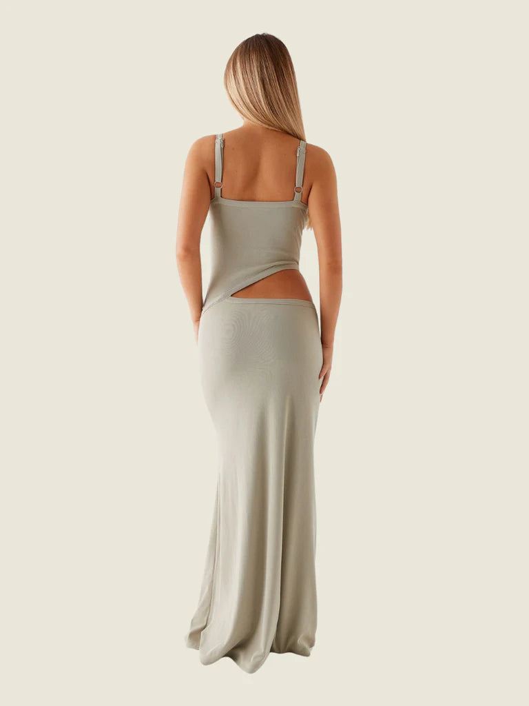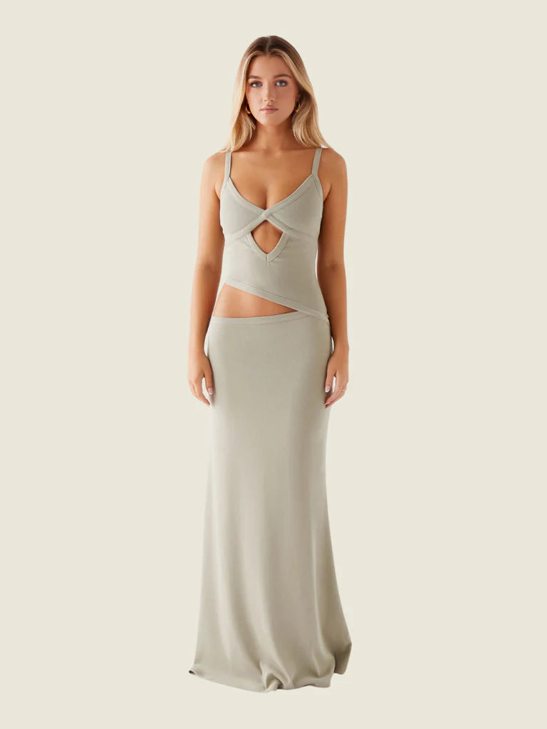 The Jocelyn Maxi Dress features a V neckline that enhances your natural shape, with cut-out detailing for an added edge. Crafted from stretch material, it offers a comfortable, body-hugging fit that moves with you.