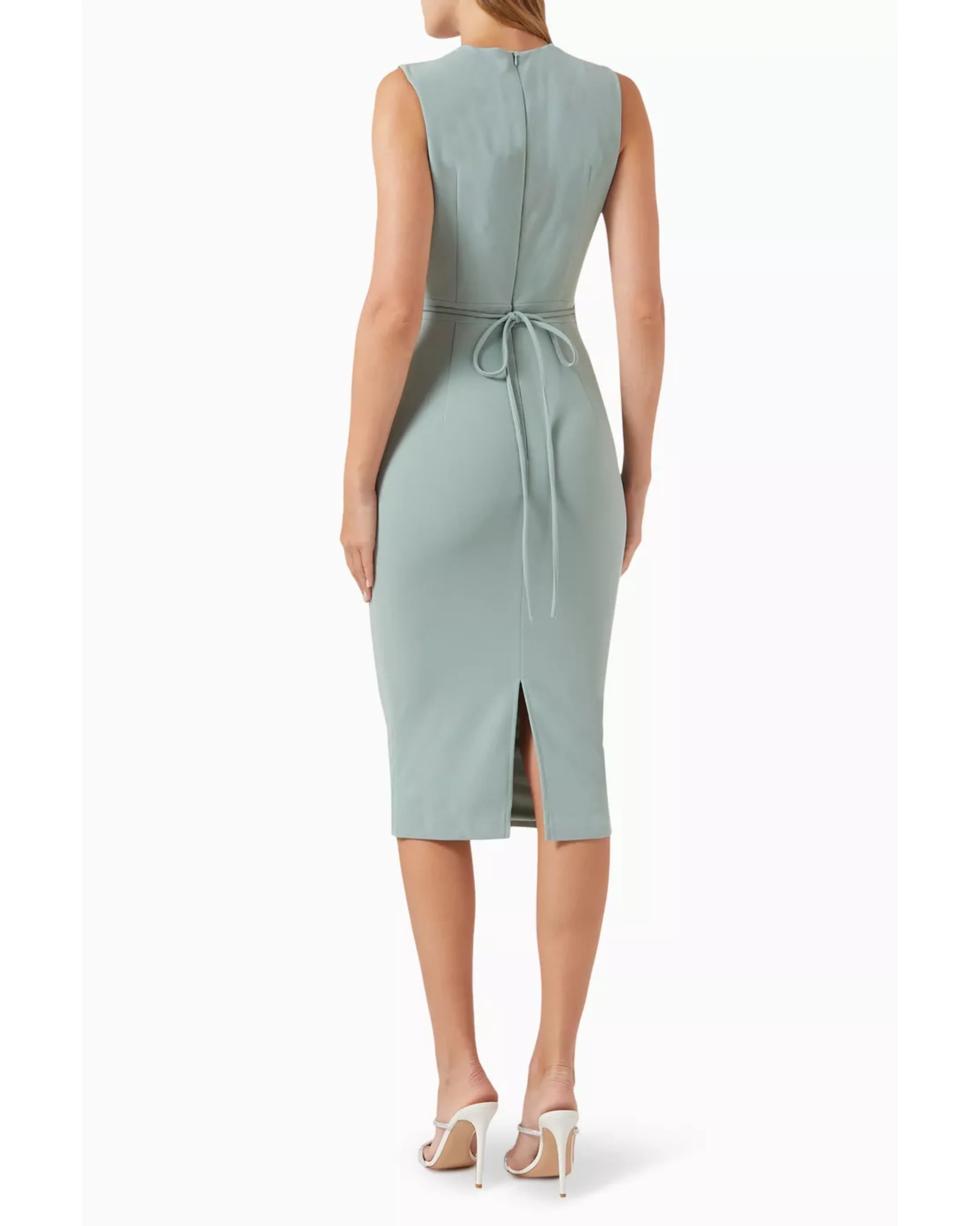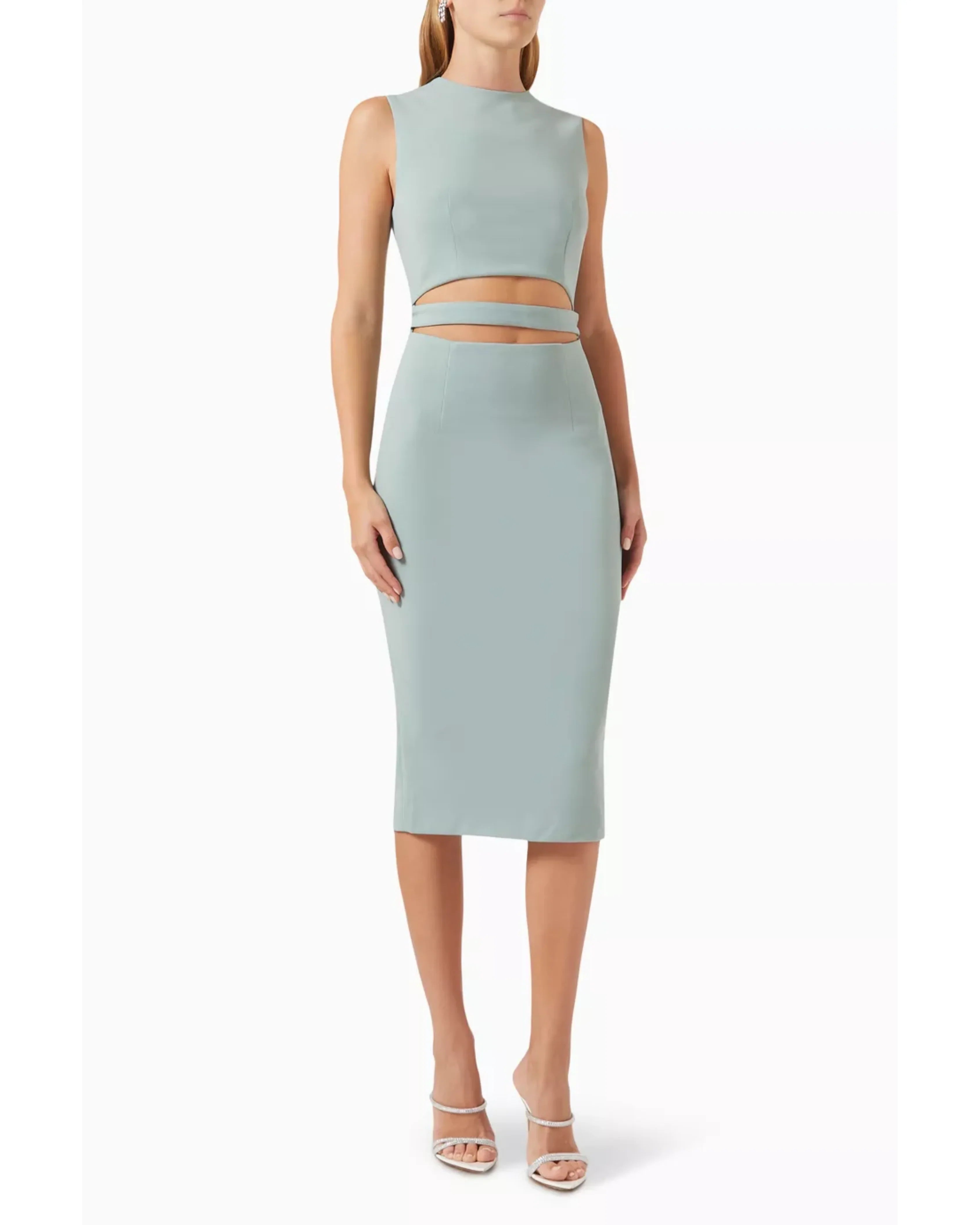 Crafted with care and attention to detail, this dress is sure to make you feel confident and beautiful, whether you're attending a formal event or enjoying a night out with friends. With a high neck midi design that's perfect for any occasion, this dress features a striking front waist cut-out and tie-up detail that adds a touch of flirtatiousness to its overall elegance.