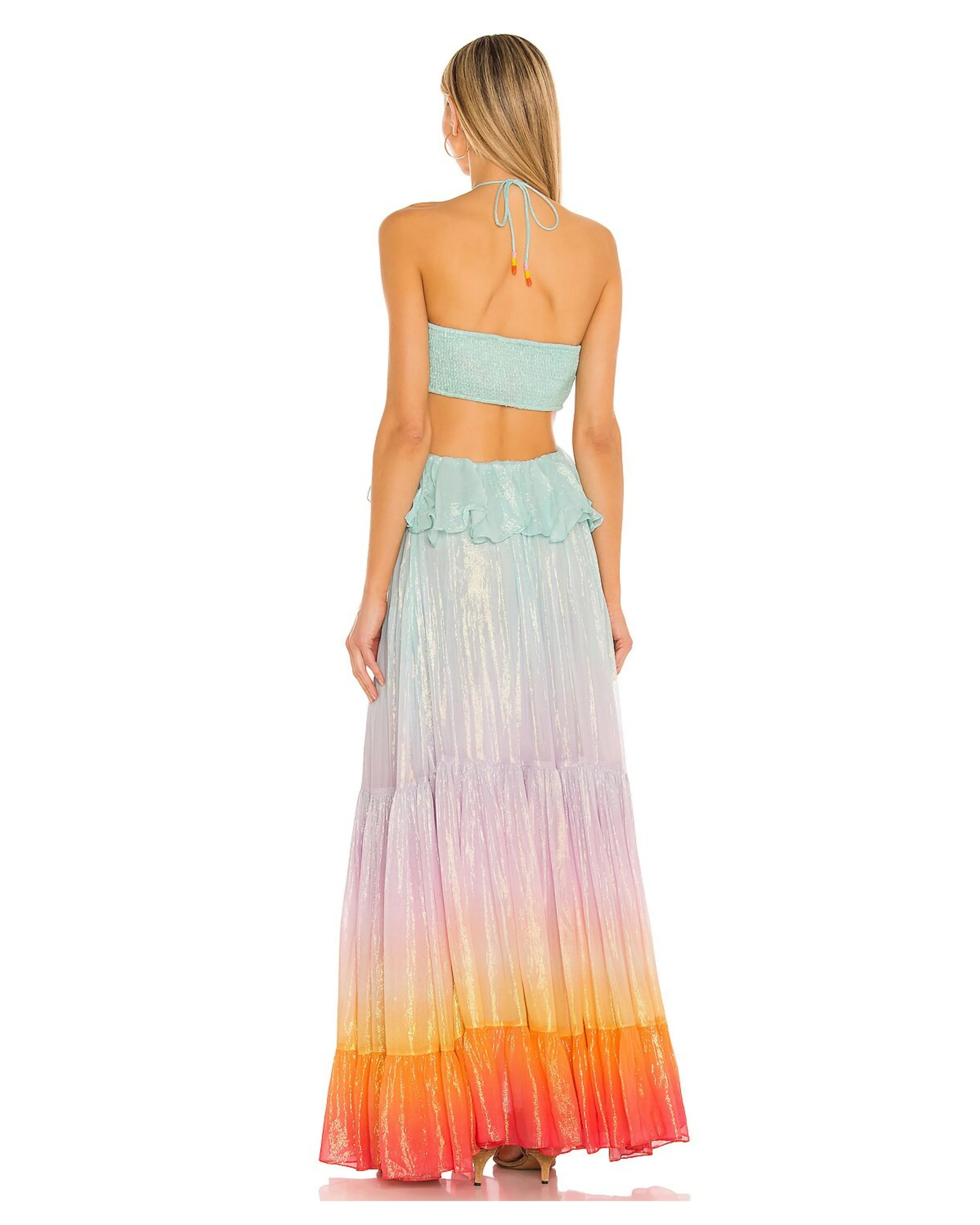 Self: 85% viscose, 15% metallized fiber. Lining: 100% viscose. Partially lined. Pull-on styling. Due to the unique wash, colors and patterns may vary slightly. Lightweight flowy fabric with metallic threading.