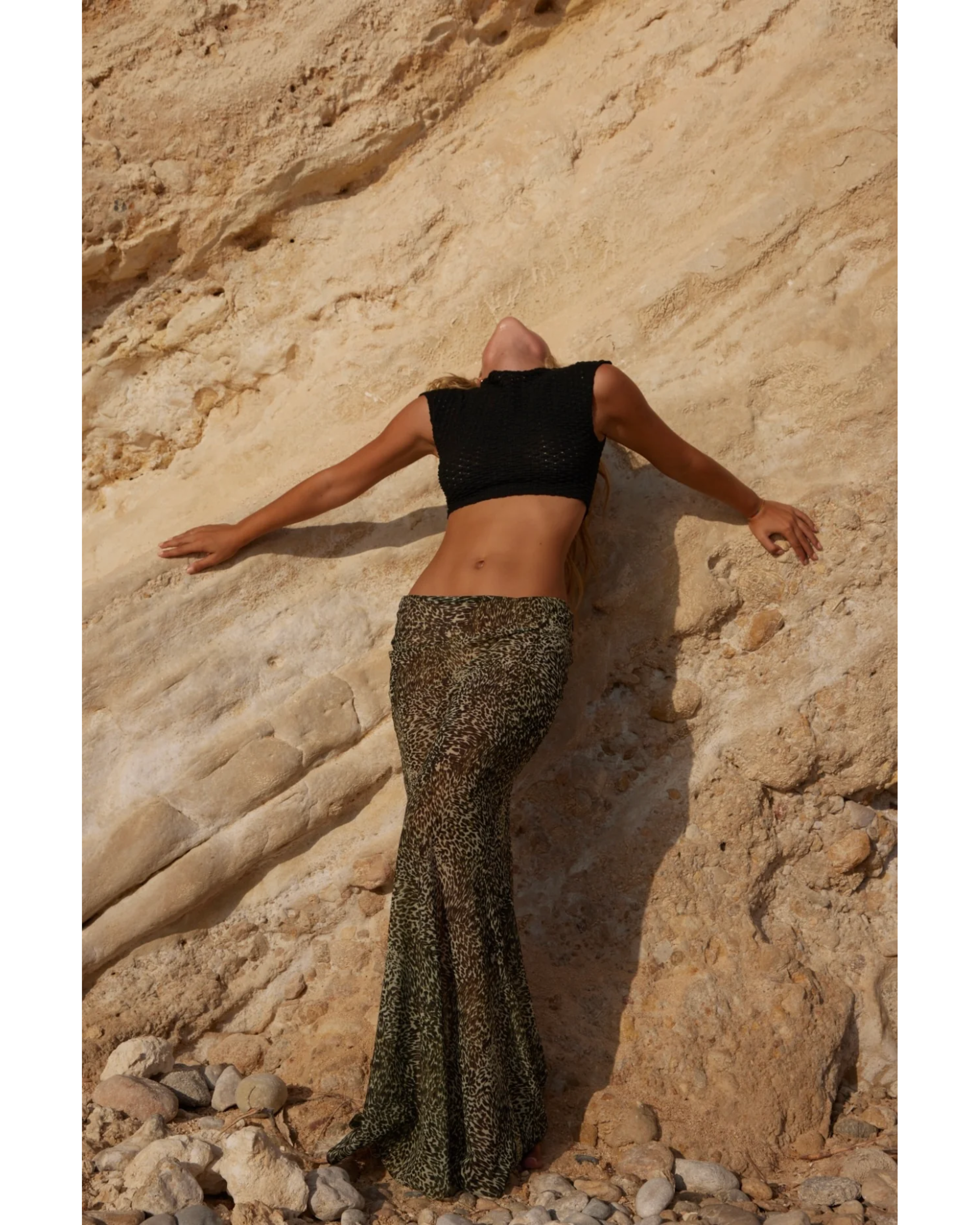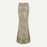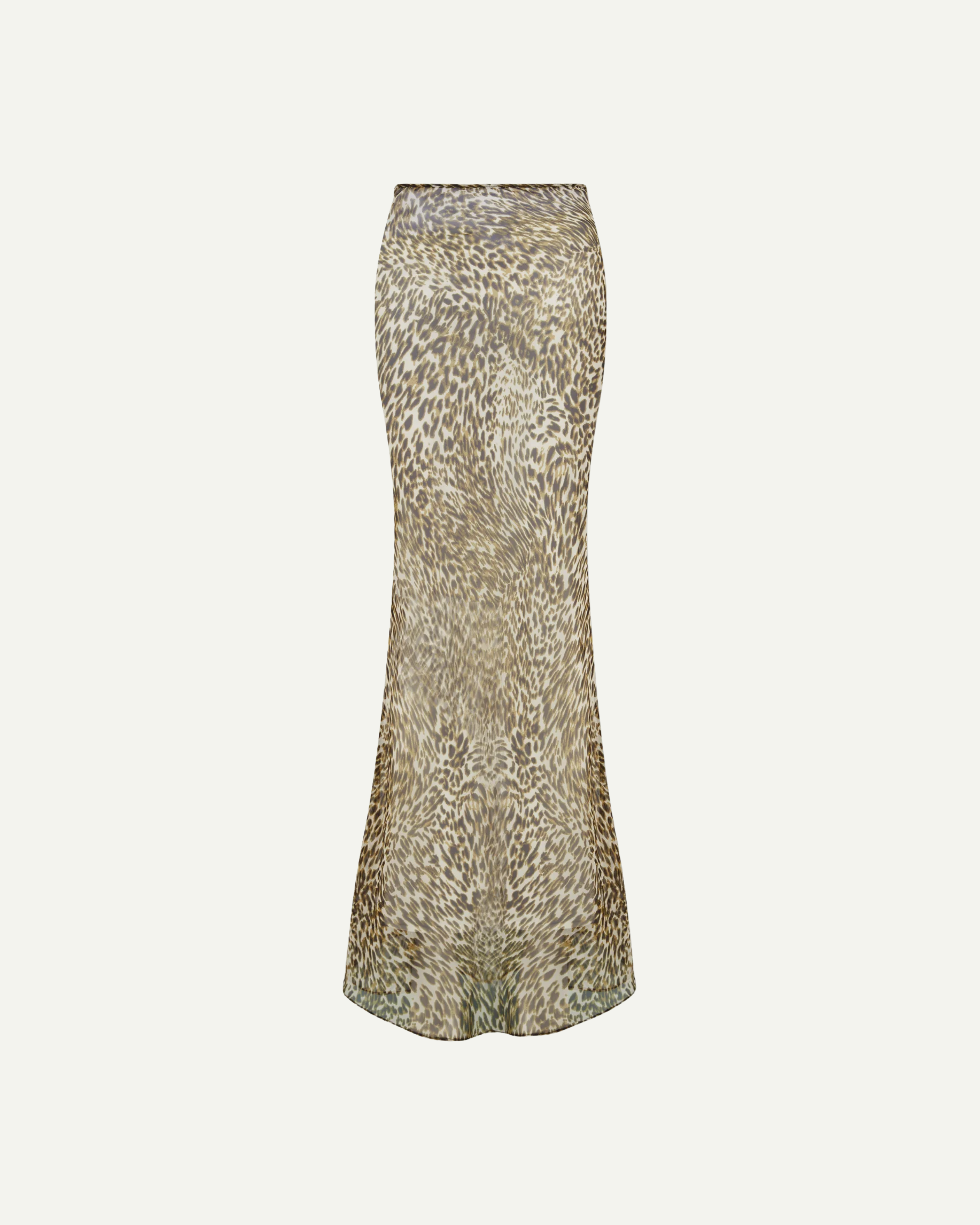 This elegant maxi skirt features a semi-sheer leopard print with subtle green and brown tones. Crafted from Italian chiffon with a bias cut, it includes a discreet side zip for a refined fit.