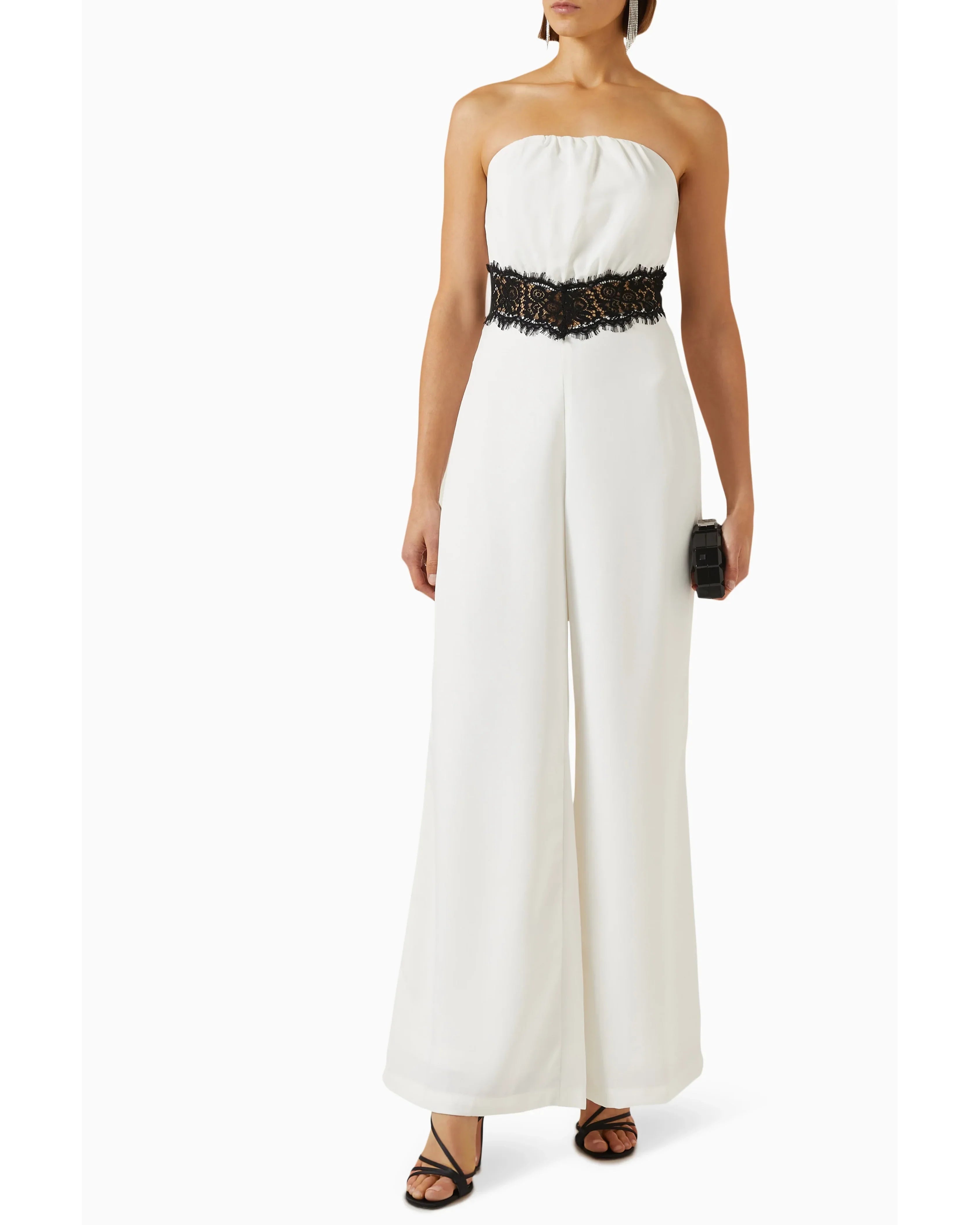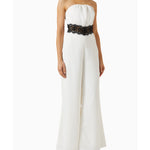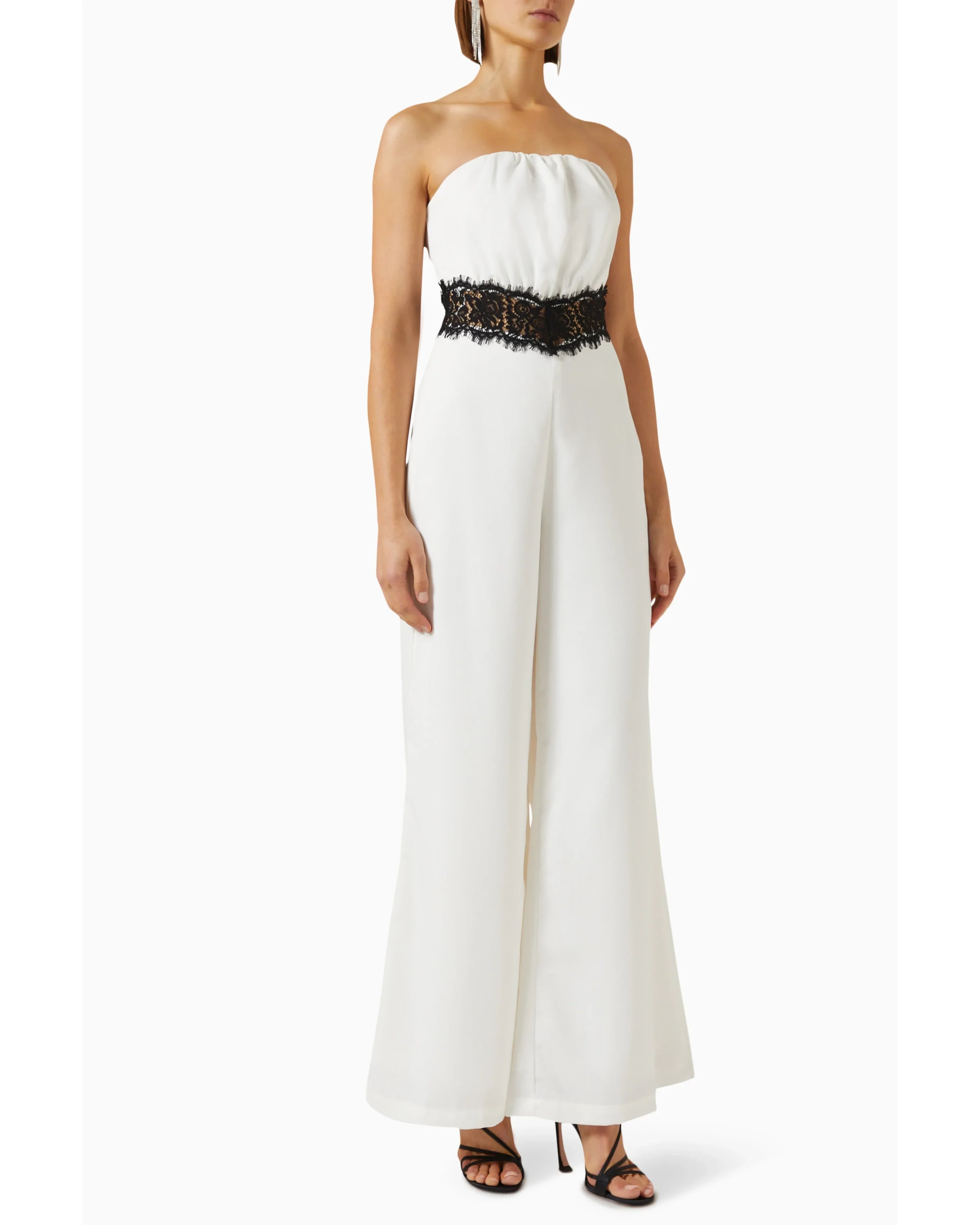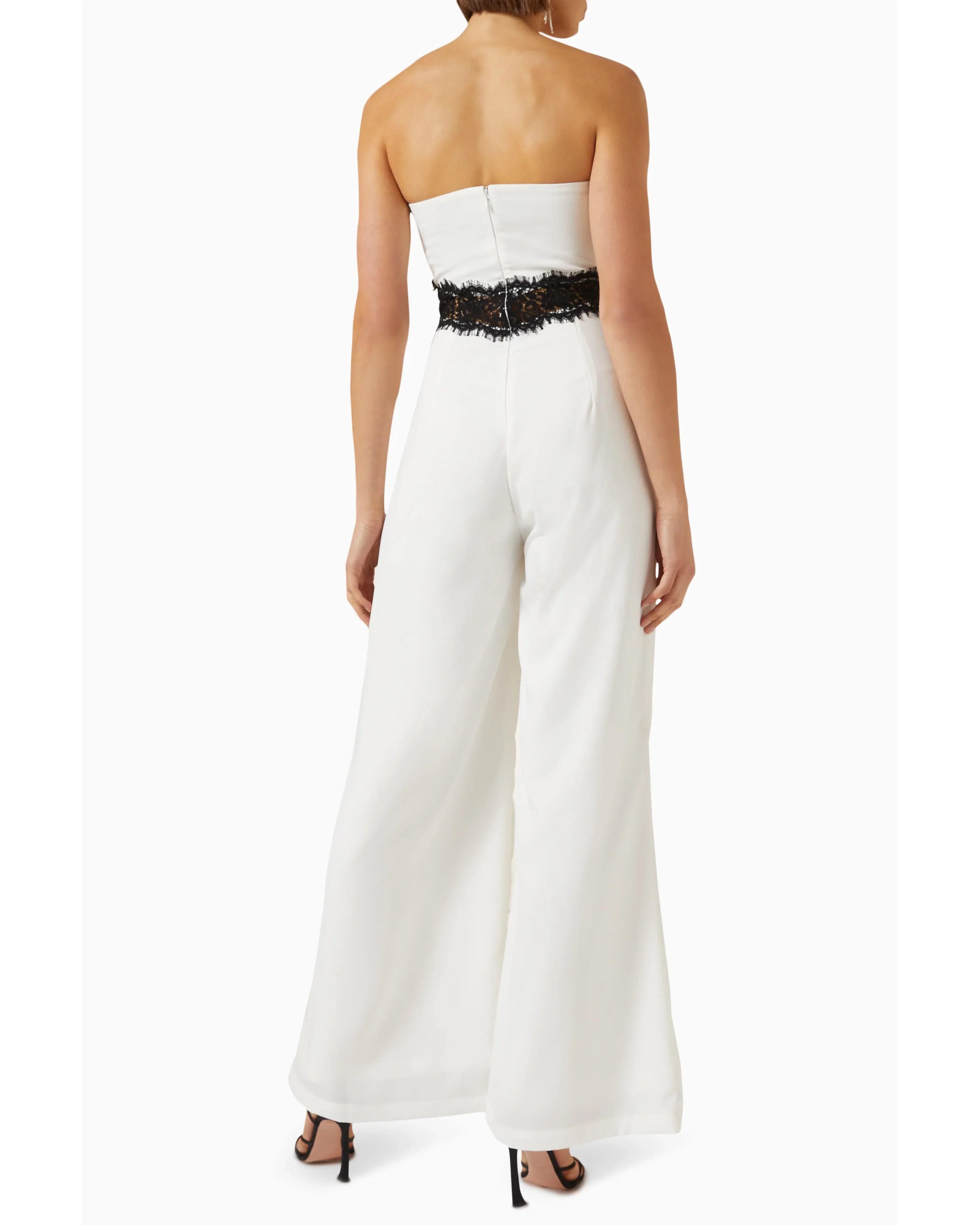 The Elle Zeitoune Lindsey Jumpsuit epitomizes elegance with its strapless silhouette, delicate sheer lace waistband, and gracefully gathered top. The wide-leg pant exudes sophistication, making it a captivating choice for those seeking a timeless and chic ensemble.