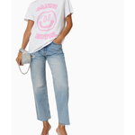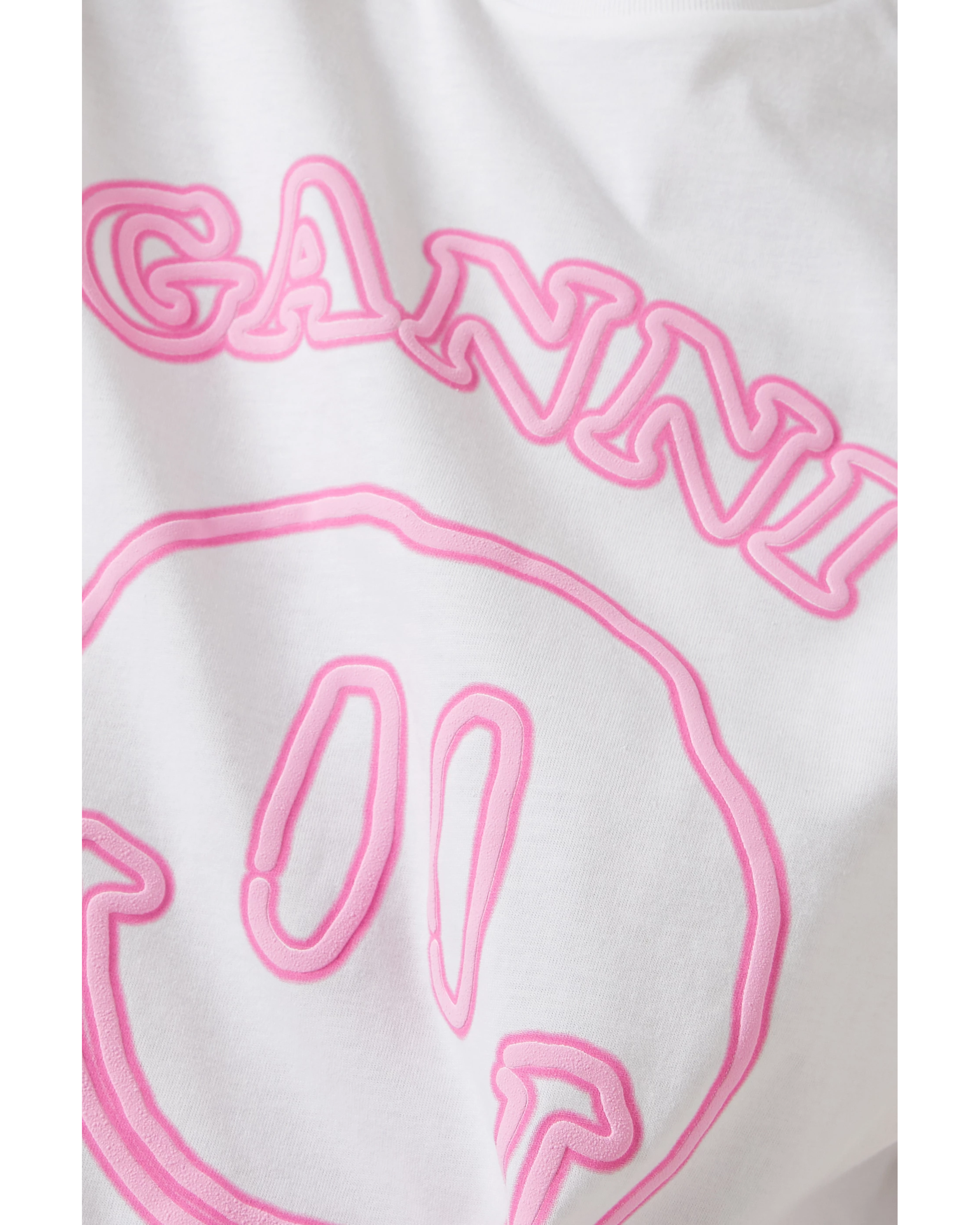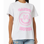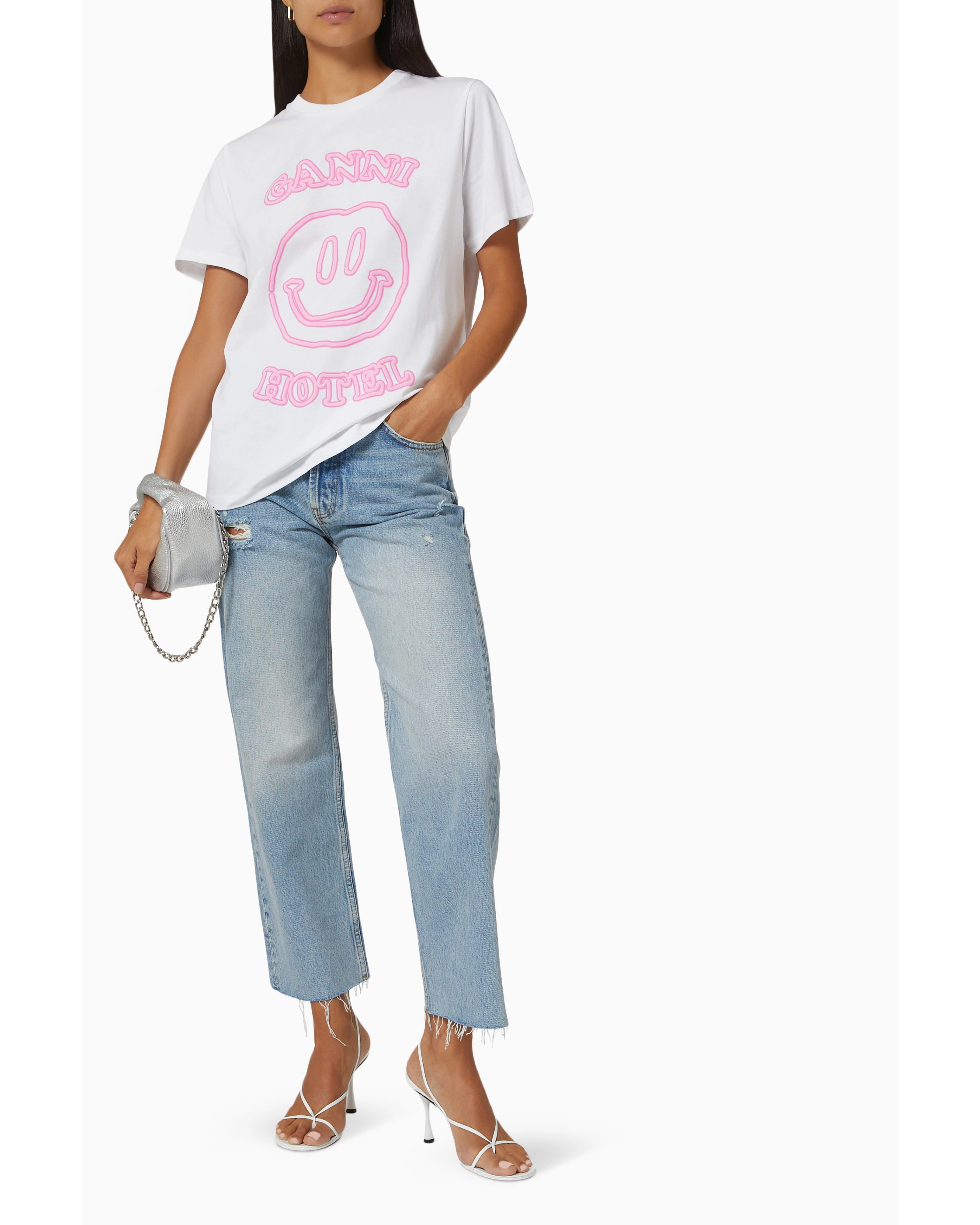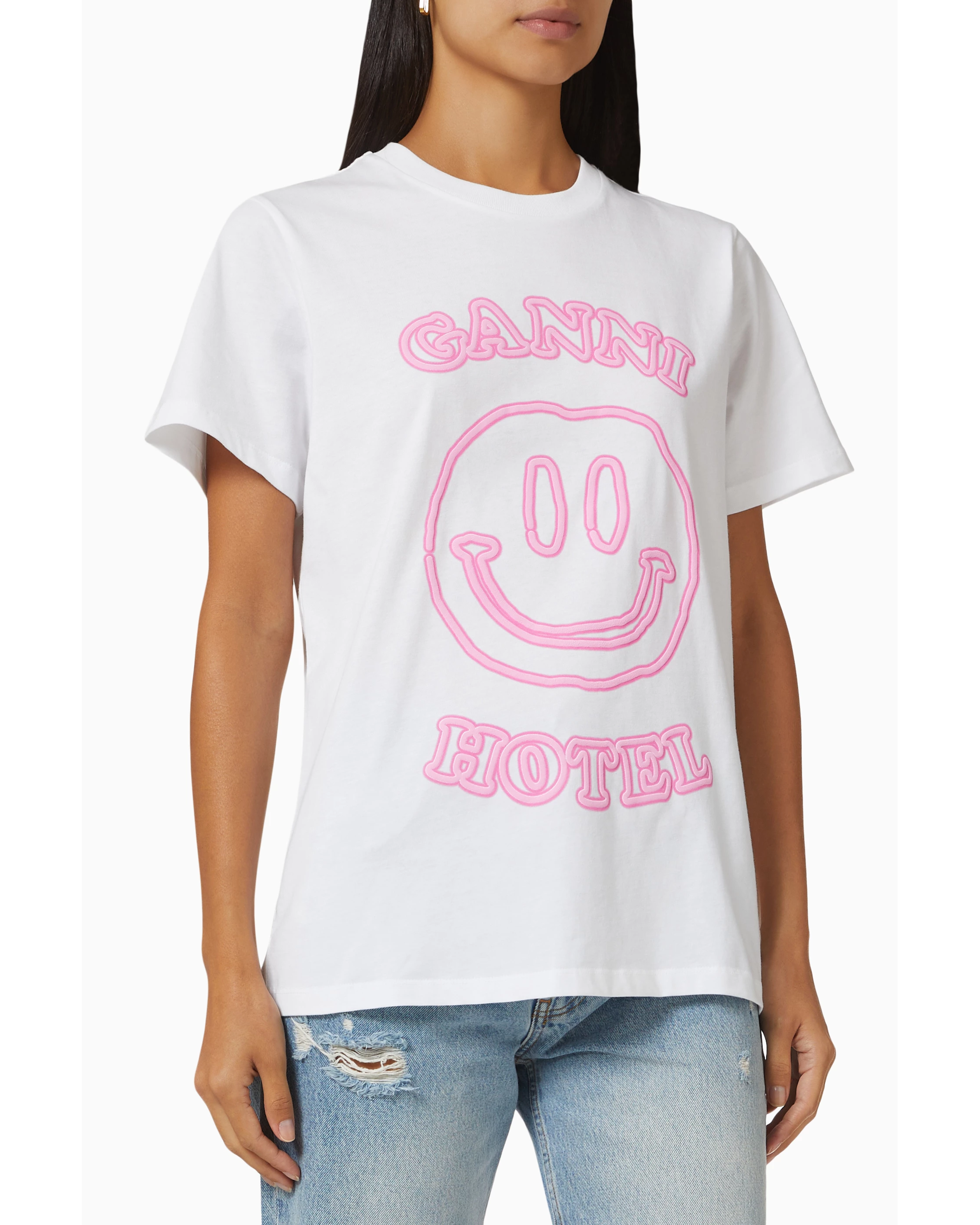 This Ganni T-shirt is crafted from organic cotton, reflecting the Danish label's commitment to sustainability. Simple and versatile with a crewneck and short sleeves, this must-have casual top is finished with a signature Ganni Hotel print and smiley face graphic.