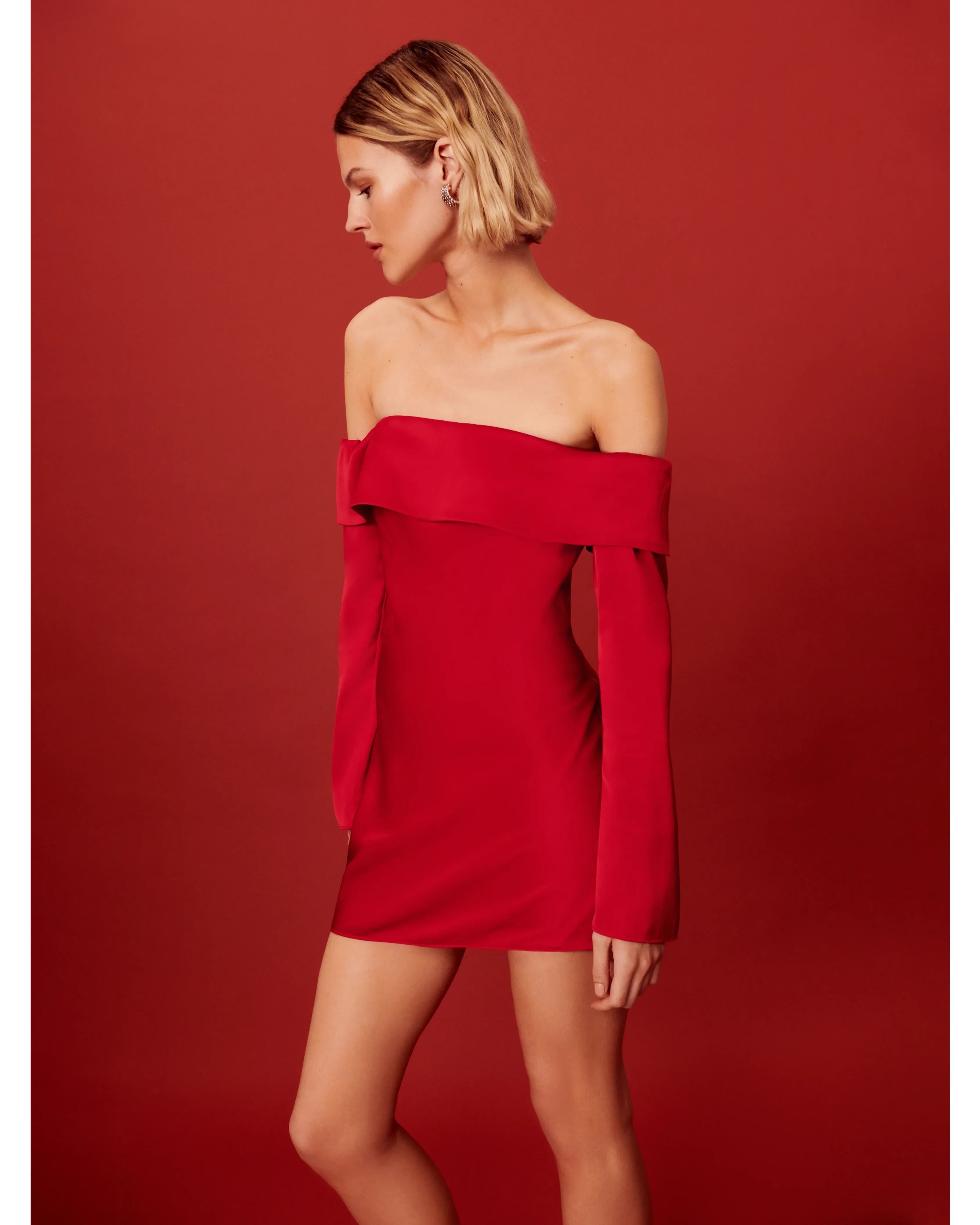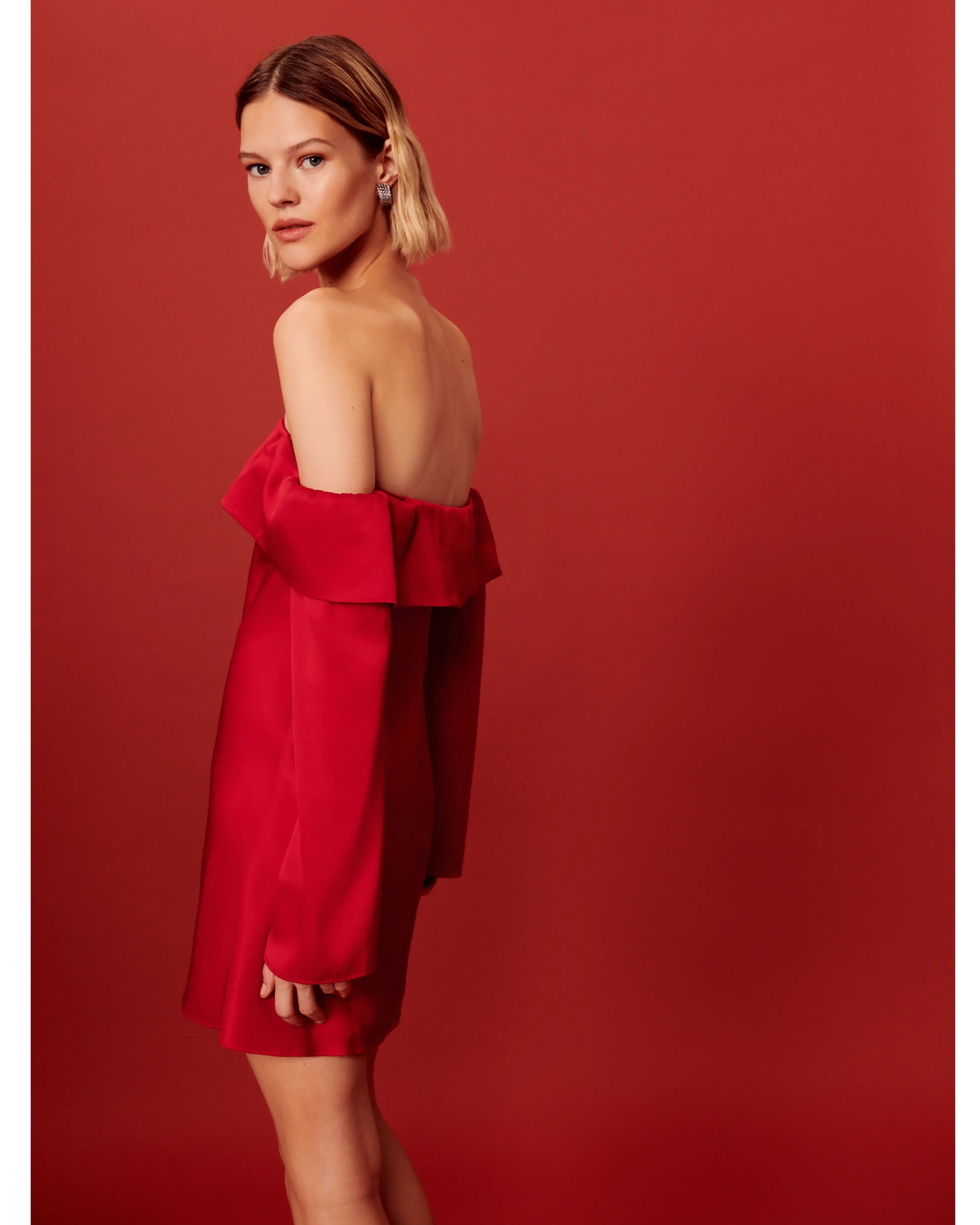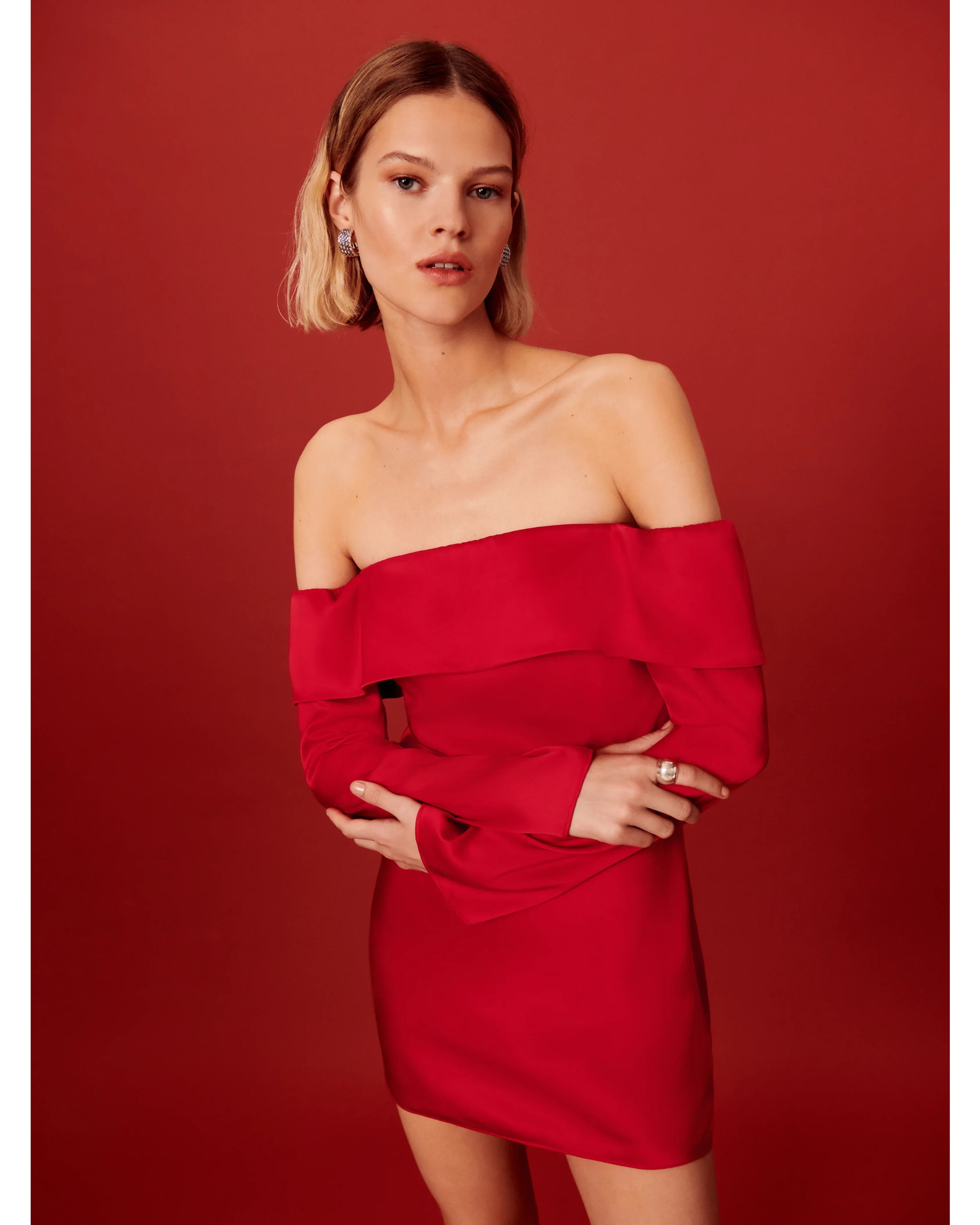 Fitted throughout, off-the-shoulder neckline, lined. Double satin: 88% Naia Renew Acetate, 12% Polyester. Runs small, dry clean only.