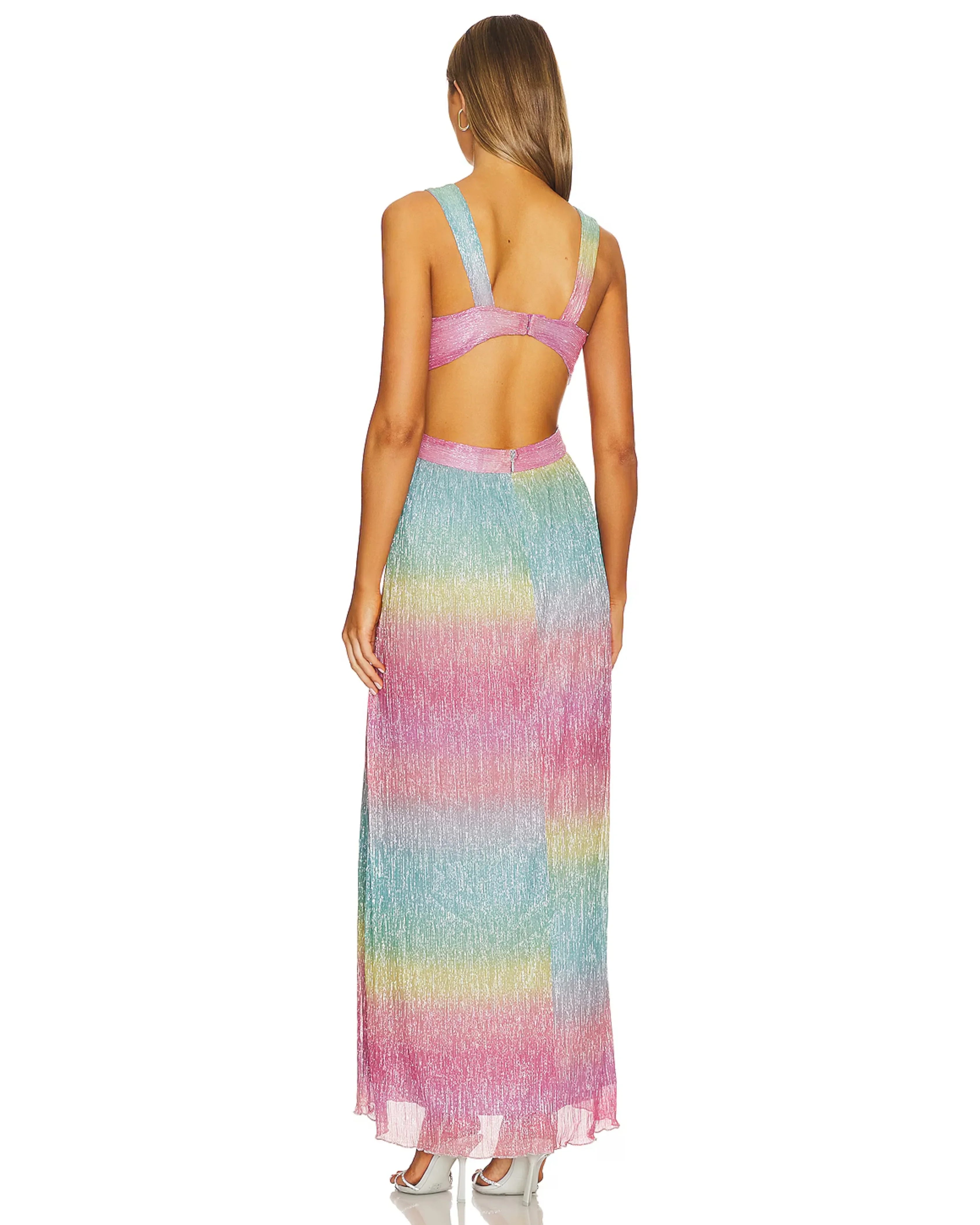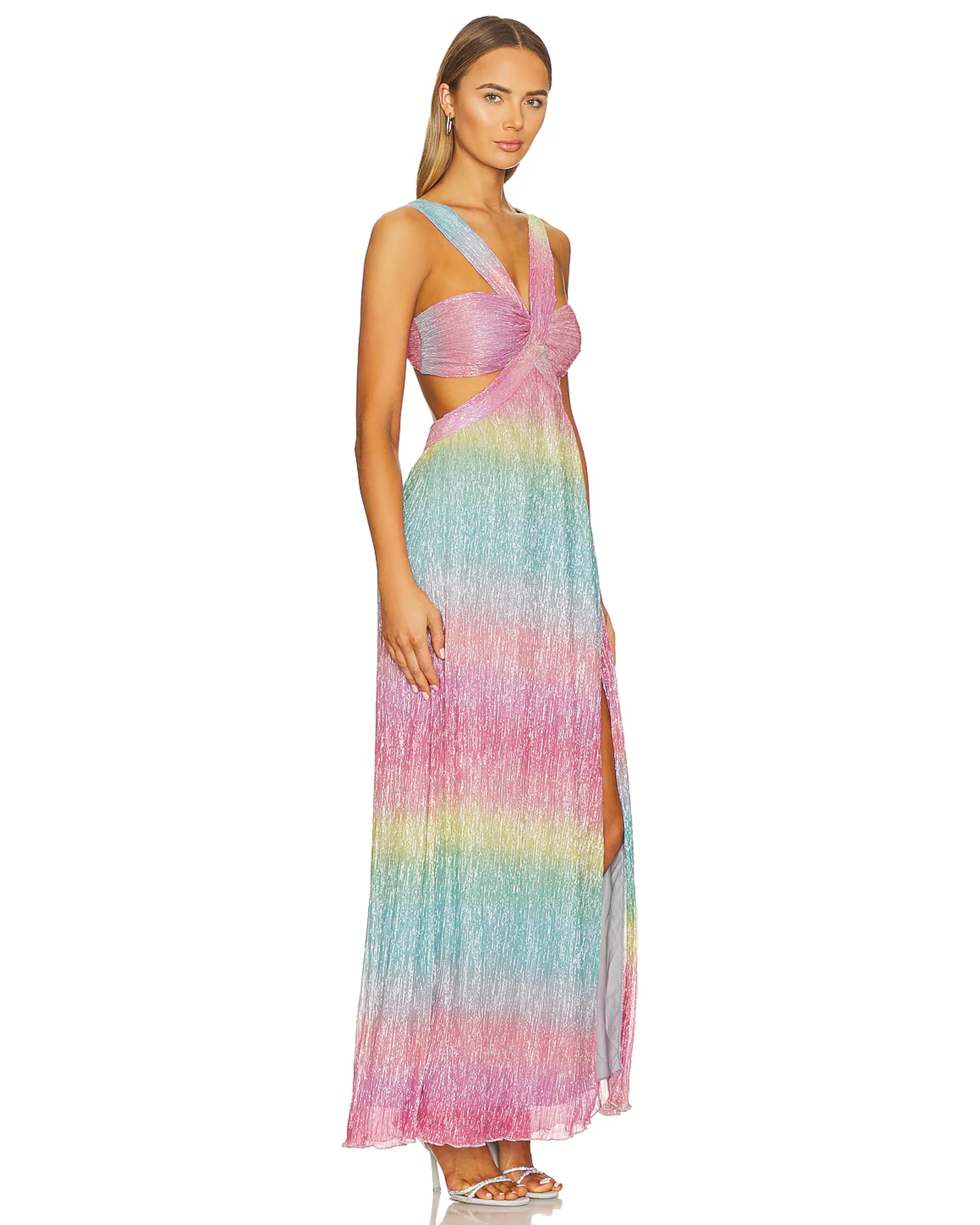 - Lightweight fabric with metallic threading throughout and surplice hem.