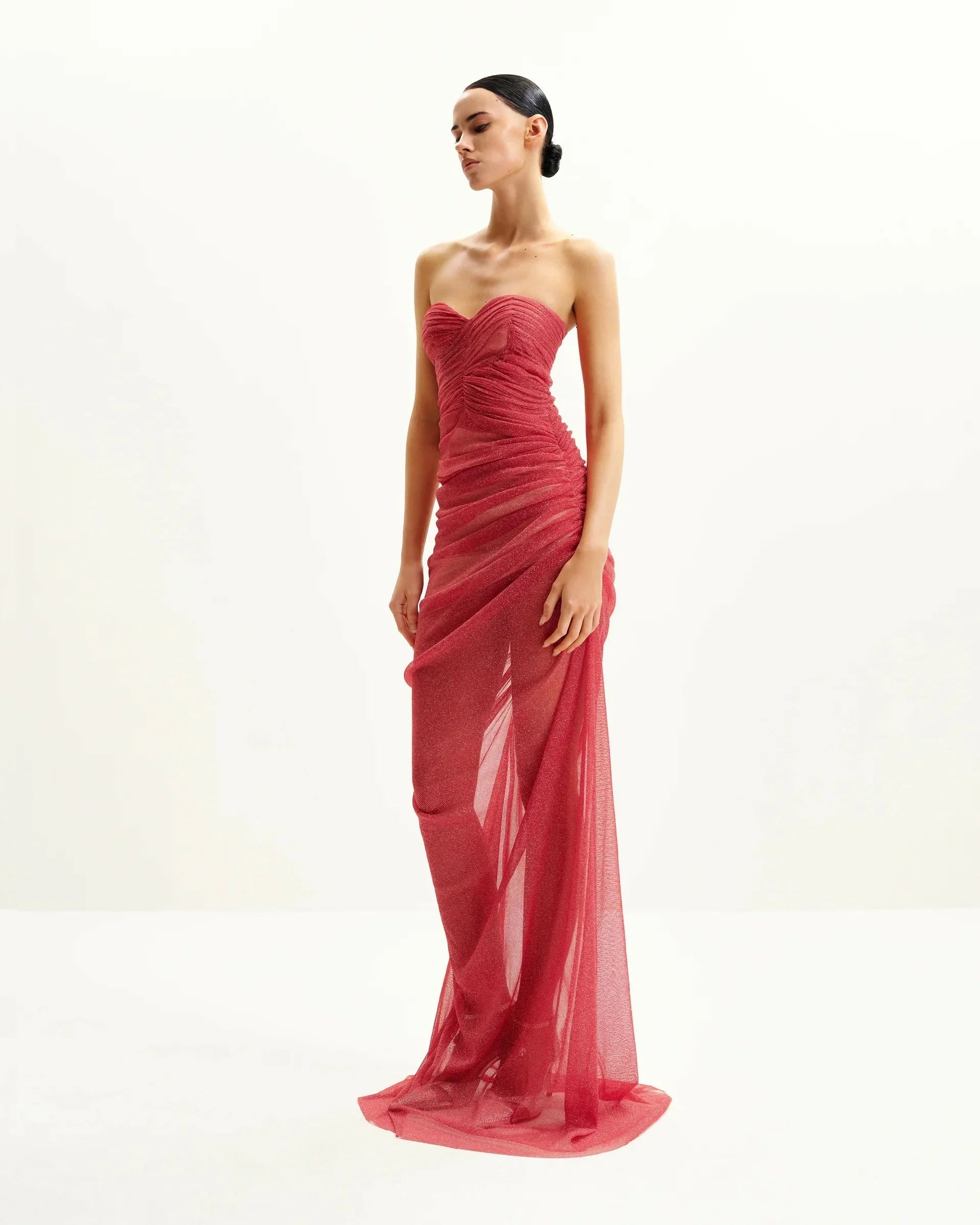 Mia Strapless Sheer Glitter Gown - Scarlet