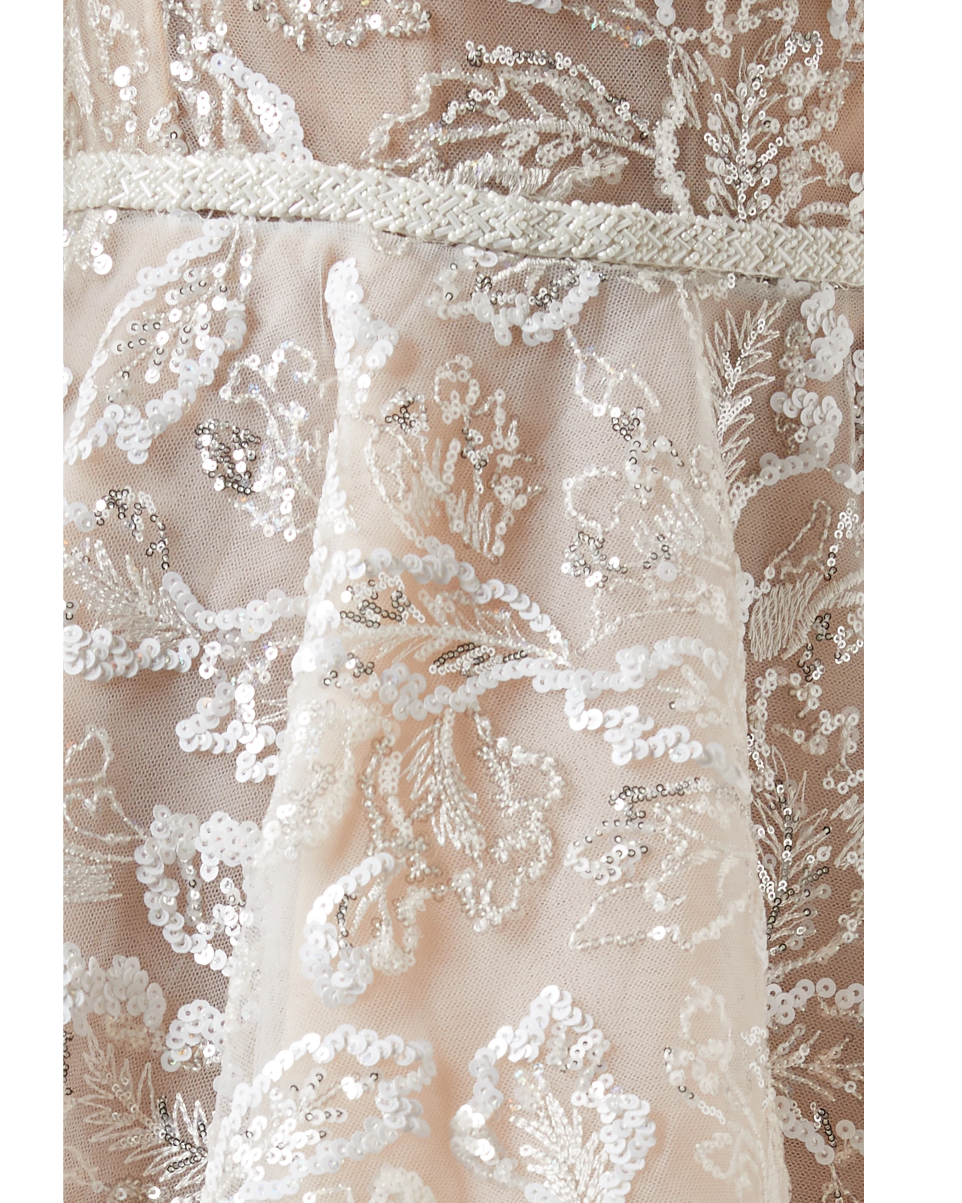 The Bronx & Banco Midnight Bridal Dress is designed for special occasions. Its boned bodice provides secure support, while the sequin-embellished tulle skirt maintains its structured shape.