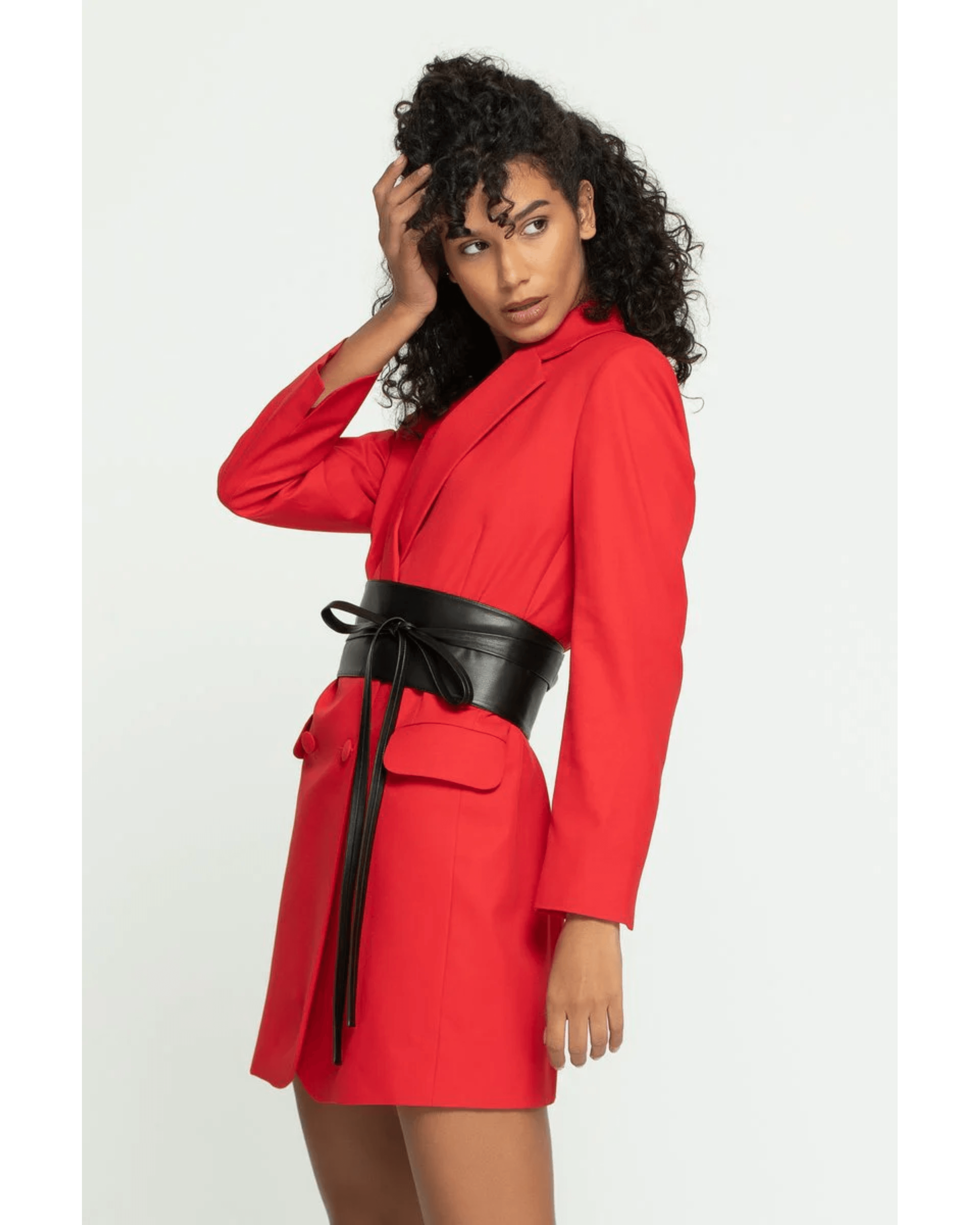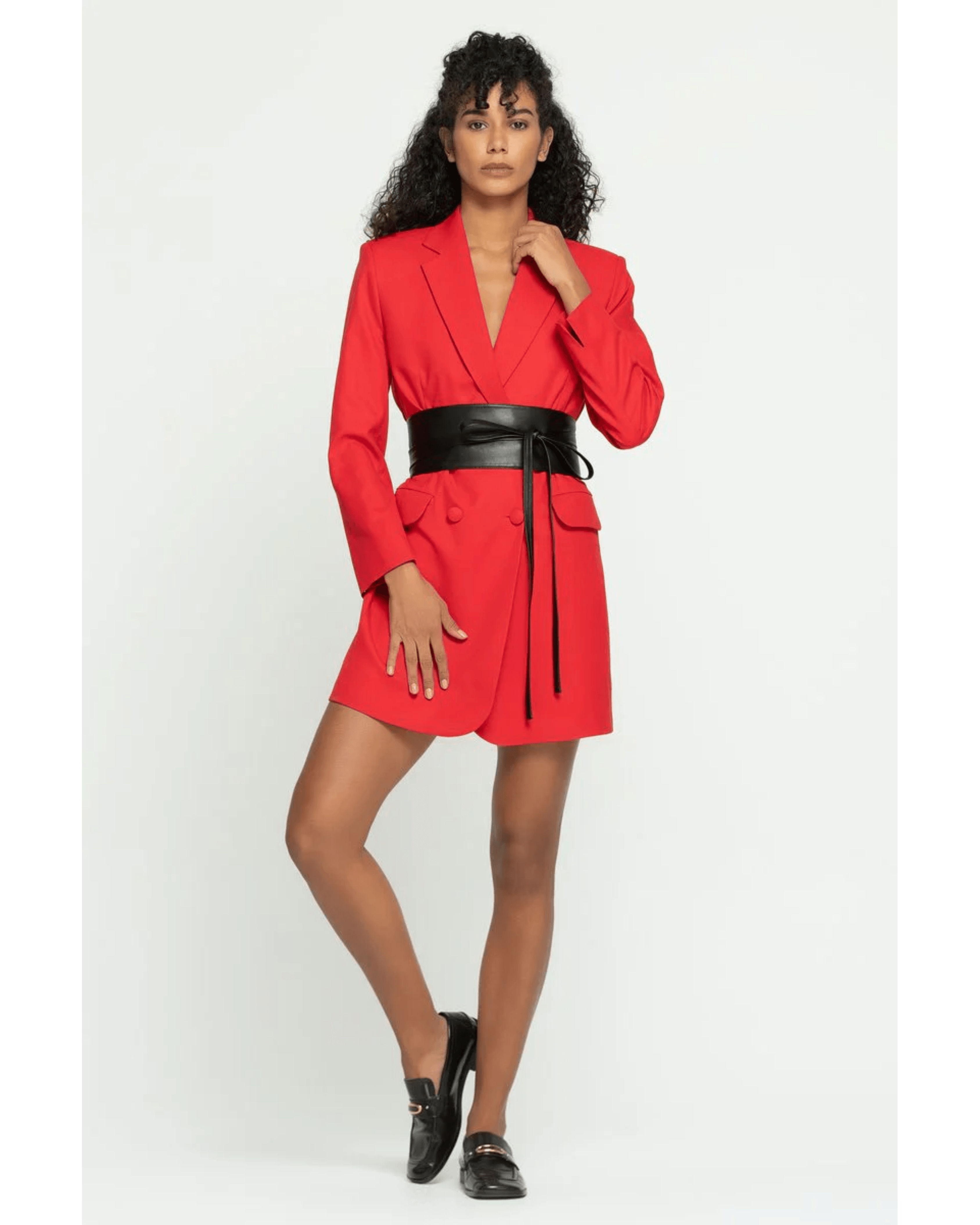 The Iconic Blazer Dress is a bold and sophisticated statement piece, featuring a striking red hue and a tailored double-breasted design. This dress effortlessly blends power dressing with modern elegance. Perfect for formal events, chic nights out, or making a lasting impression.