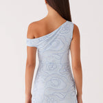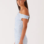 Introducing the Mountain High Mini Dress, this mini-length dress features an off-the-shoulder neckline that exudes elegance. Adorned with hot fix rhinestone details, this adds a touch of sparkle to your look.