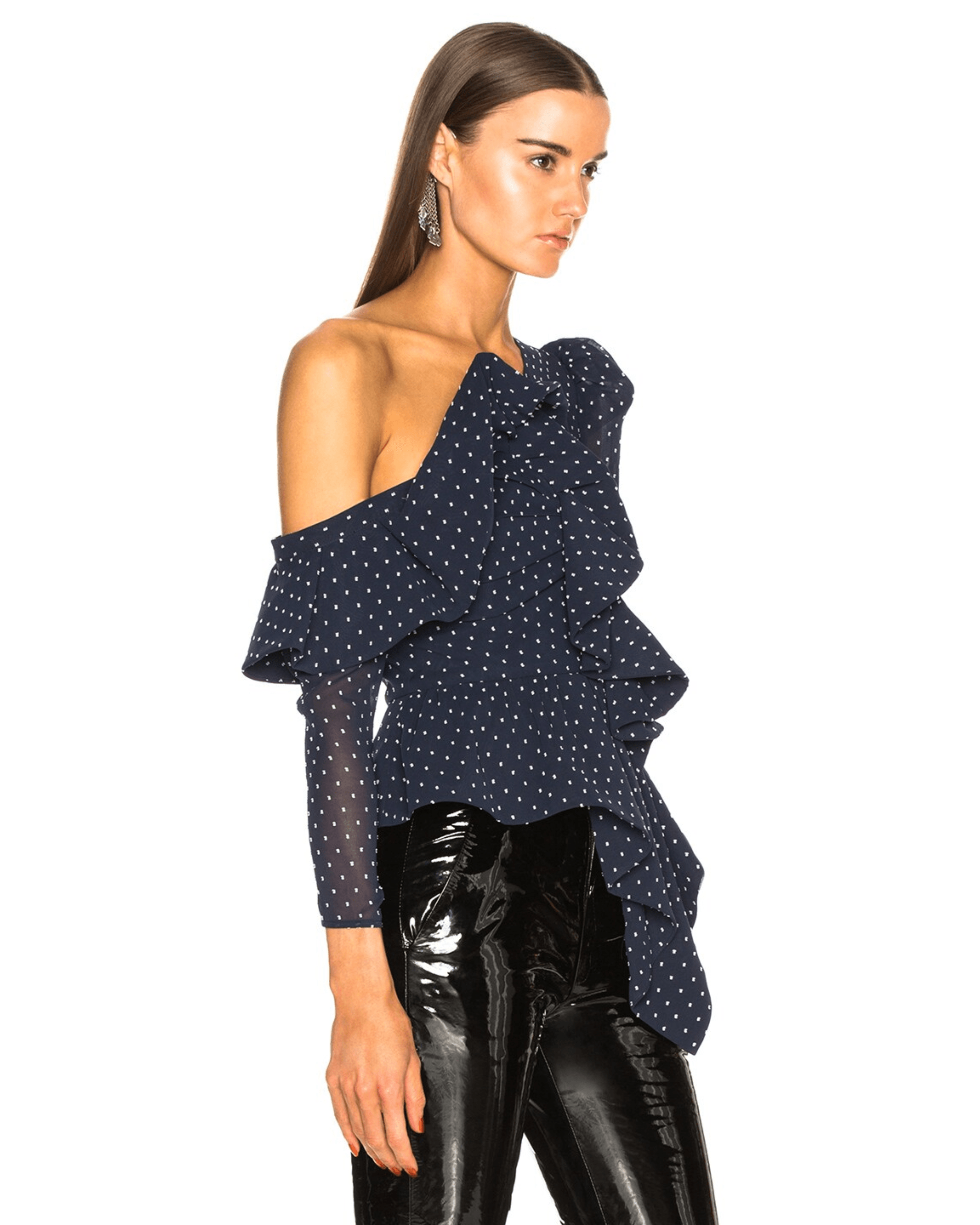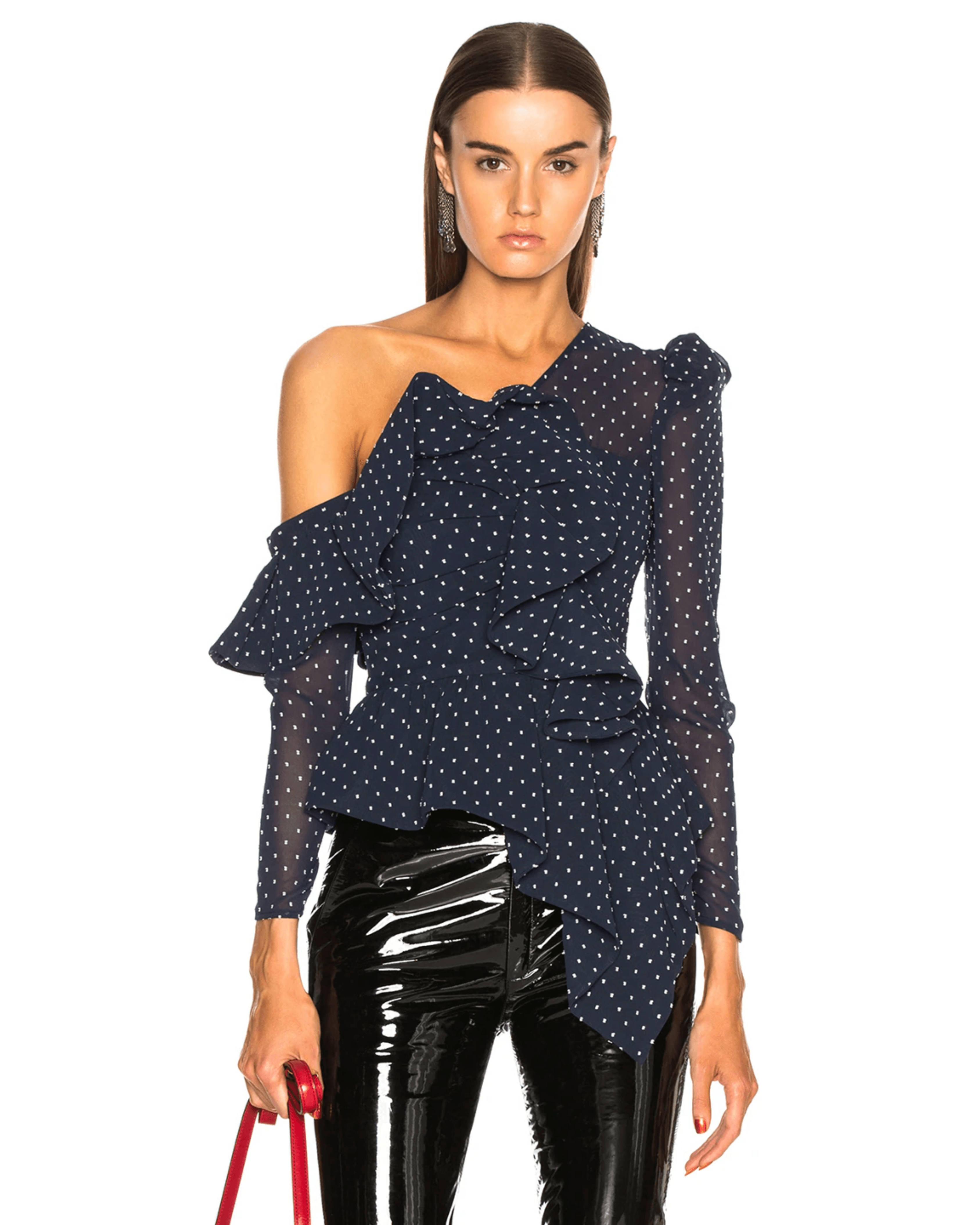 This Self-Portrait blouse is a very classy and stylish piece to wear for your next events! It is made from navy blue polyester with an all-over white polka dot print. It is defined with long sleeves, asymmetrical ruffles, and a zip closure at the back.