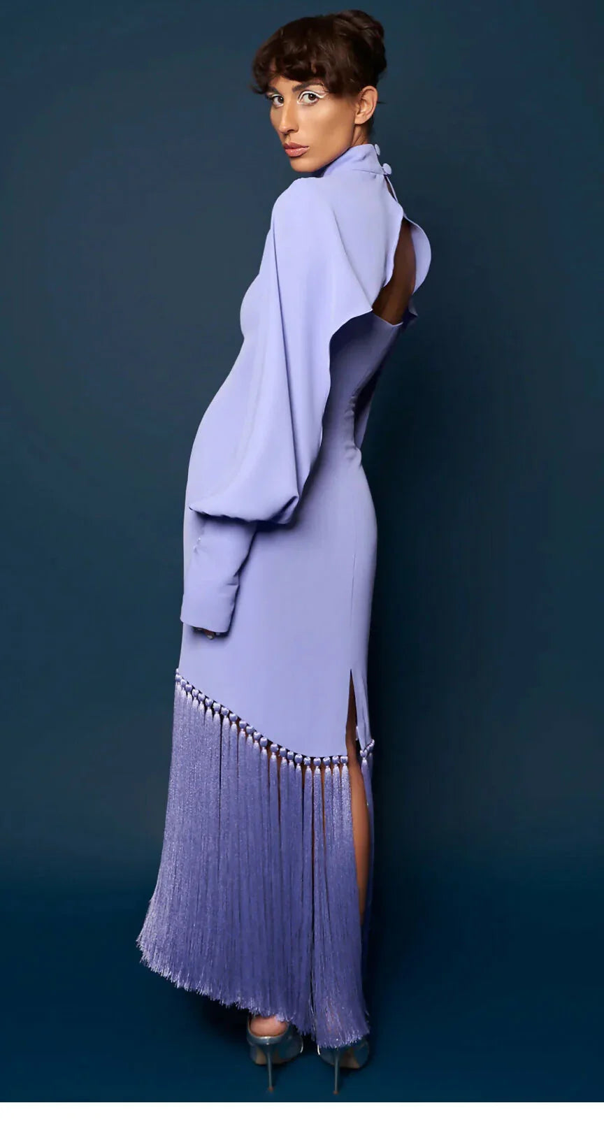 A statement gown by Nour Abdul, designed in soft lilac with sculptural cape sleeves and a sleek column silhouette. The high neckline is balanced with a subtle front cut-out, while the fitted bodice flows into a floor-length skirt finished with cascading fringe and side cutout detail. Elegant yet bold, it’s a piece made for standout moments.