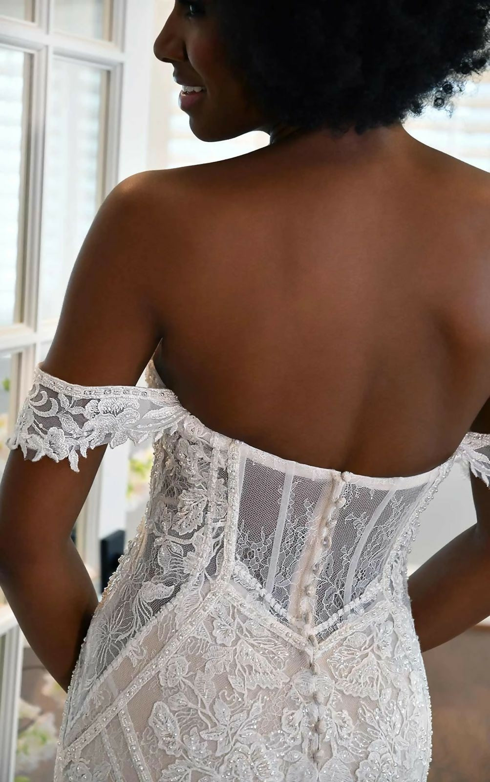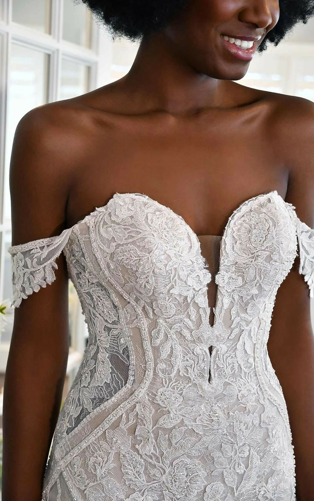 This romantic fit-and-flare gown features a plunging sweetheart neckline that cascades into detachable off-the-shoulder straps. The structured corset bodice falls to a natural waistline complete with sheer illusion cutouts that accentuate the natural curve of the body. Expertly crafted with a delicate layer of Chantilly lace, shimmering vintage-inspired lace adorns the entirety of the figure-hugging silhouette while the linear pattern creates effortless elongation. To finish, a sheer illusion back, row of fabric-covered buttons, and a scalloped train complete this sophisticated bridal look.