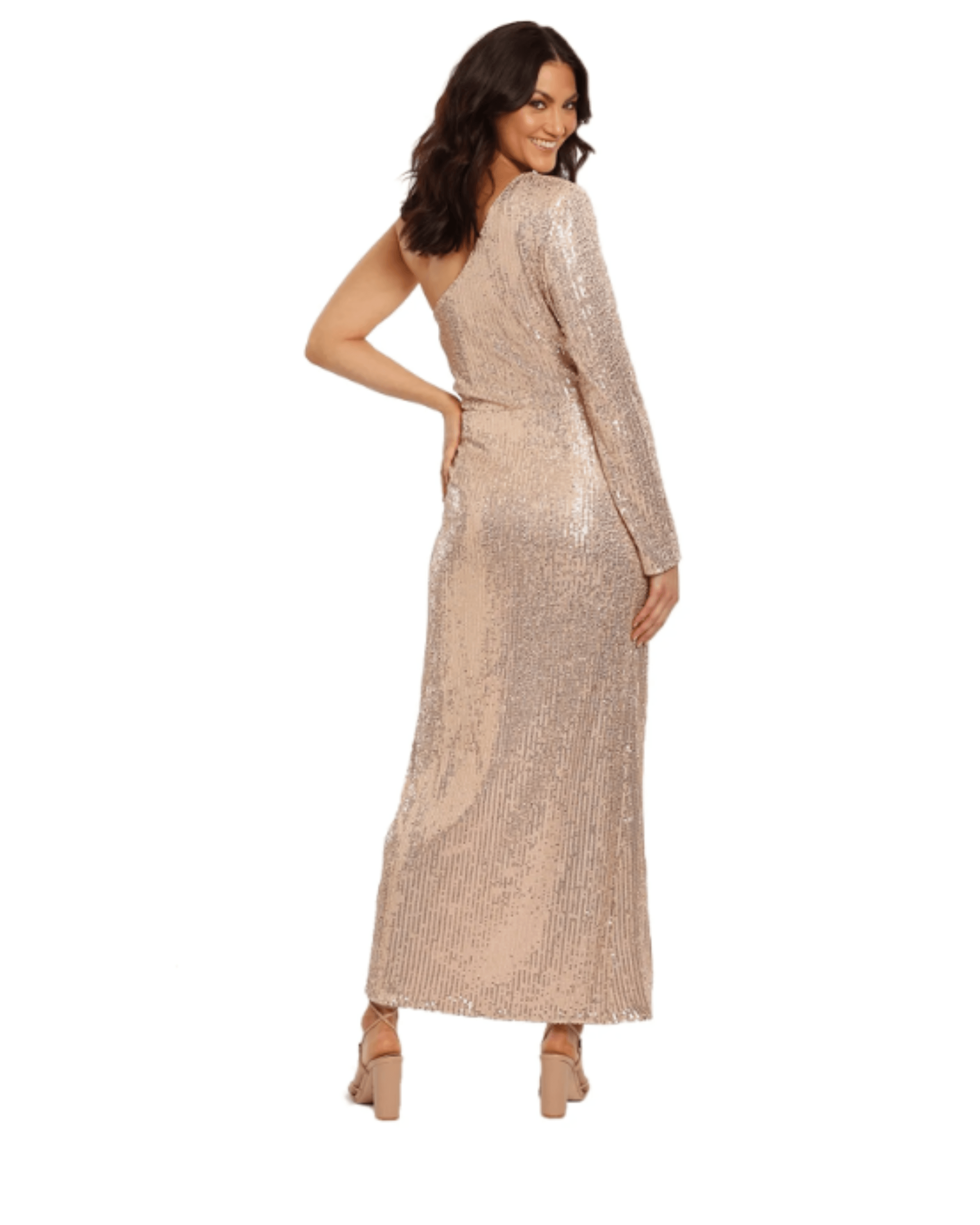 Channel old-Hollywood glamour in Simone Dress in Rose Gold by Elle Zeitoune. Featuring a one-shoulder dress adorned with sparkling goldtone sequins. Rent the dress of your dreams for your next gala.