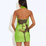 The Orisha dress takes a 90s-inspired silhouette and elevates it with a playful draped scarf detail that can be styled your way. Crafted from a semi-sheer georgette layered over a satin crepe slip, it features a signature double cowl neckline, delicate straps, and an oversized floral motif set against fresh green. A versatile mini with a bold yet romantic edge.