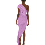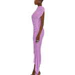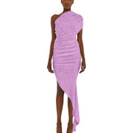 Asymmetric dress in yam. Innovative, woven material. Stretches, ruches, and drapes across your contours. Unfinished edges for a deconstructed look.